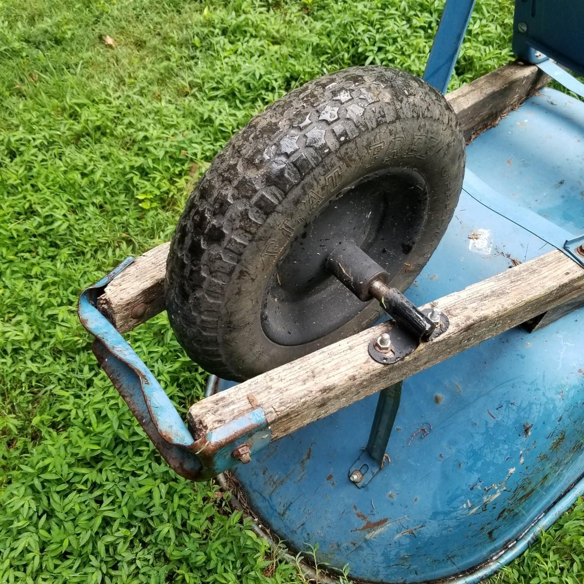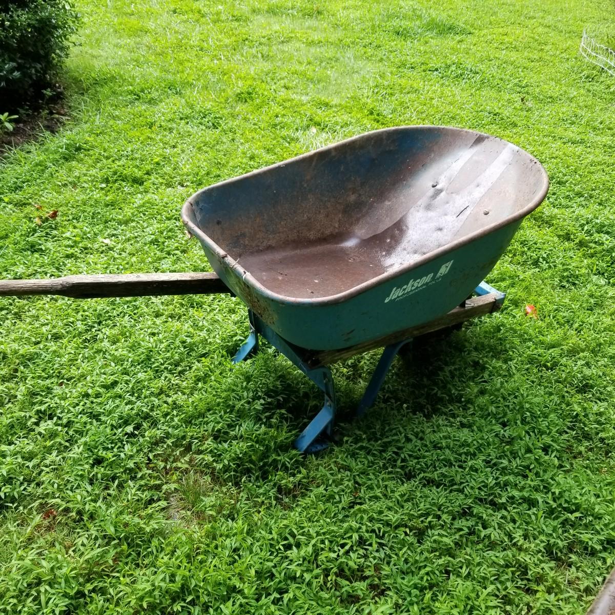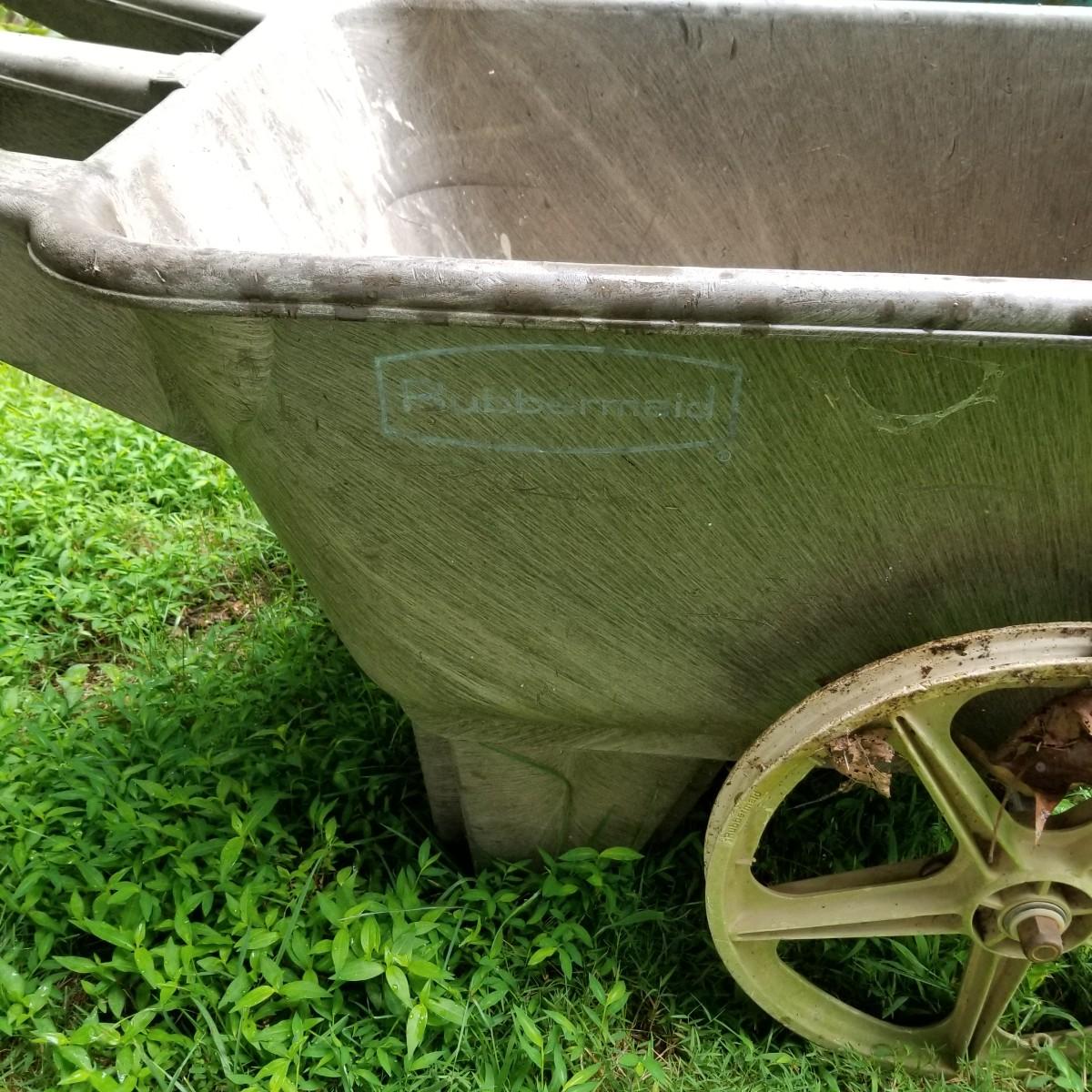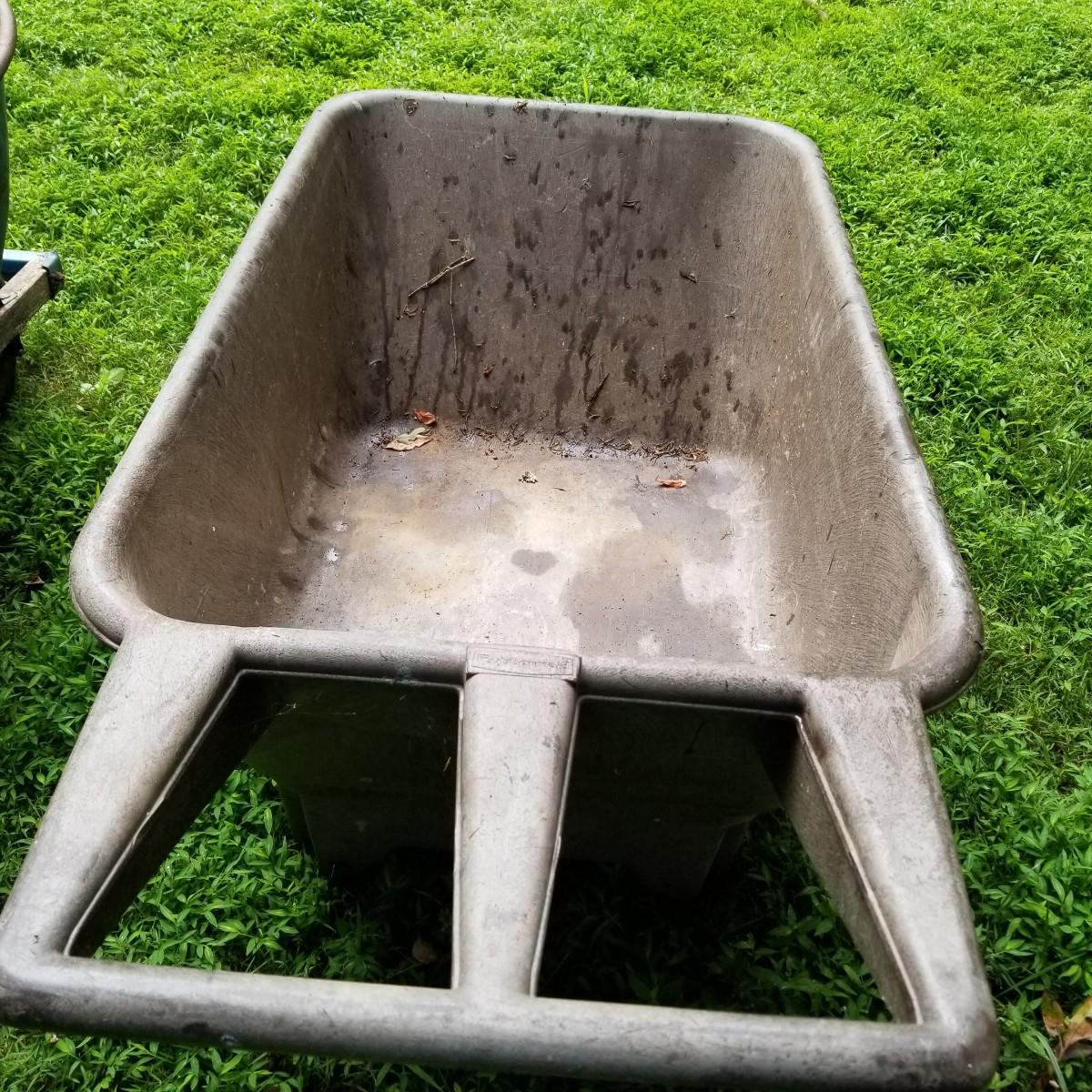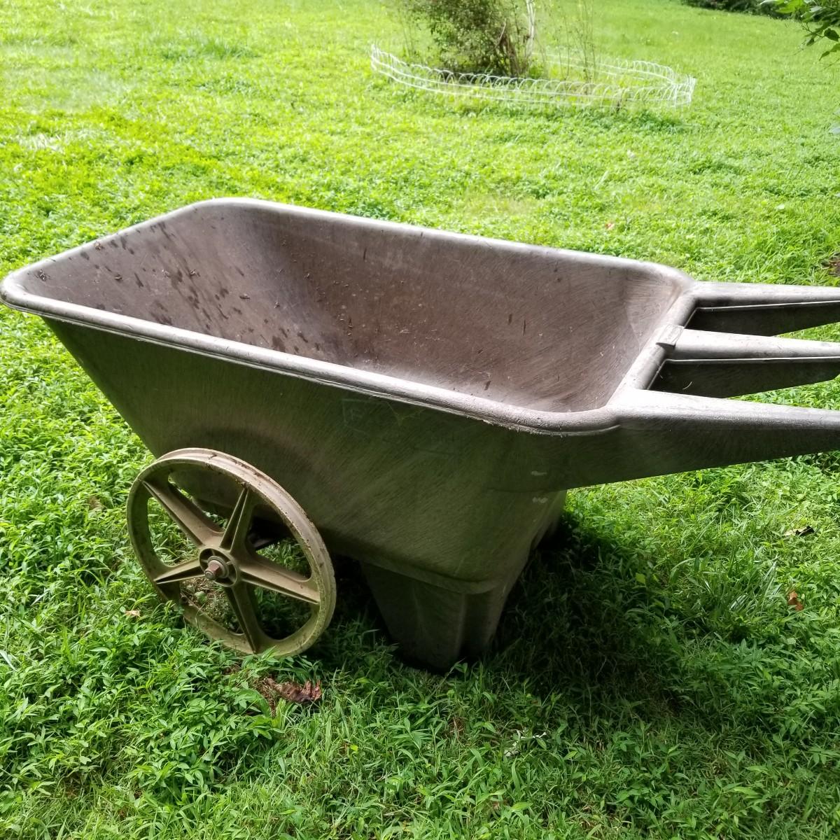 One Rubbermaid rolling yard cart and one Jackson wheelbarrow. The cart is composite resin, measures 28" x 58" x 25" and is missing its rubber tires, has rims only. The blue wheelbarrow is 25" x60" x26, has some rust and is missing one wooden handle. See photos for detail. Local pickup only.