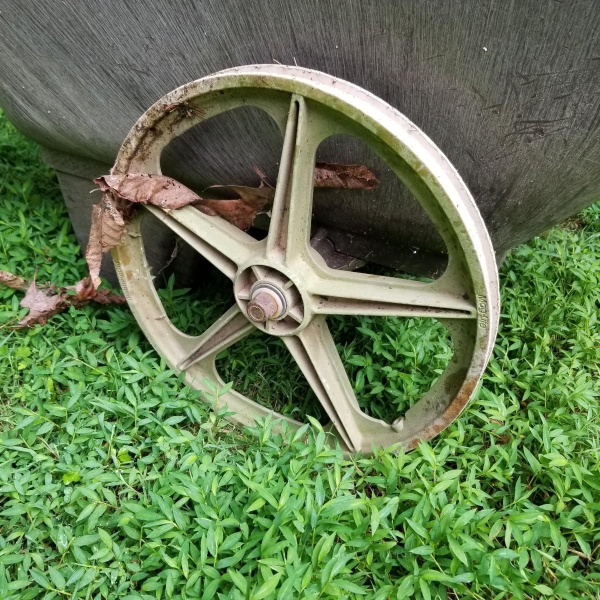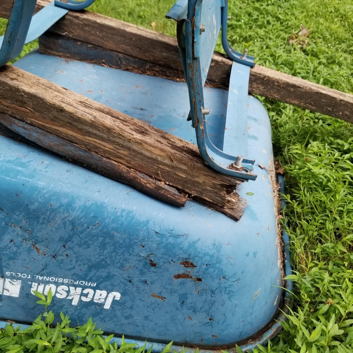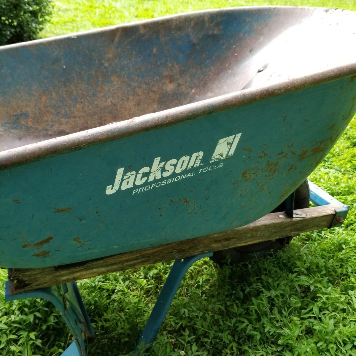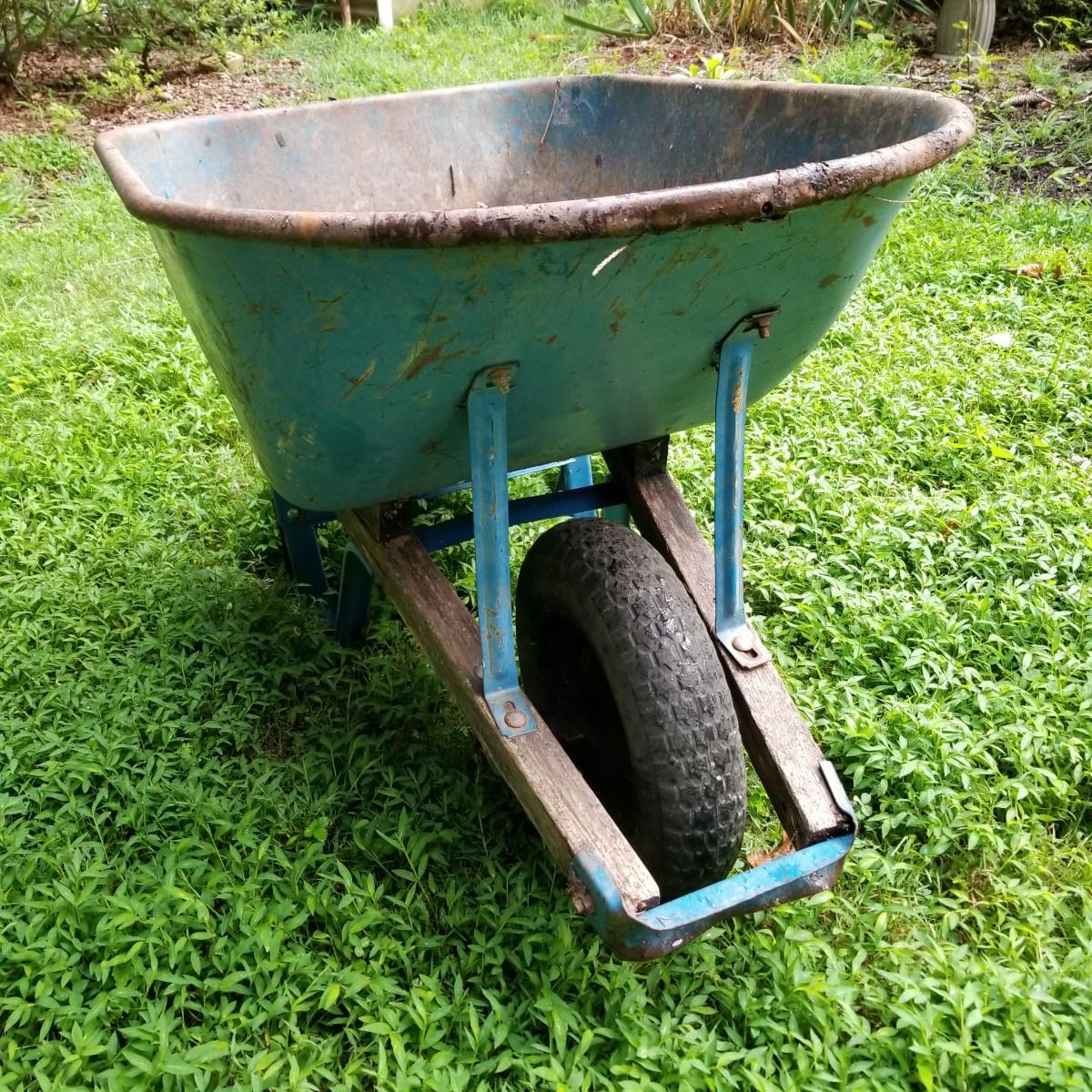 One Rubbermaid rolling yard cart and one Jackson wheelbarrow. The cart is composite resin, measures 28" x 58" x 25" and is missing its rubber tires, has rims only. The blue wheelbarrow is 25" x60" x26, has some rust and is missing one wooden handle. See photos for detail. Local pickup only.