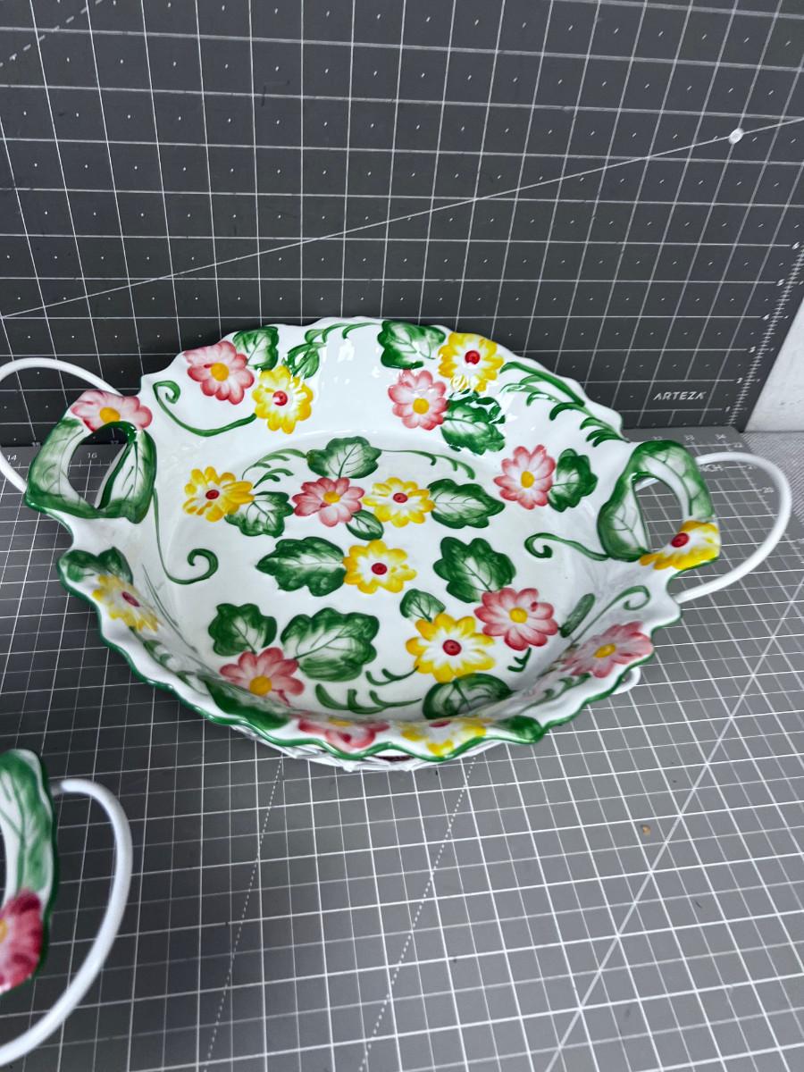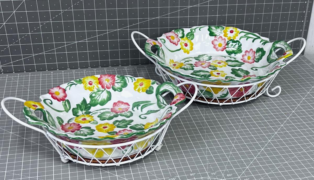 2 Yellow & Orange Floral TEMPTATION Serving With White Wire Cradles