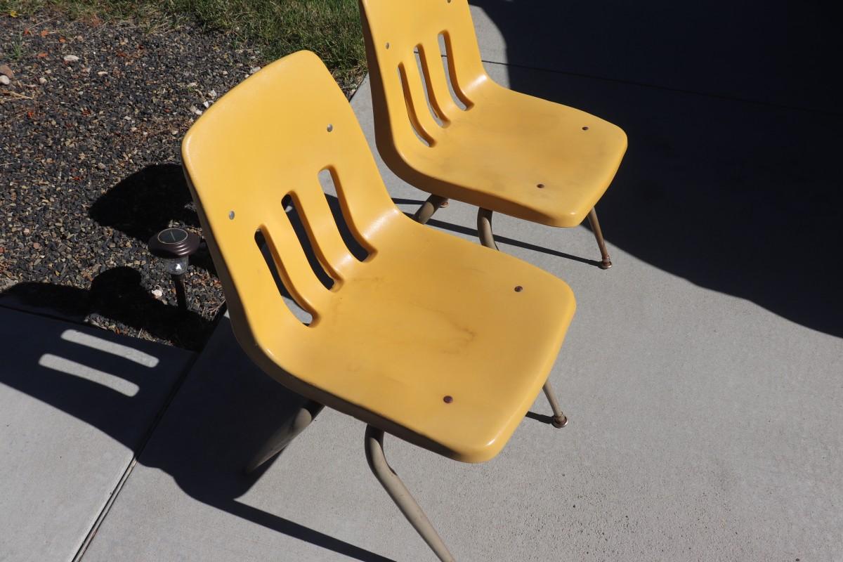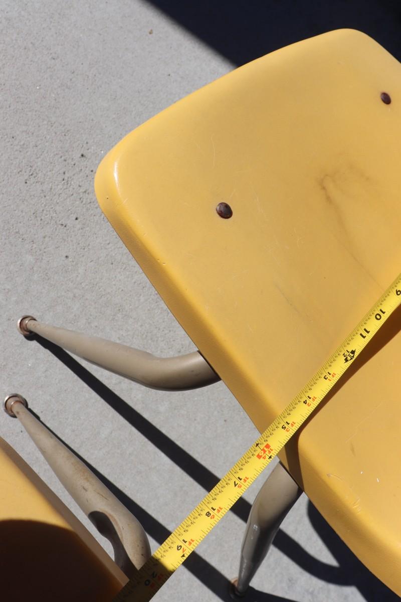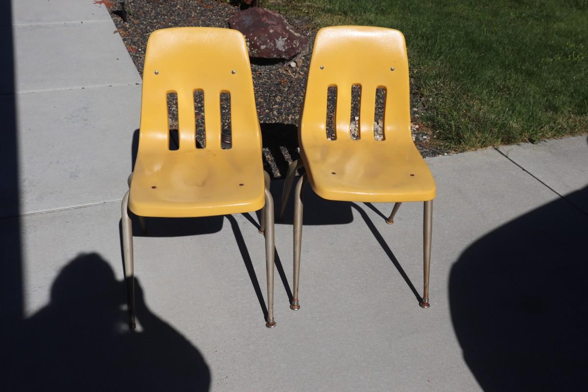 A set of cheerful yellow chairs for school-aged children, perfect for creating a fun and inviting space for 116. 2 Yellow School-Aged Chairs: A set of cheerful yellow chairs designed for school-aged children, perfect for creating a fun and inviting space for homework, crafts, or playtime.