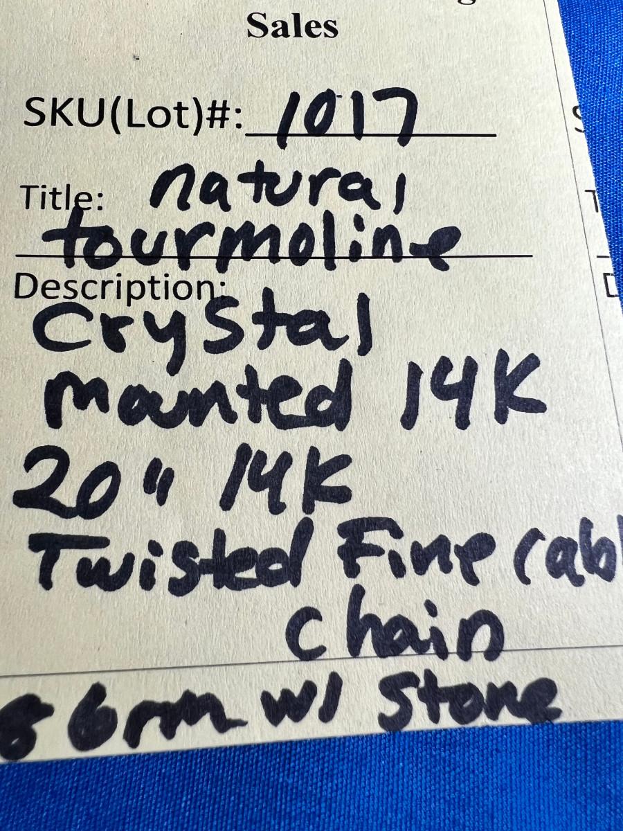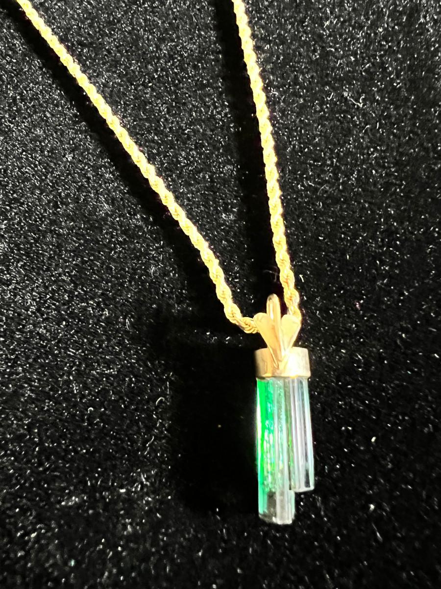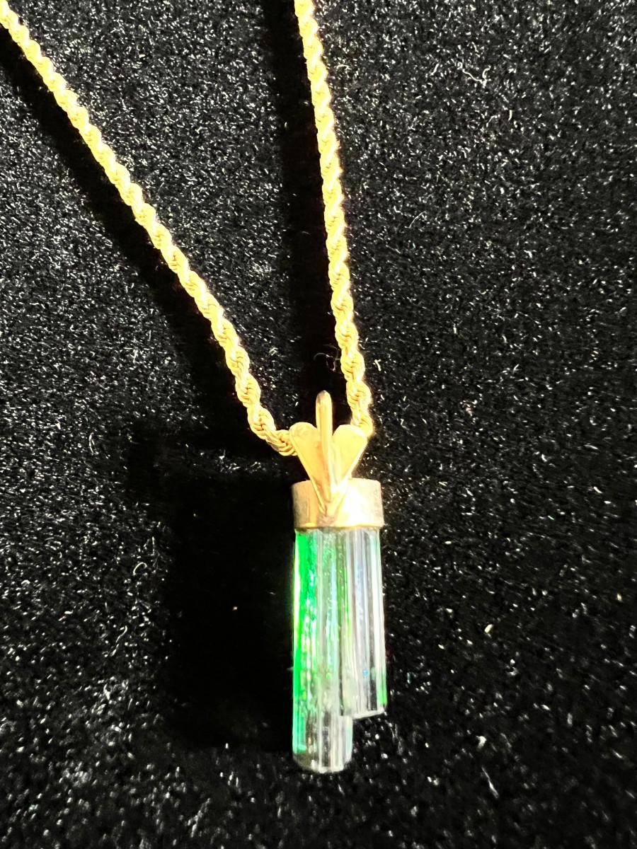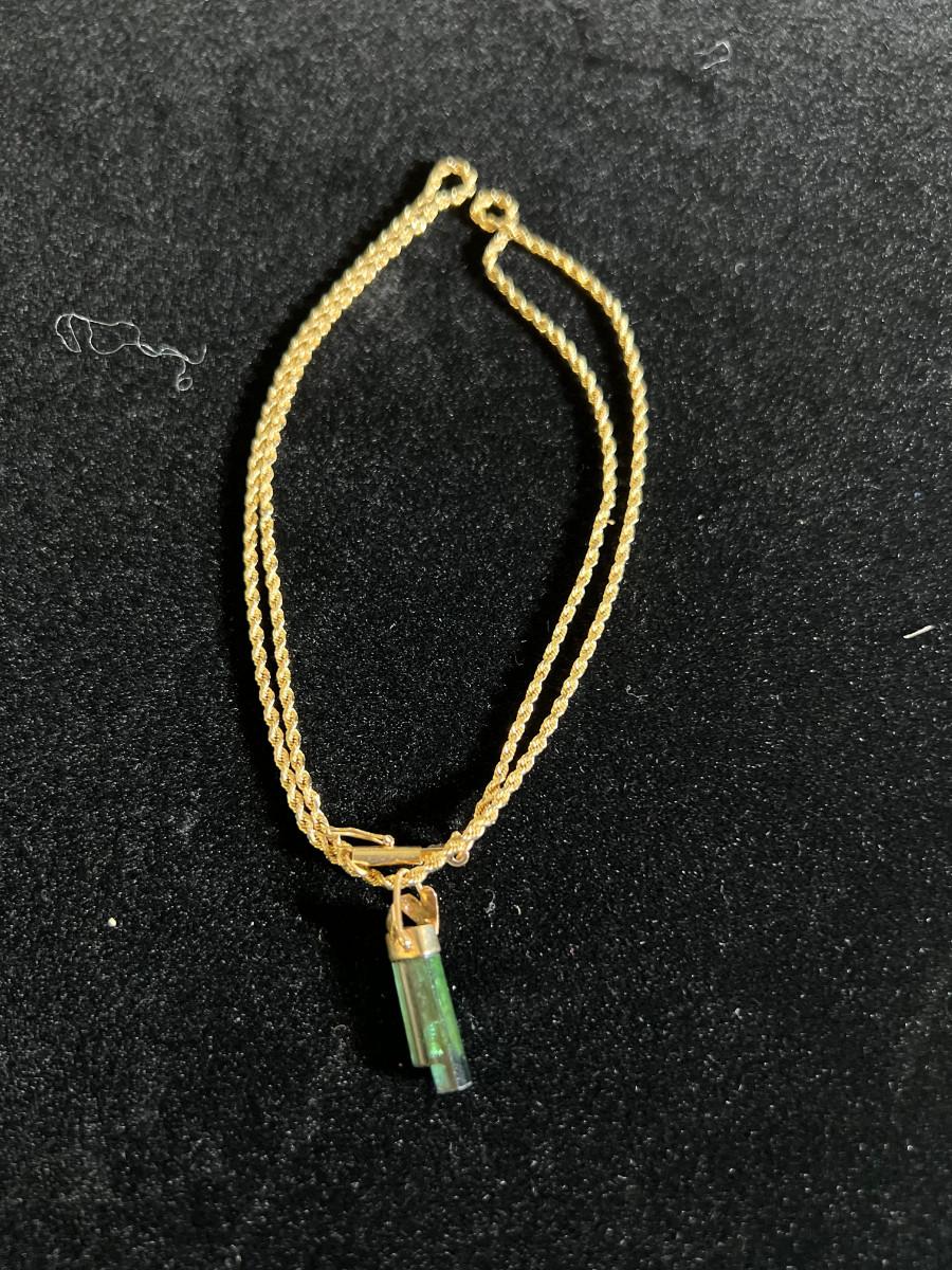 20" 14 K gold rope chain with natural turmoline pendant with gold heart