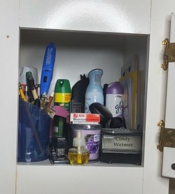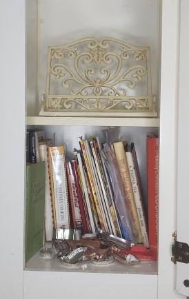 Cookbooks, a very nice cookbook holder, and cleaning items.