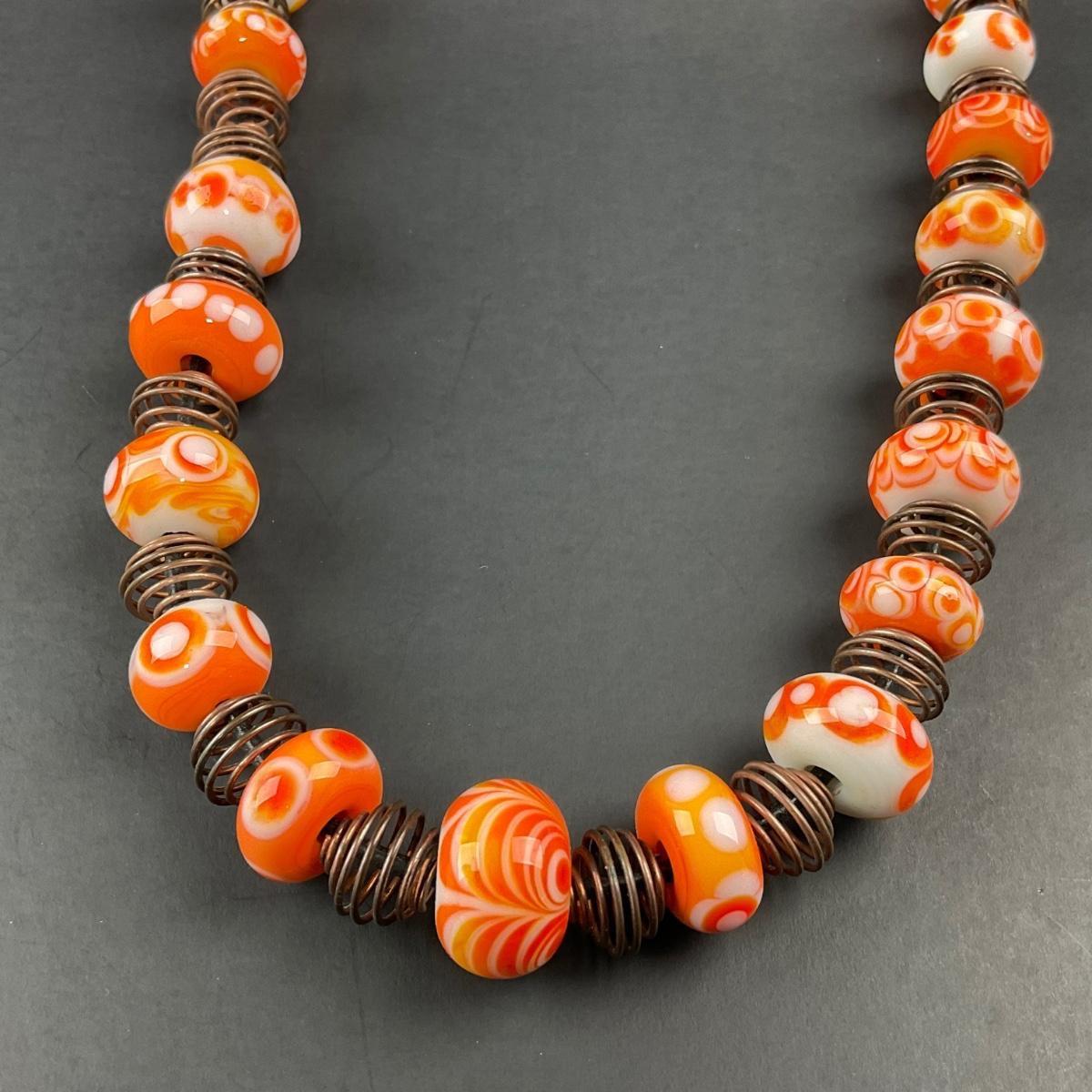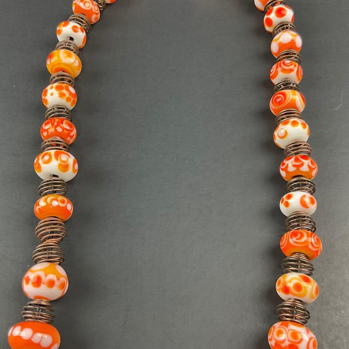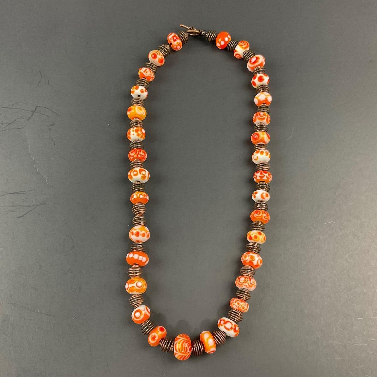 -20- ARTISAN | Orange, White, Red, Dot Donut Glass Bead & Copper Art Necklace