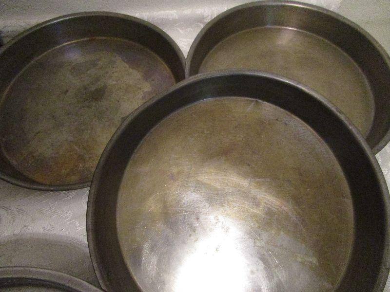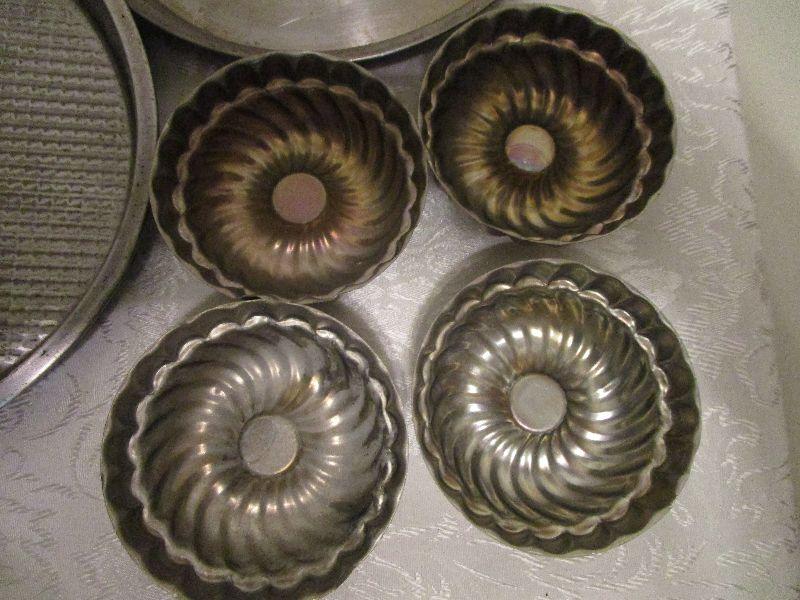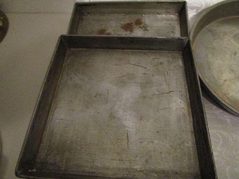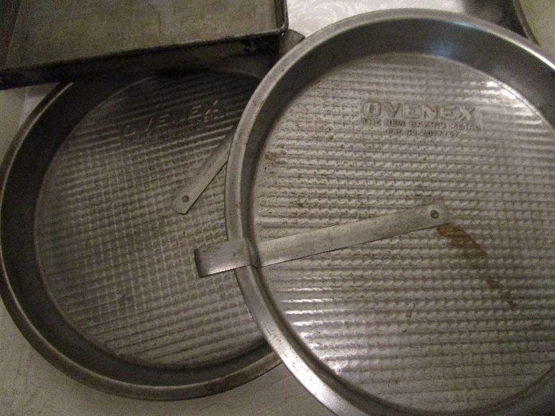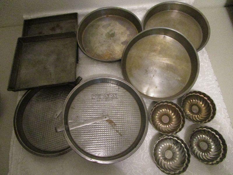 2- 8"x8" square pans, 2-Ovenex 9" cake pans with side release and textured waffled design; 3- 9" cake pans; 4-metal Jello molds