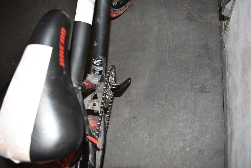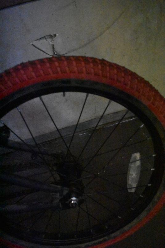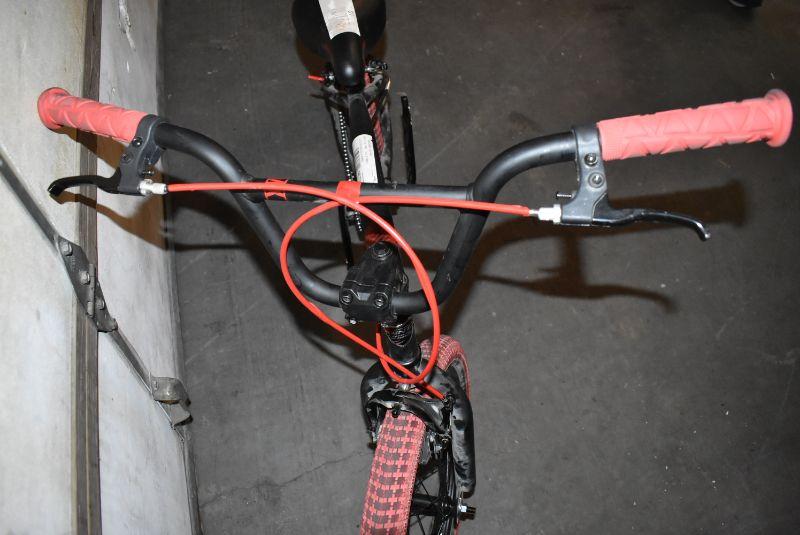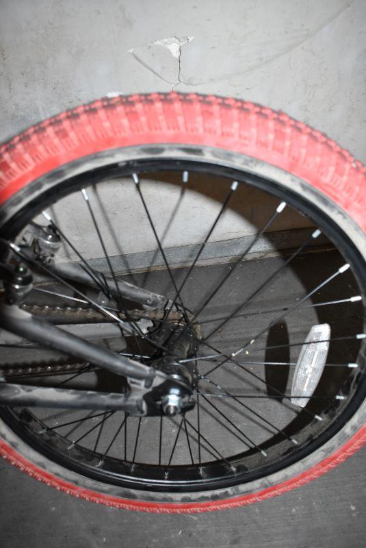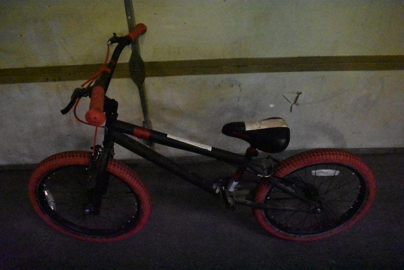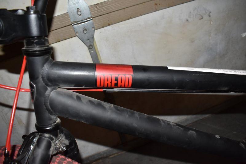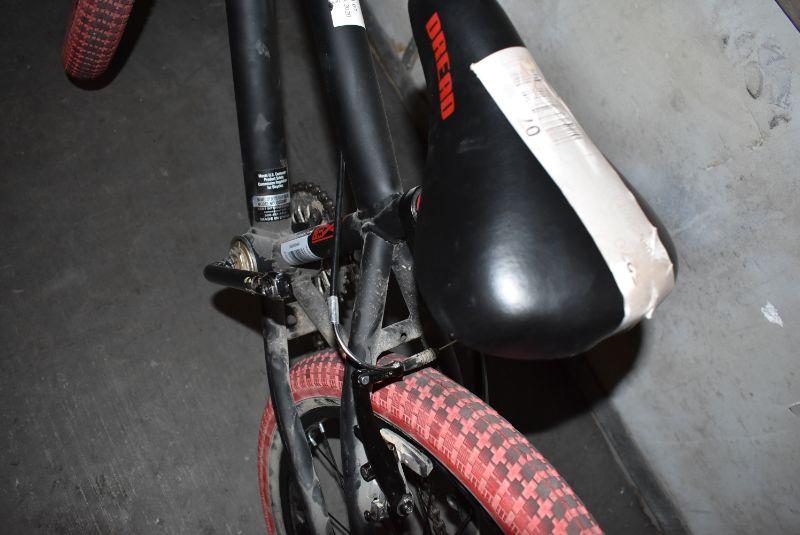 20" Black & Red "Dread" Bike. Back Rim is warped and missing a spoke. No Pedals