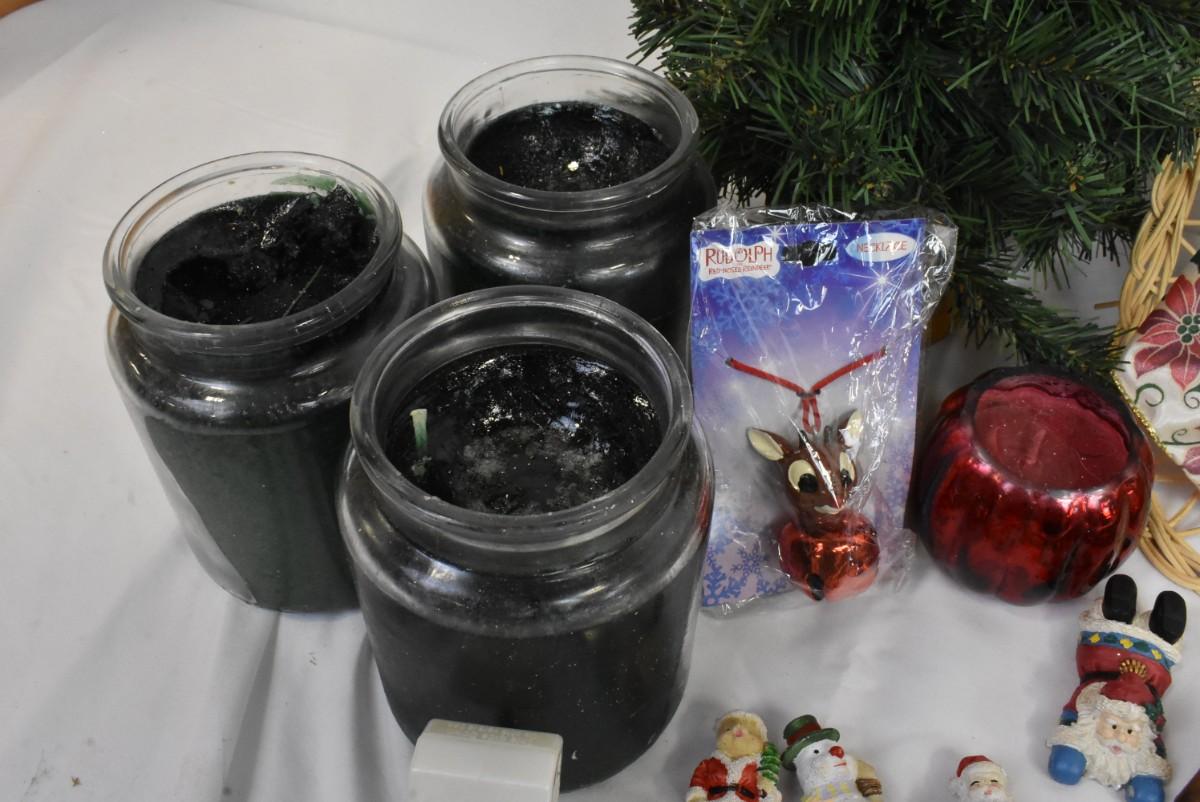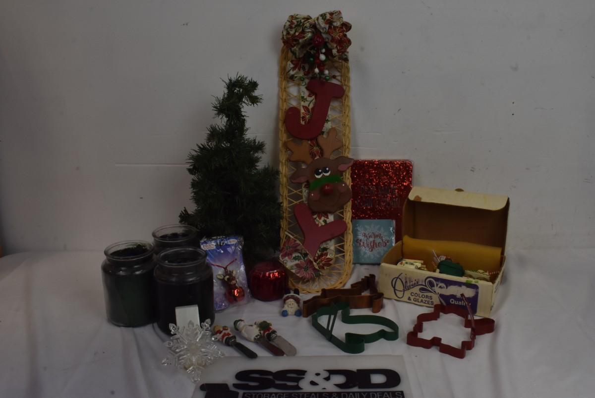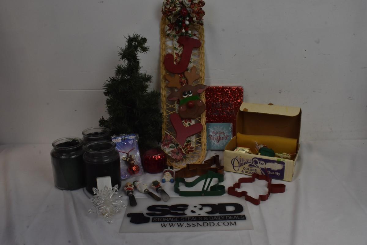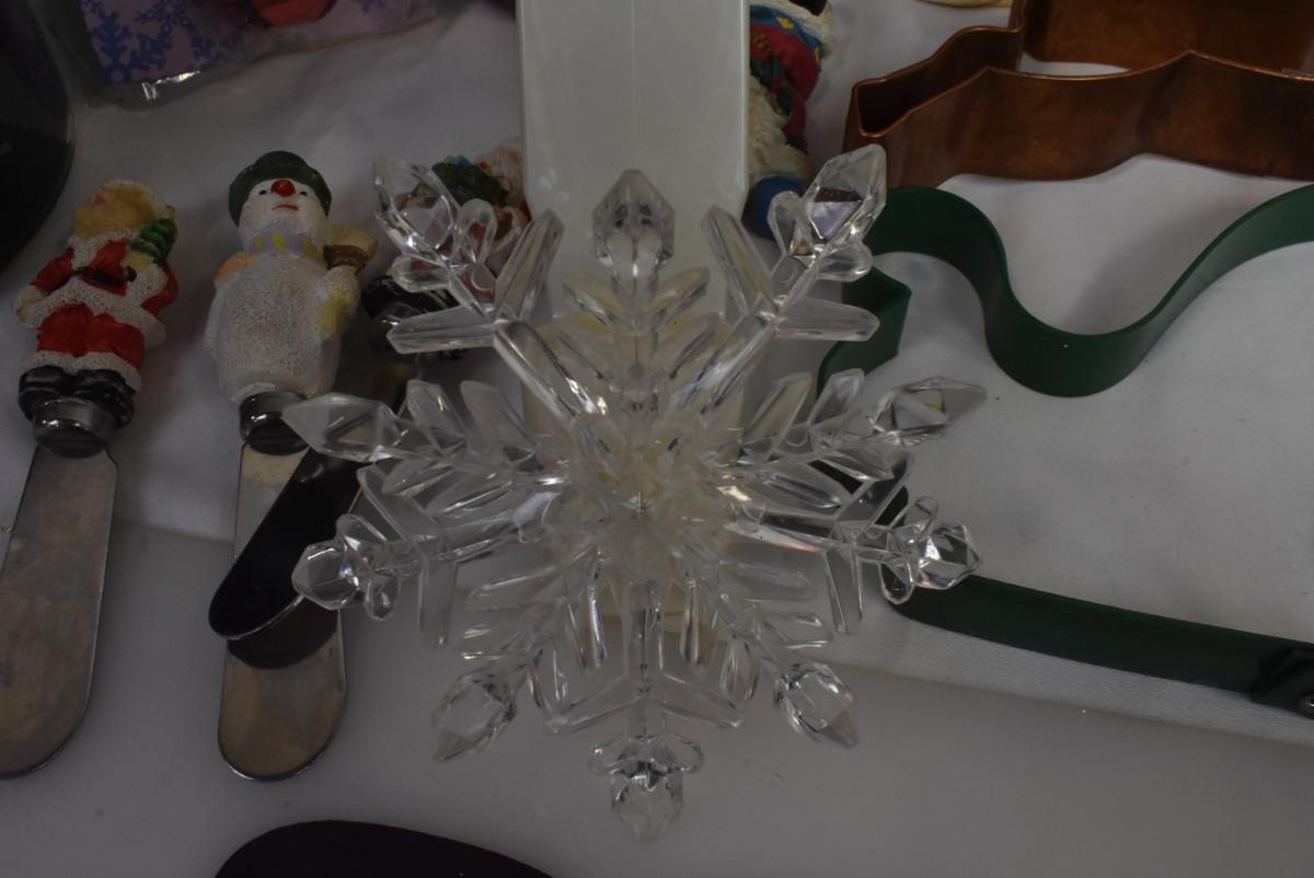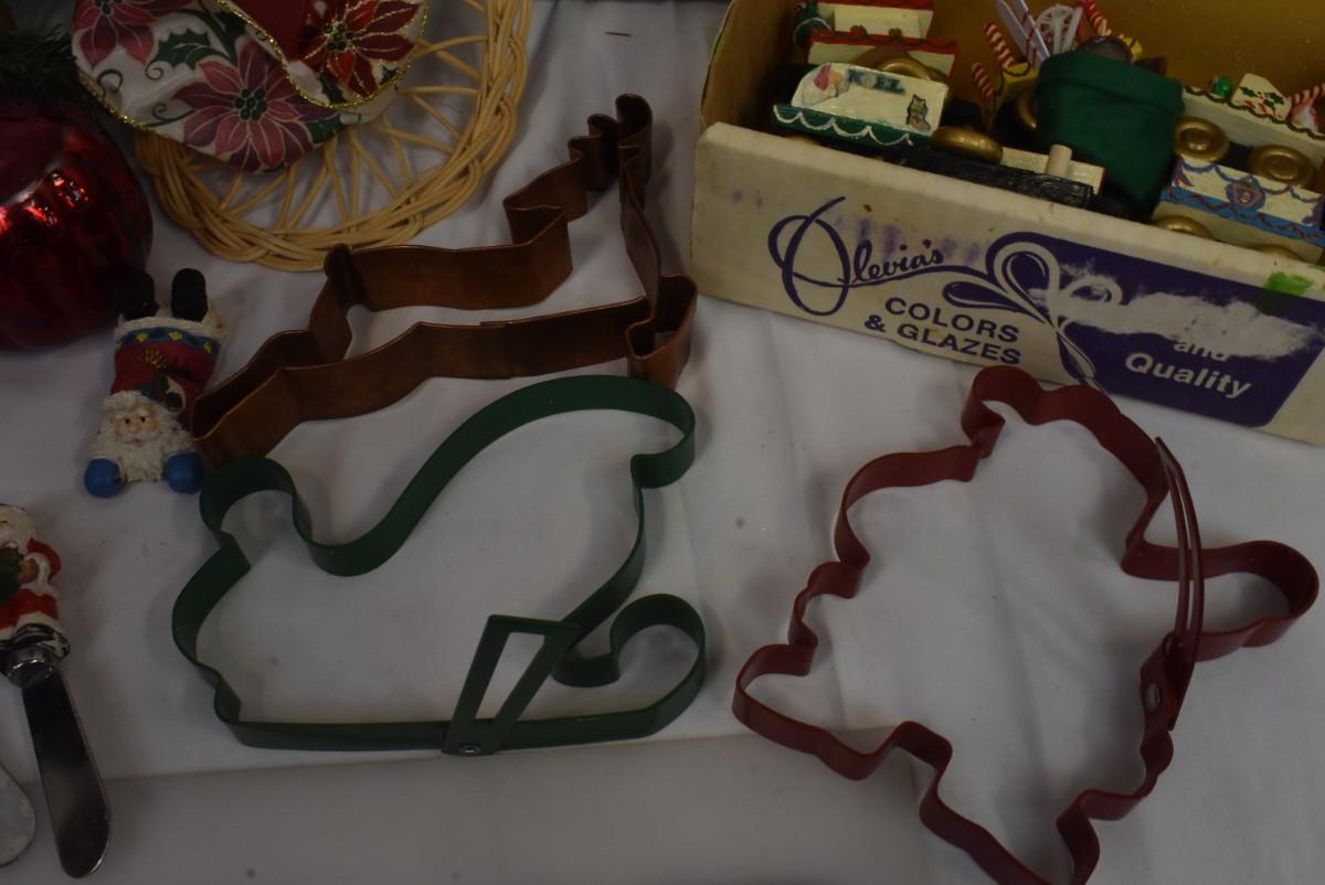 20+ Christmas lot: Pancake cutters, small tree, 3 jar candles, 7 pc train set, cheese spreaders, snowflake night light