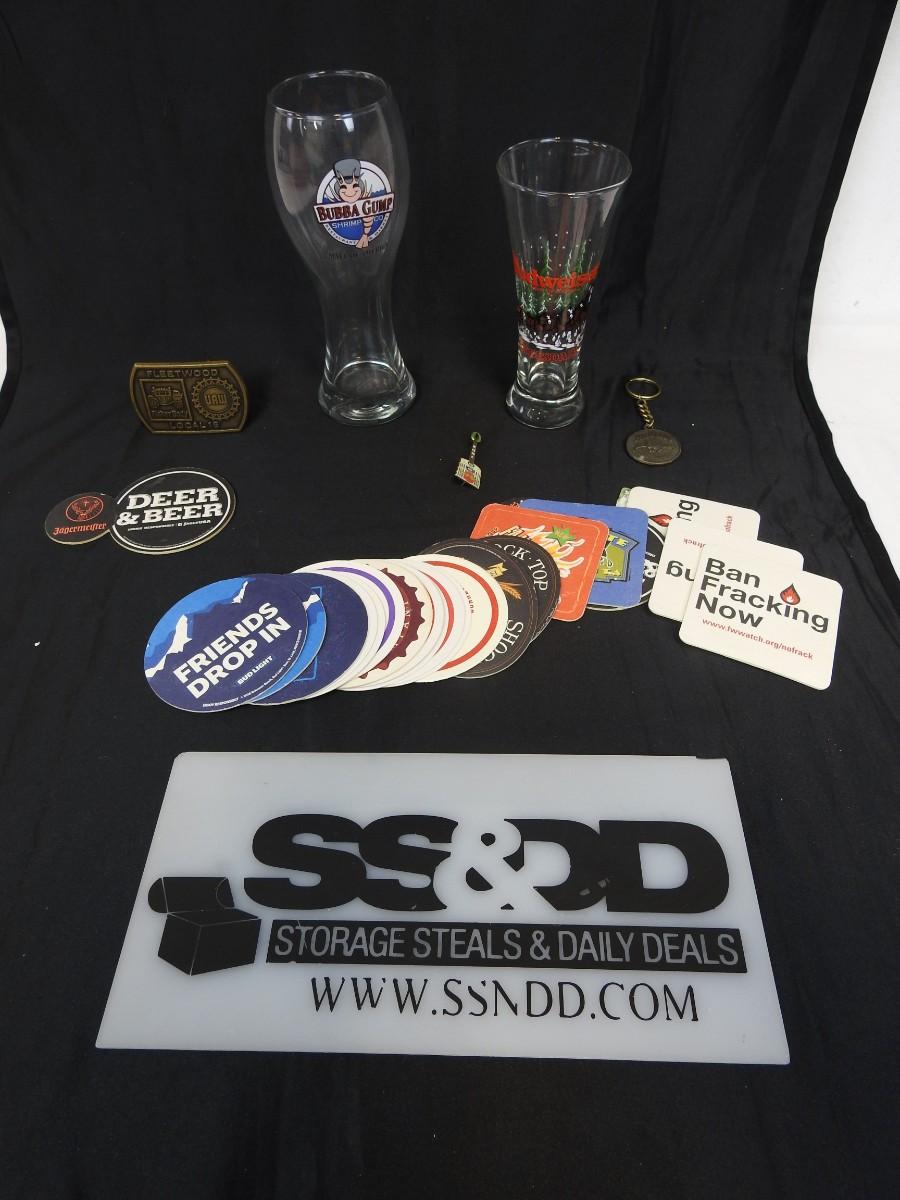 20+ Coasters, 2 Beer Glasses, Hard Rock Cafe Pin, Jim Bean Key Chain and More