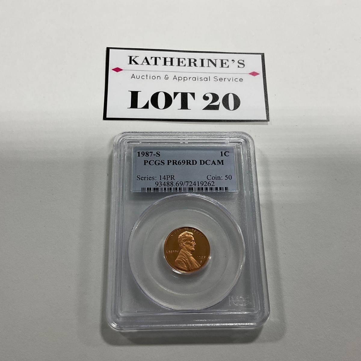 One 1987-S Lincoln Cent PCGS PR69RD DCAM graded coin. Please see photos for details and condition. ::: Shipping is available on this lot. If you require shipping you must let us know at the close of the auction. We will coordinate with you after the item has been won. Shipping fees will include insurance up to or exceeding the value of all items being mailed. If you have any questions regarding this lot please contact the auctioneer either via this website, by direct email or by phone. PICK UP TIMES and other important information can be found in the TERMS and DESCRIPTION of the auction. Please take a look for pertinent information. Thanks!