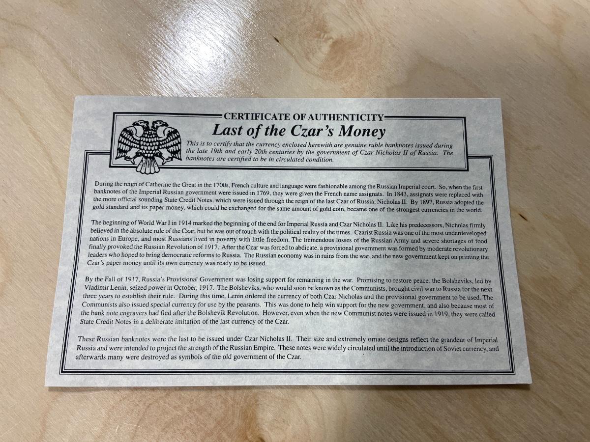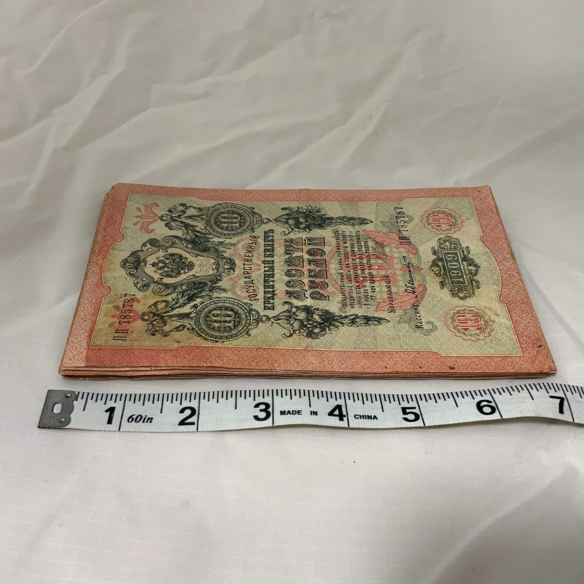From the Estate of Peter Radovanovich: Sixteen Notes of Russian Currency dated 1909, all 10 Rubles. In various states of condition and circulation. Comes with Copy of Certificate of Authenticity. Please see photos for details and condition. ::: Shipping is available on this lot. If you require shipping you must let us know at the close of the auction. We will coordinate with you after the item has been won. Shipping fees will include insurance up to or exceeding the value of all items being mailed. If you have any questions regarding this lot please contact the auctioneer either via this website, by direct email or by phone. PICK UP TIMES and other important information can be found in the TERMS and DESCRIPTION of the auction. Please take a look for pertinent information. Thanks!