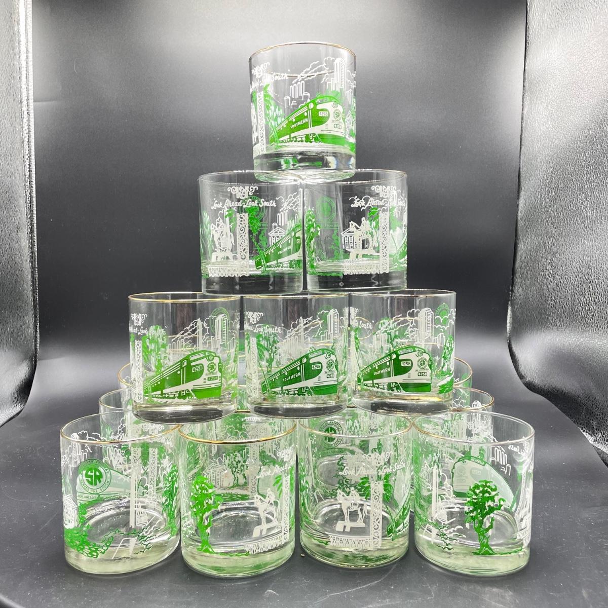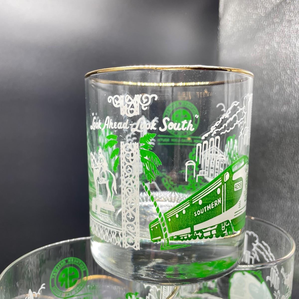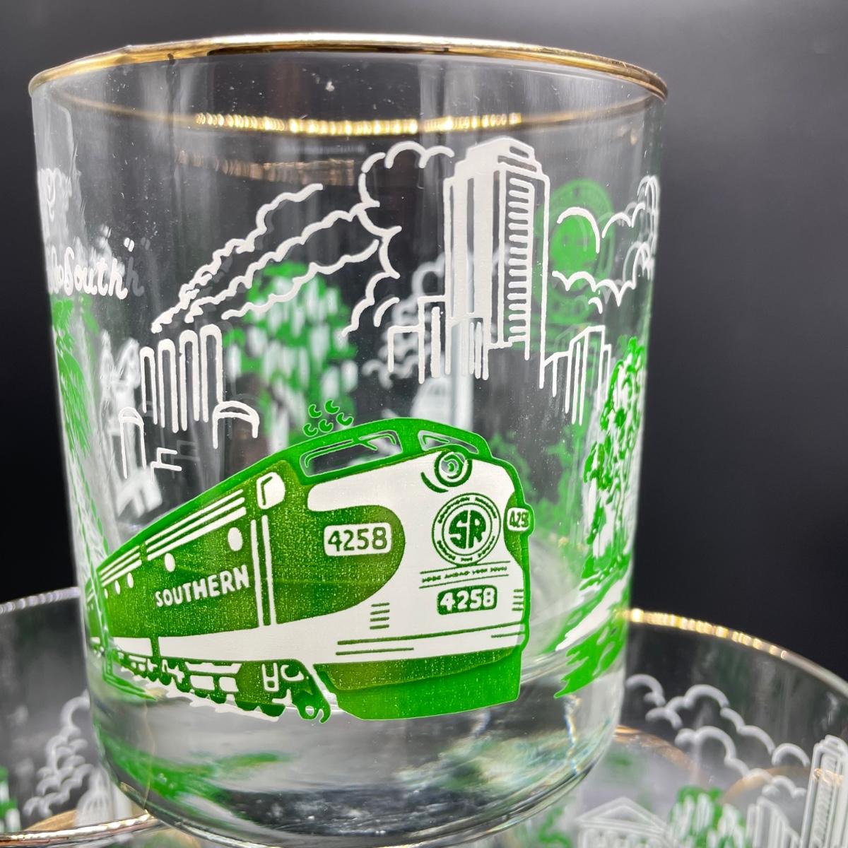 Twenty Southern Railway 3.5” tall Highball glasses in amazing shape. About 2/3rds of the glasses have very nice golden rims, the others show just a bit of wear, all the glasses have bold green and white designs in great shape. See images. Shipping available.