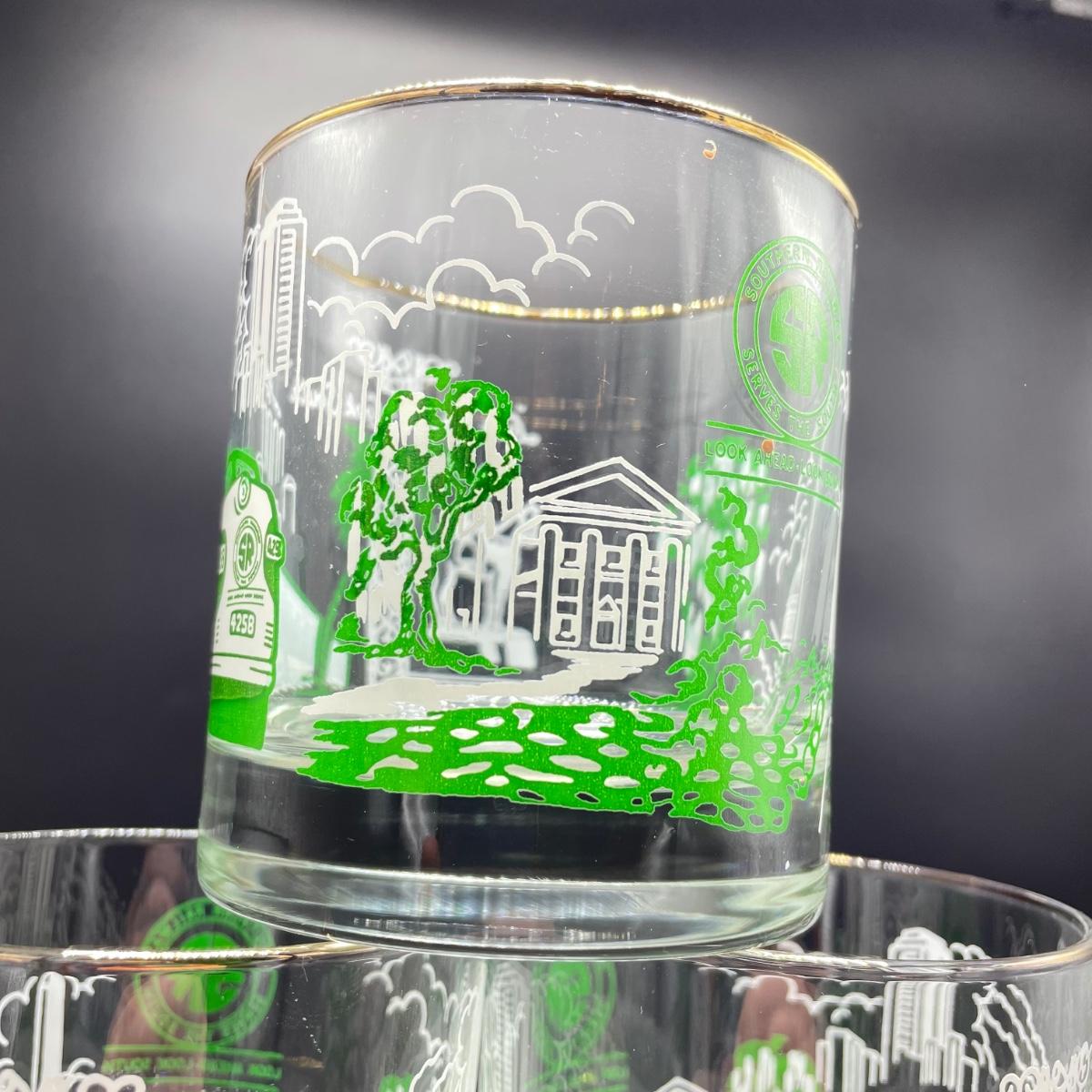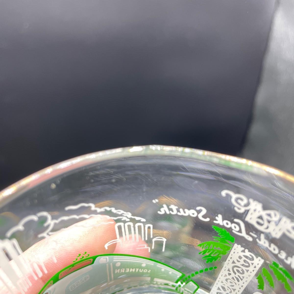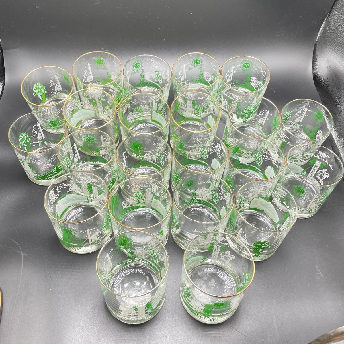 Twenty Southern Railway 3.5” tall Highball glasses in amazing shape. About 2/3rds of the glasses have very nice golden rims, the others show just a bit of wear, all the glasses have bold green and white designs in great shape. See images. Shipping available.
