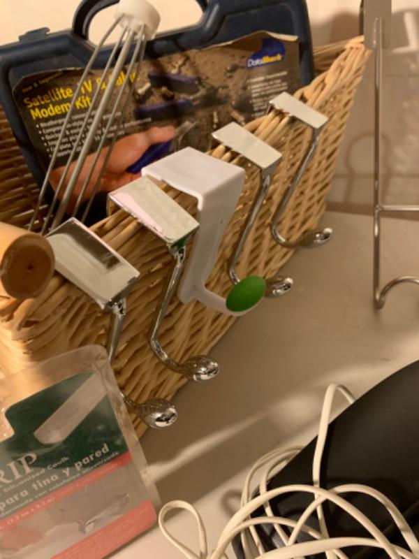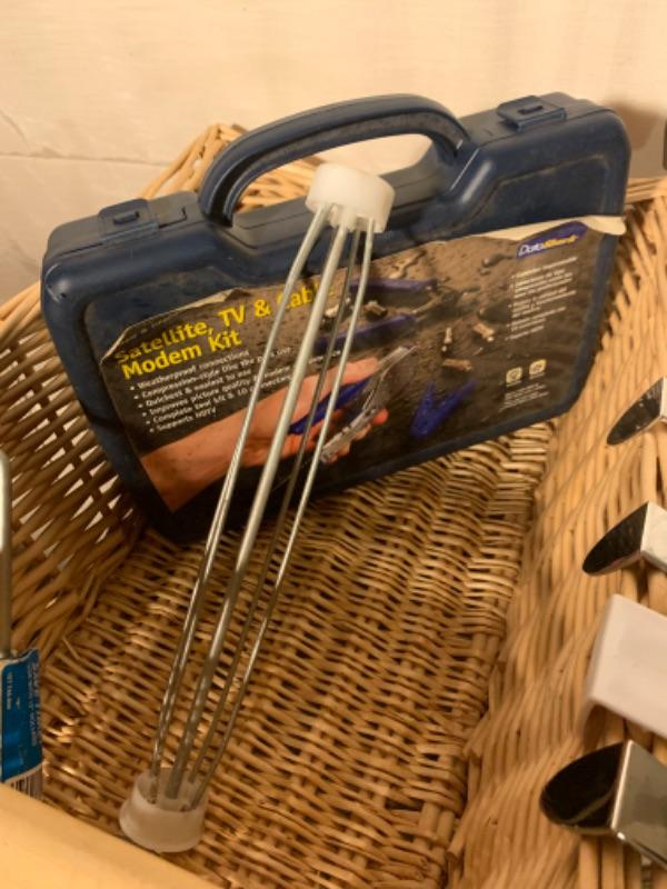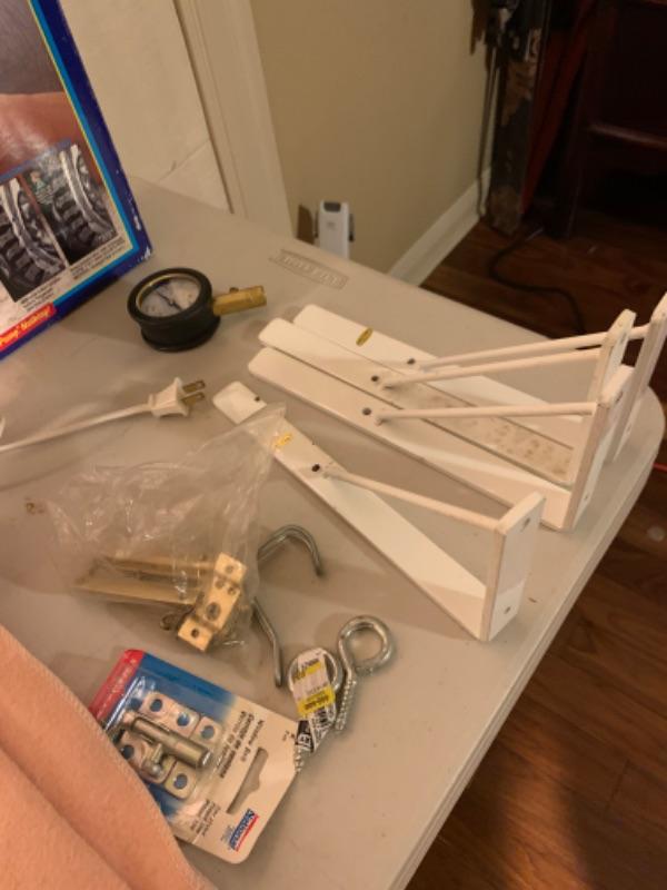 Lot of Closet, Shelving and Bedroom Items. Included in Lot: Princess phone, neck pillow, heating pad, cable tool kit, shelving brackets, door hangers, door knob, caulkstrip, paint roller.