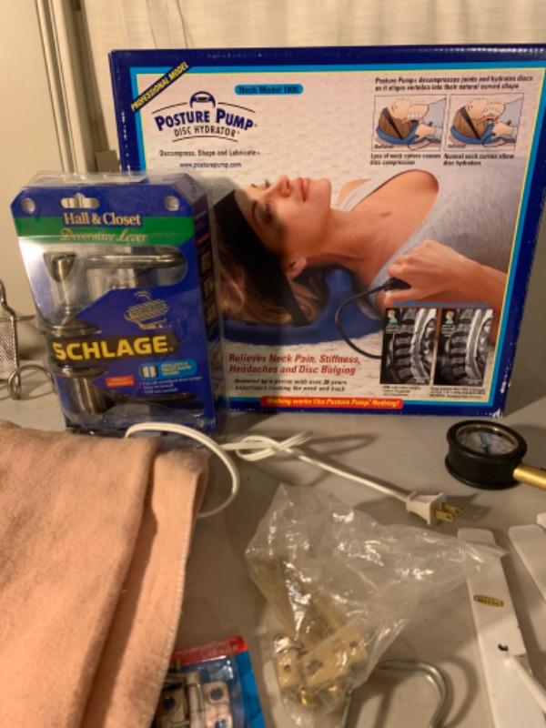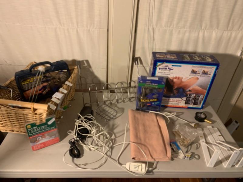 Lot of Closet, Shelving and Bedroom Items. Included in Lot: Princess phone, neck pillow, heating pad, cable tool kit, shelving brackets, door hangers, door knob, caulkstrip, paint roller. Was $25