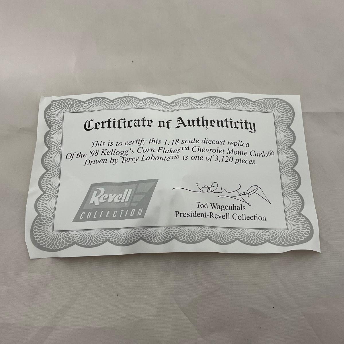 One NASCAR die cast 1:18 scale 1998 Kelloggs Corn Flakes Chevrolet Monte Carlo figure. Terry Labonte. Comes with a Certificate of Authenticity. Please see photos for details and condition. ::: Shipping is available on this lot. If you require shipping you must let us know at the close of the auction. We will coordinate with you after the item has been won. Shipping fees will include insurance up to or exceeding the value of all items being mailed. If you have any questions regarding this lot please contact the auctioneer either via this website, by direct email or by phone. PICK UP TIMES and other important information can be found in the TERMS and DESCRIPTION of the auction. Please take a look for pertinent information. Thanks!