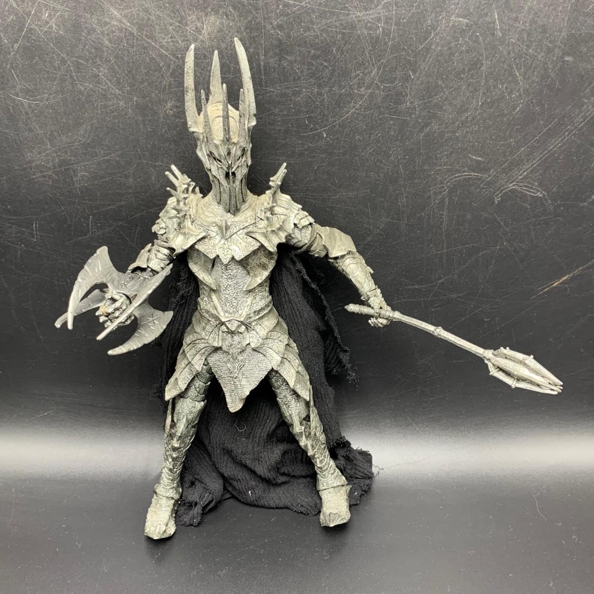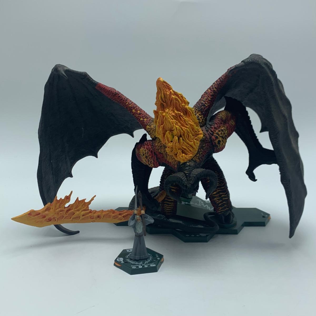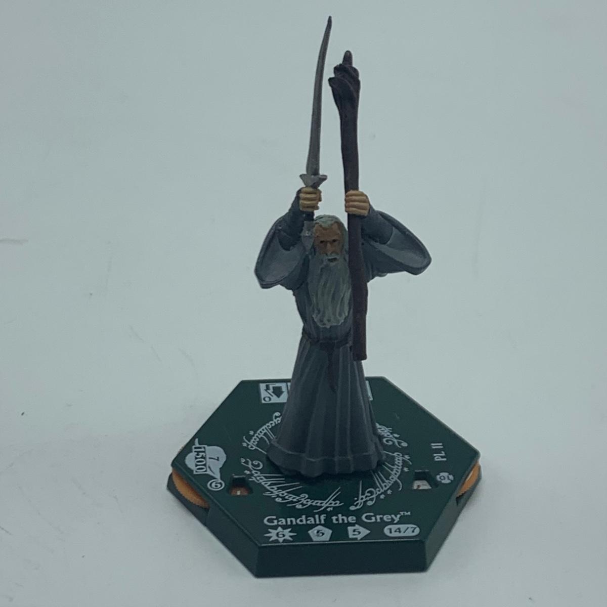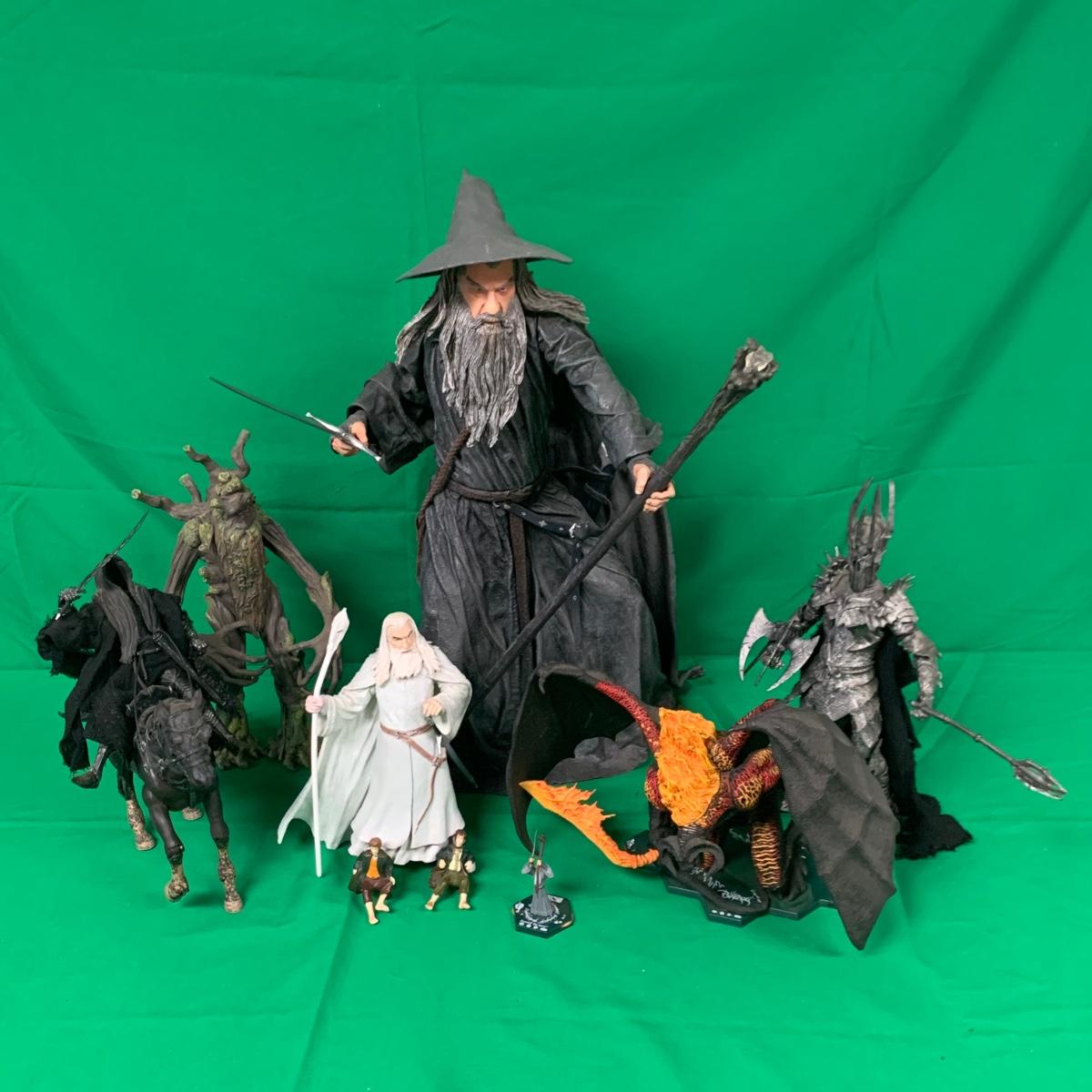 20” tall Gandalf by NECA towers over the eight other figurines in this lot. The large Gandalf and Sauron spoke when turned on. Most of the figurines have a soft plastic feel to them. The other figurines included are a white Gandalf, Treebeard, Sauron, Ringwraith on horse, and small seated Frodo and Bilbo. There are Balrog and Gandalf the Grey game pieces from Sabertooth Games as well.