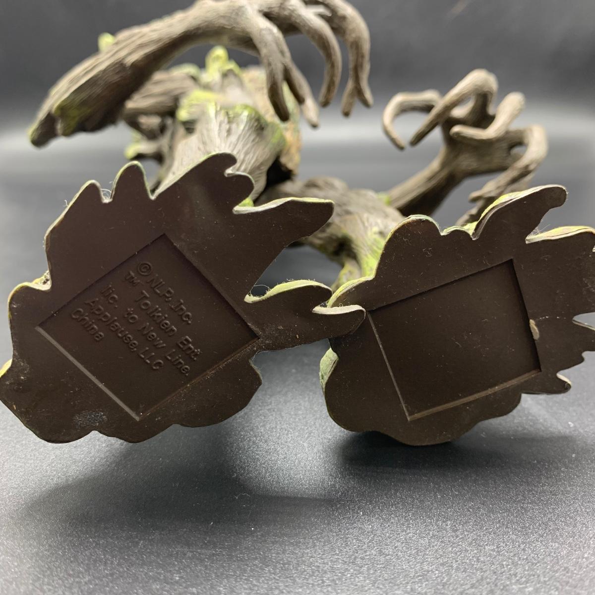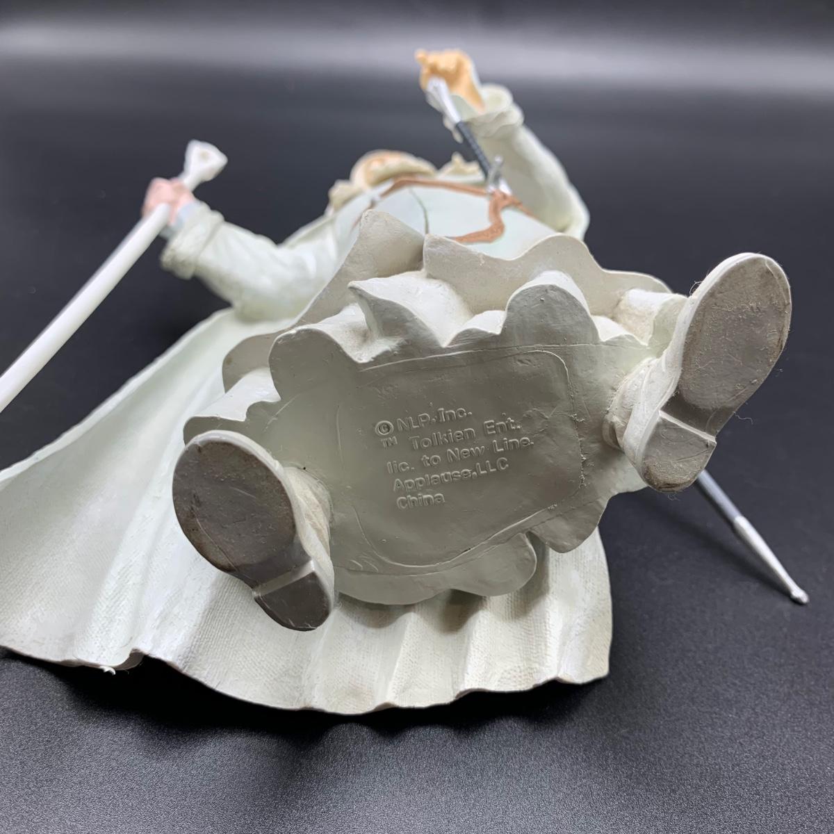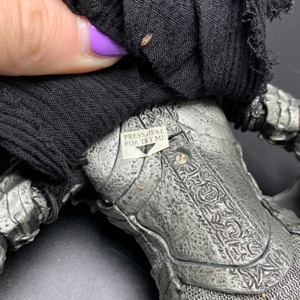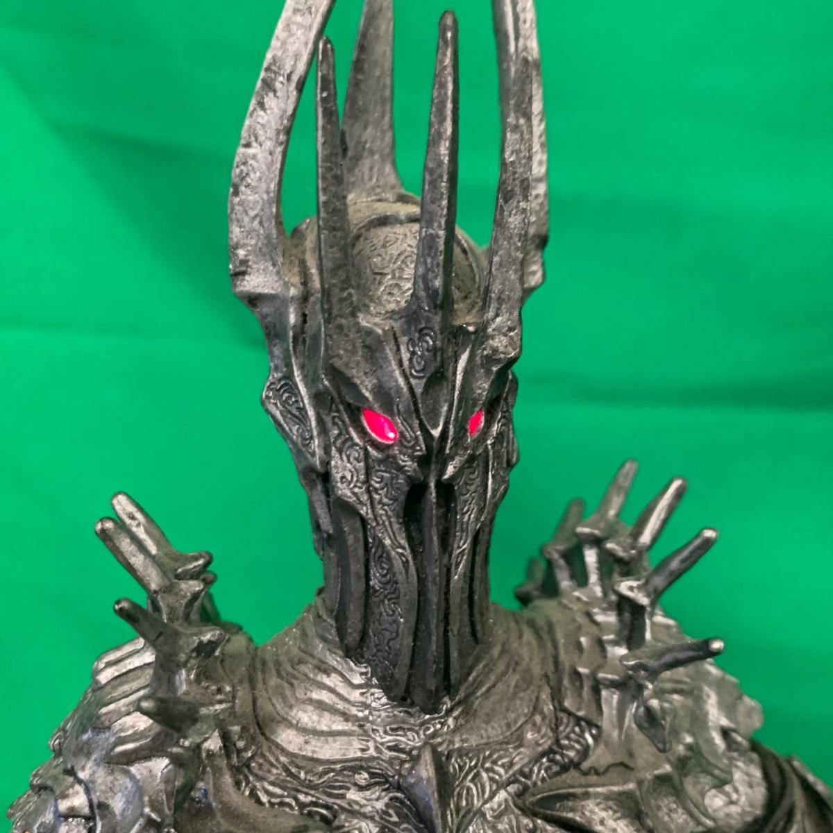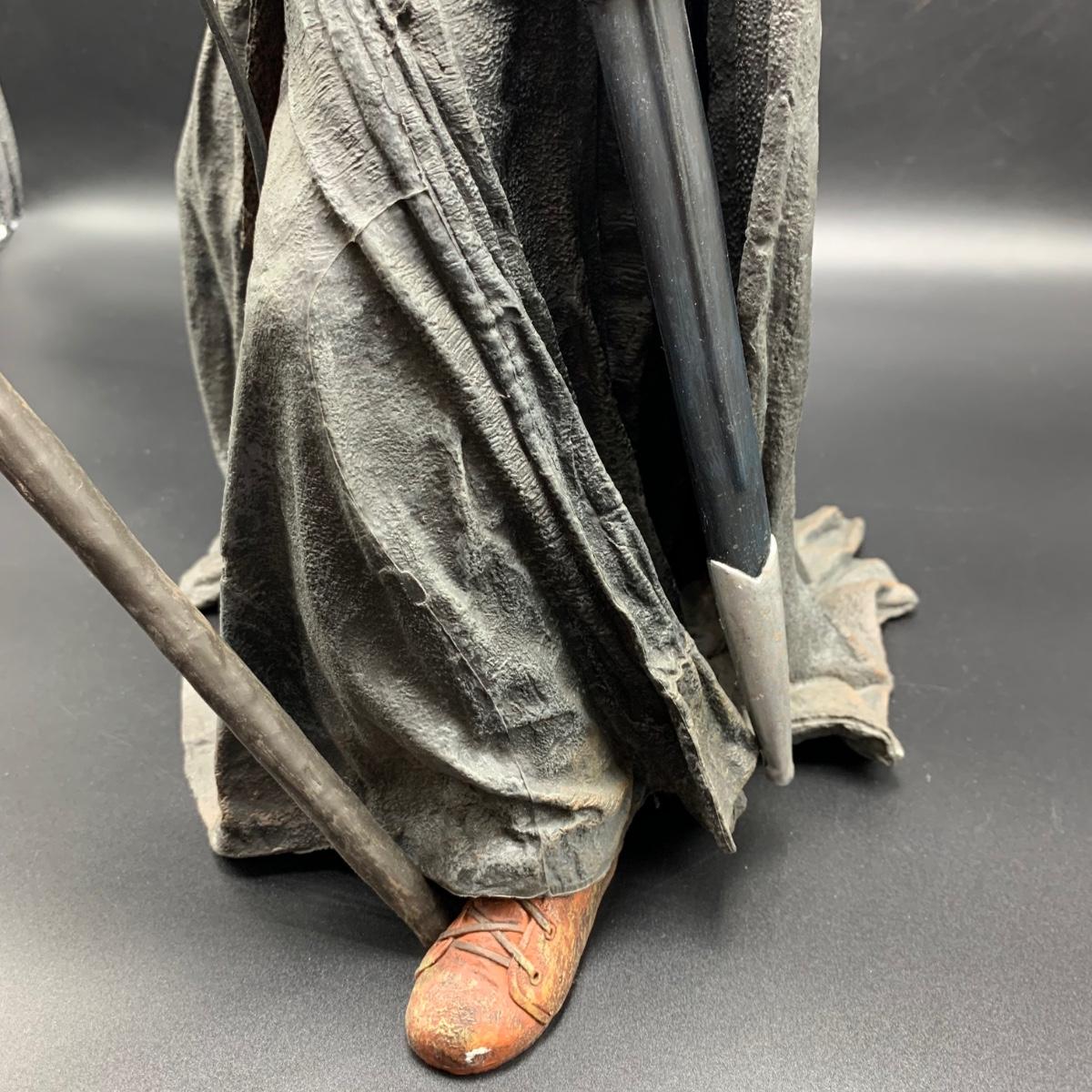 20” tall Gandalf by NECA towers over the eight other figurines in this lot. The large Gandalf and Sauron spoke when turned on. Most of the figurines have a soft plastic feel to them. The other figurines included are a white Gandalf, Treebeard, Sauron, Ringwraith on horse, and small seated Frodo and Bilbo. There are Balrog and Gandalf the Grey game pieces from Sabertooth Games as well.
