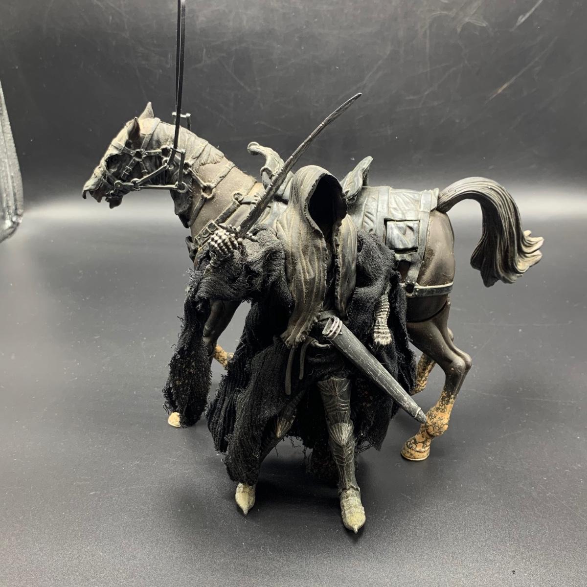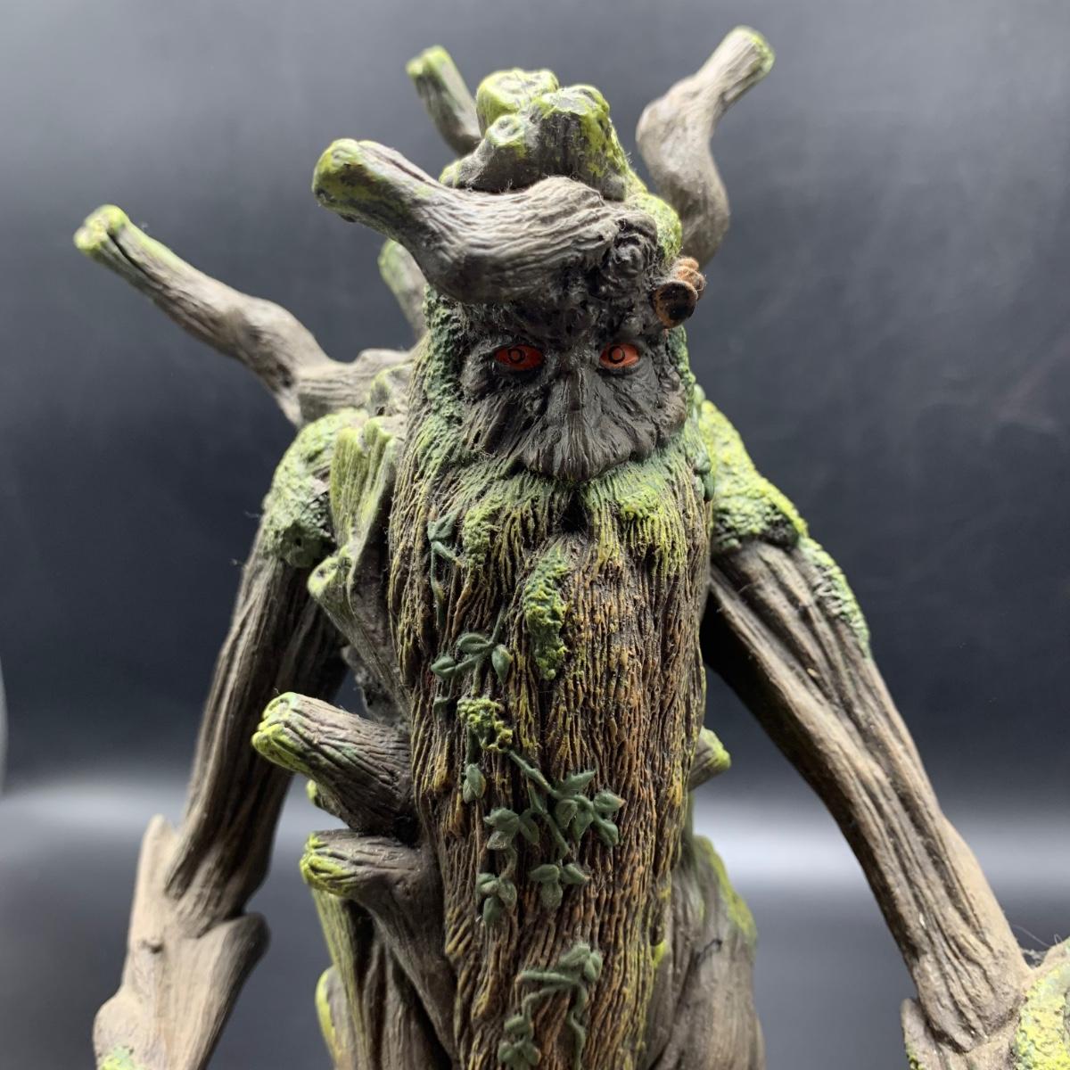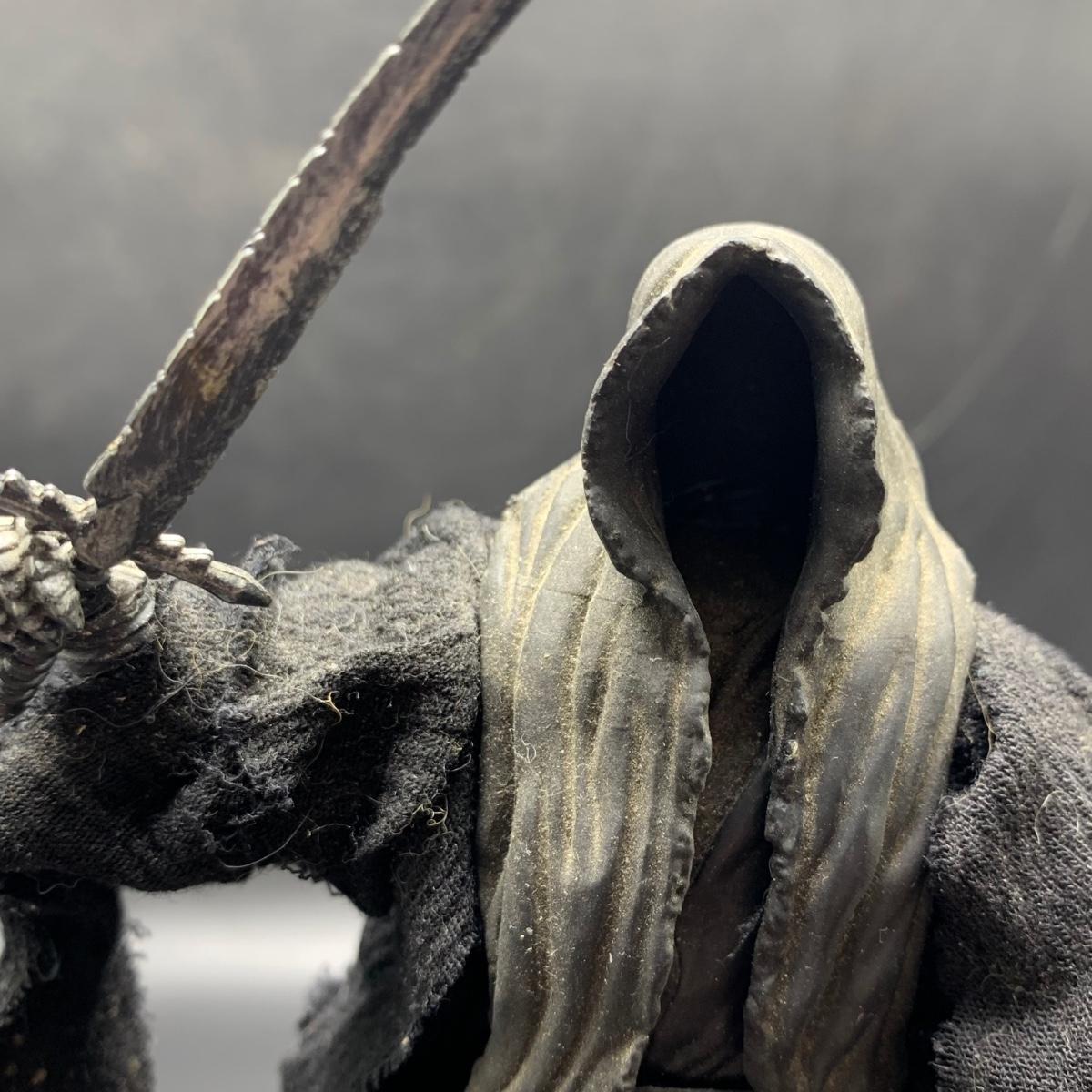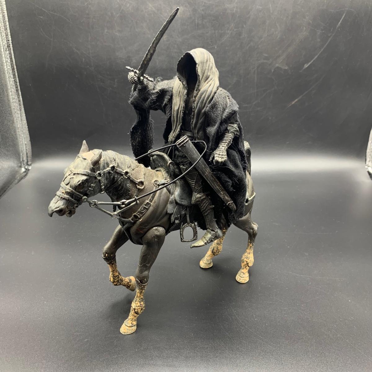 20” tall Gandalf by NECA towers over the eight other figurines in this lot. The large Gandalf and Sauron spoke when turned on. Most of the figurines have a soft plastic feel to them. The other figurines included are a white Gandalf, Treebeard, Sauron, Ringwraith on horse, and small seated Frodo and Bilbo. There are Balrog and Gandalf the Grey game pieces from Sabertooth Games as well.