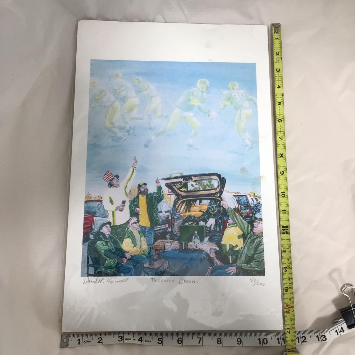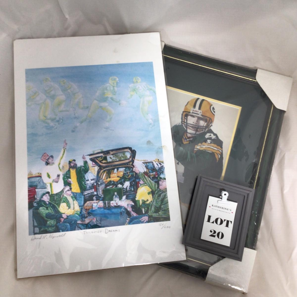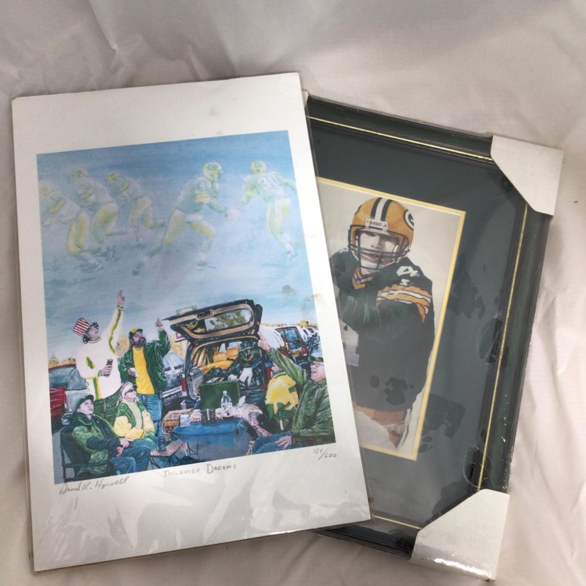 Two Signed Watercolor Packer Prints. One is a framed and matted Brett Farve print. The other is a watercolor Packers Tailgater scene. Please see photos for details and condition. ::: Shipping is available on this lot. If you require shipping you must let us know at the close of the auction. We will coordinate with you after the item has been won. Shipping fees will include insurance up to or exceeding the value of all items being mailed. If you have any questions regarding this lot please contact the auctioneer either via this website, by direct email or by phone. PICK UP TIMES and other important information can be found in the TERMS and DESCRIPTION of the auction. Please take a look for pertinent information. Thanks!