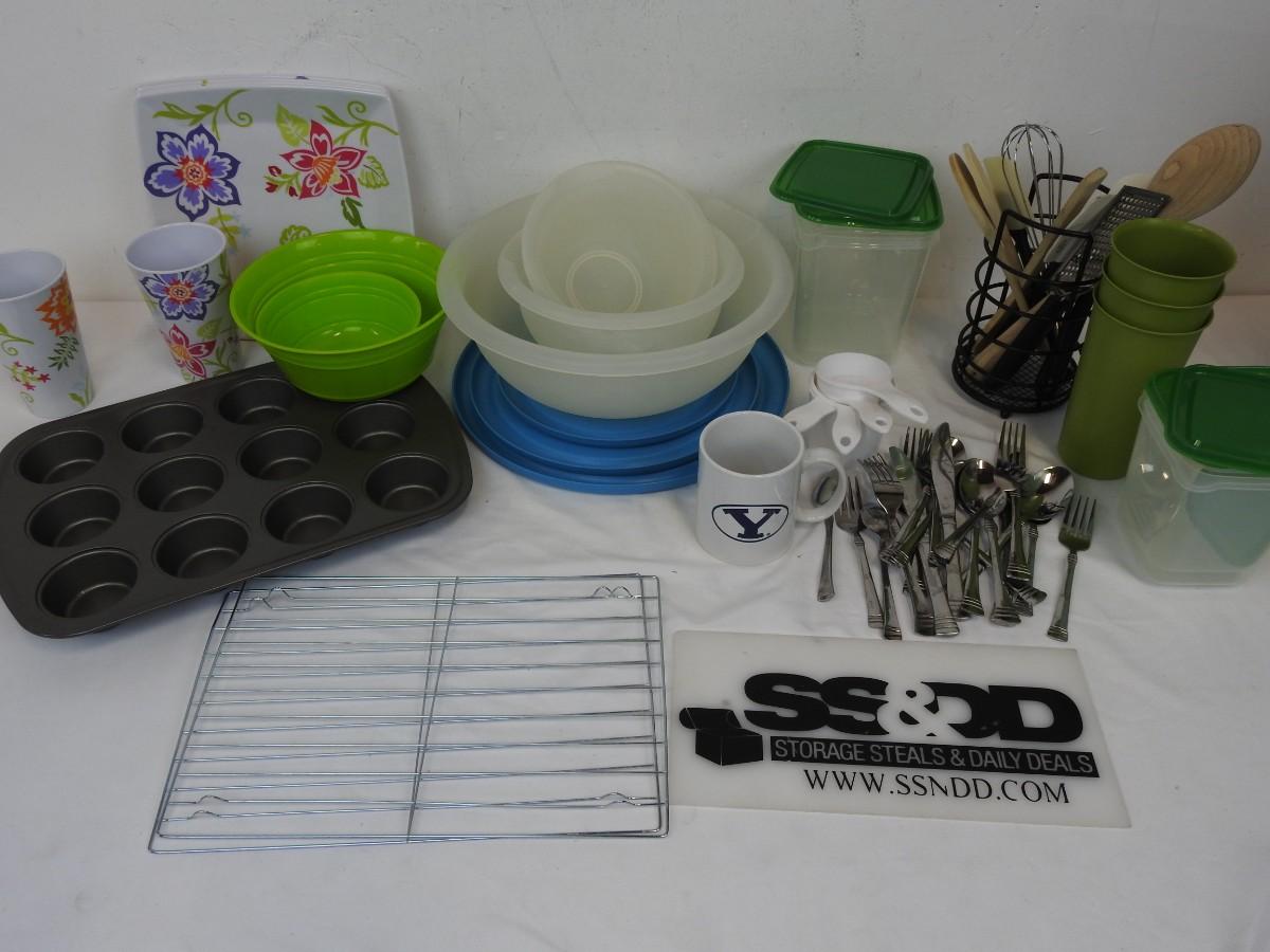 20+ pc Kitchen Lot: Utensils, Sterilite Plastic Storage, Packer ware, Flatware, Longaberger Flower Cups and Plates