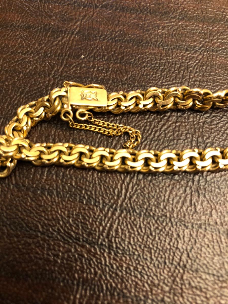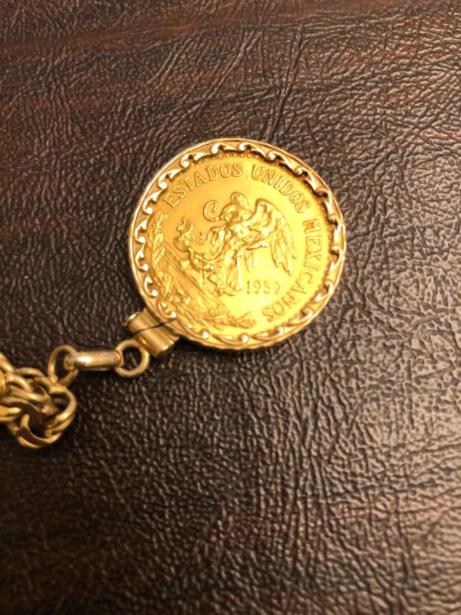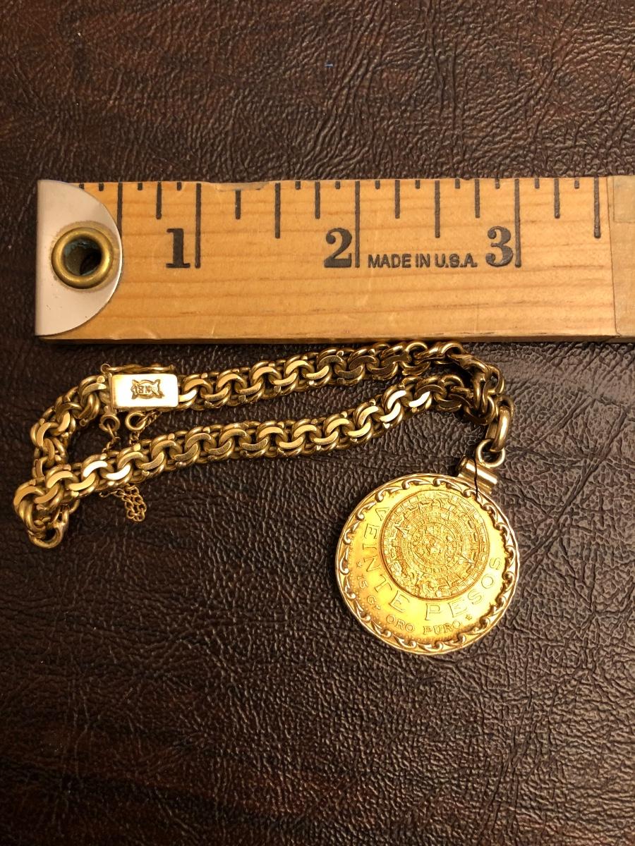 1959 15 grams pure gold 20 Peso Mexican coin. 18 karat gold bracelet.