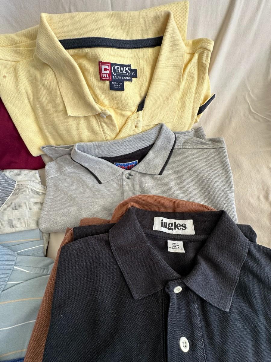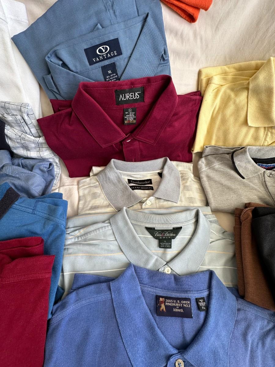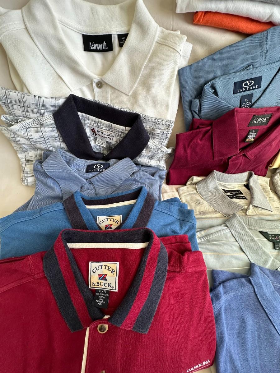 20 Piece Lot Mixed Men's Golf and Polo Shirts, Mostly XL, a Few L; Brands include Chaps, Pinhurst Open, Cutter and Buck, Vantage, Ashworth, Dunbrooke, Brooks Brothers. Also 5 T-shirts included.