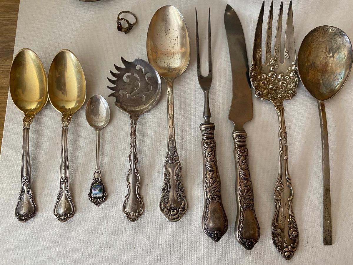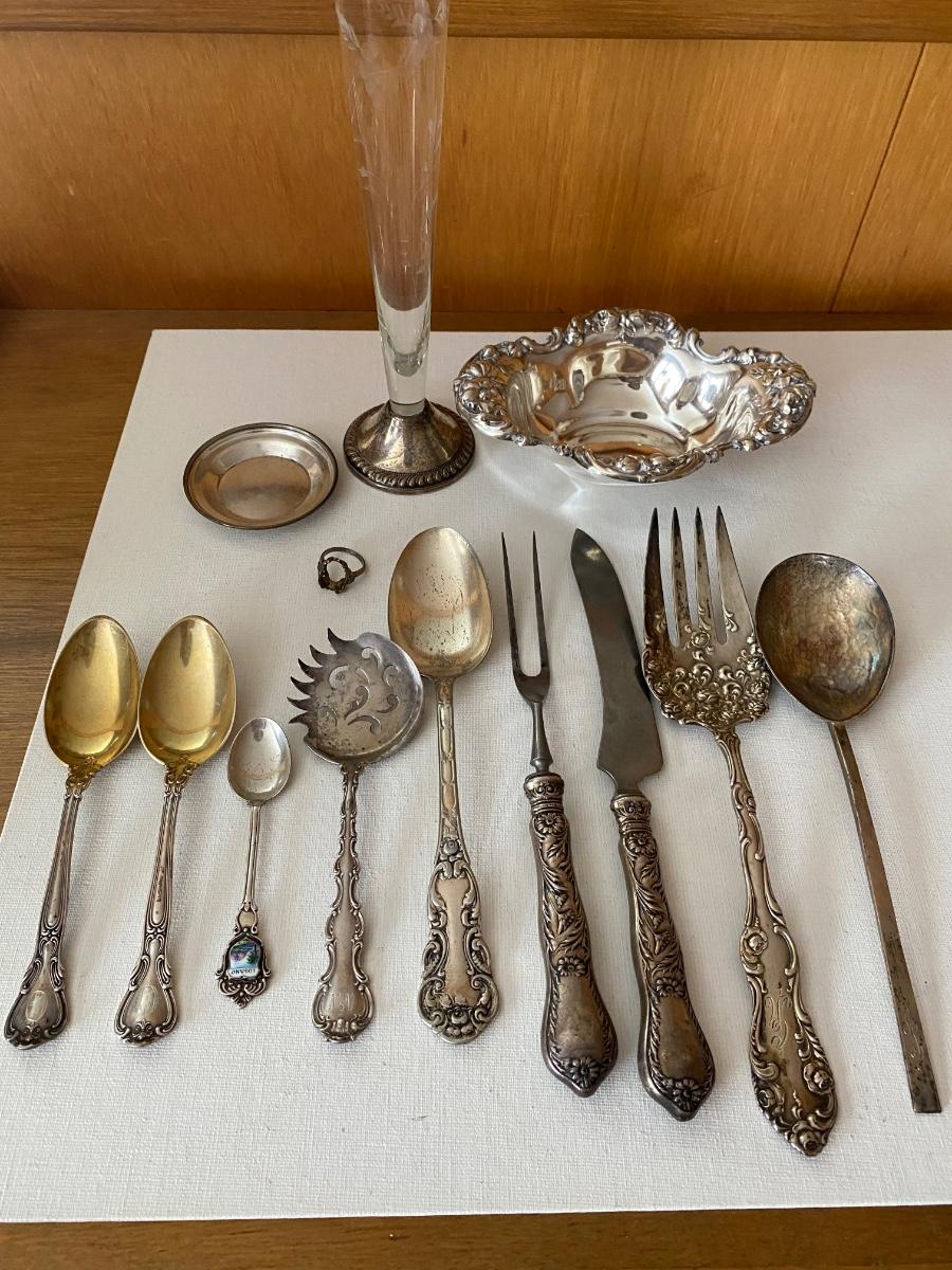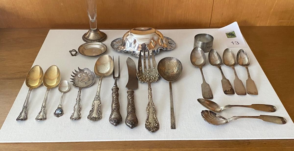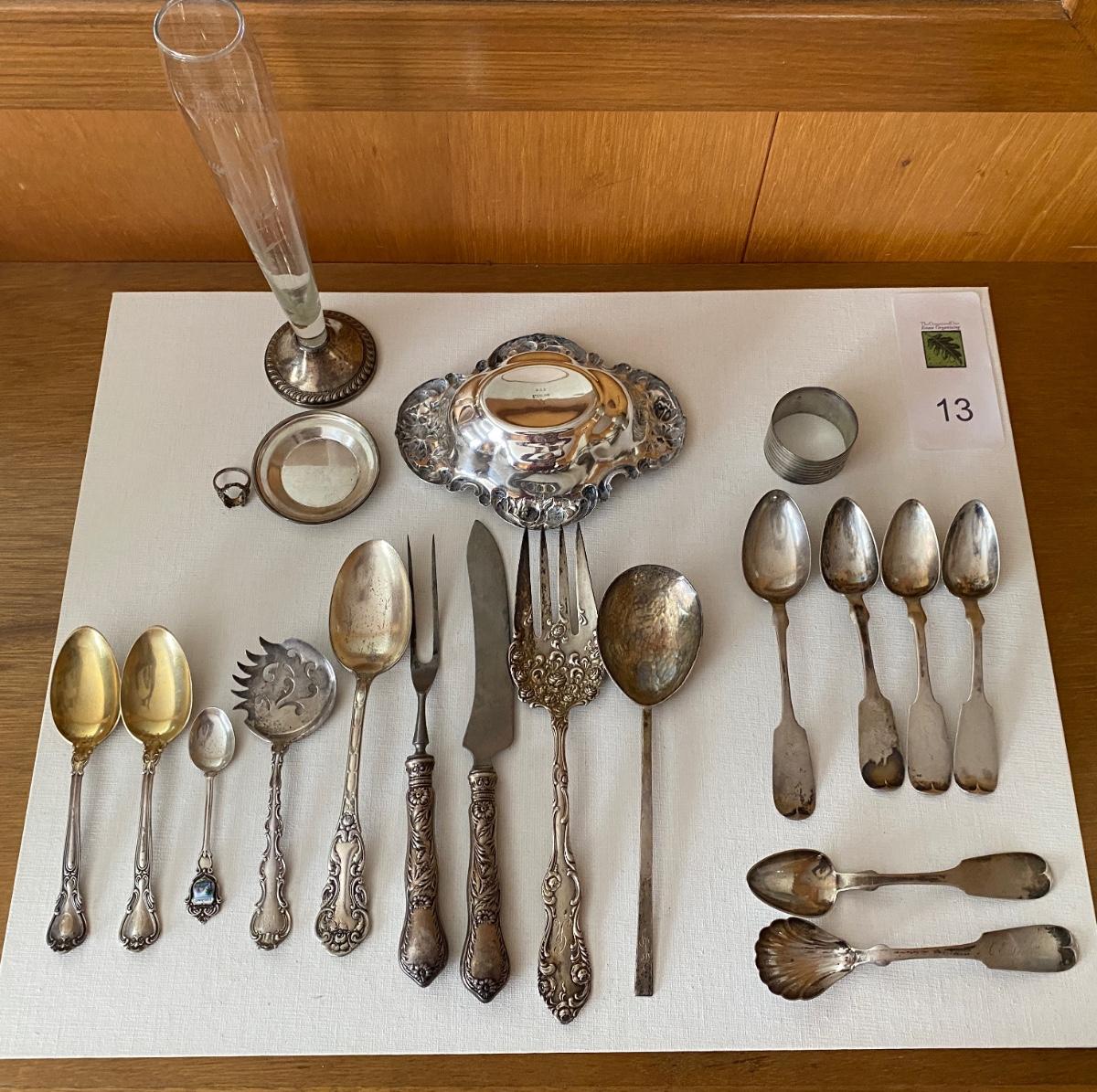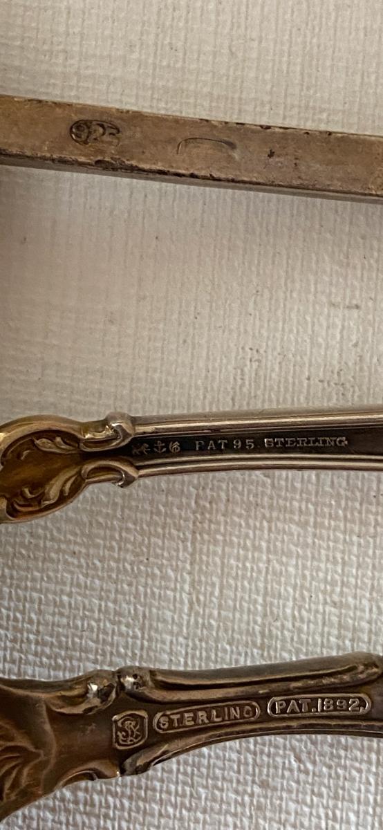 13 pieces have sterling silver marked on item. There are 7 pieces that have English silver symbols (6 spoons/1 napkin ring)