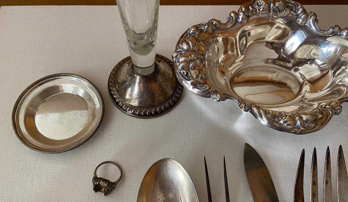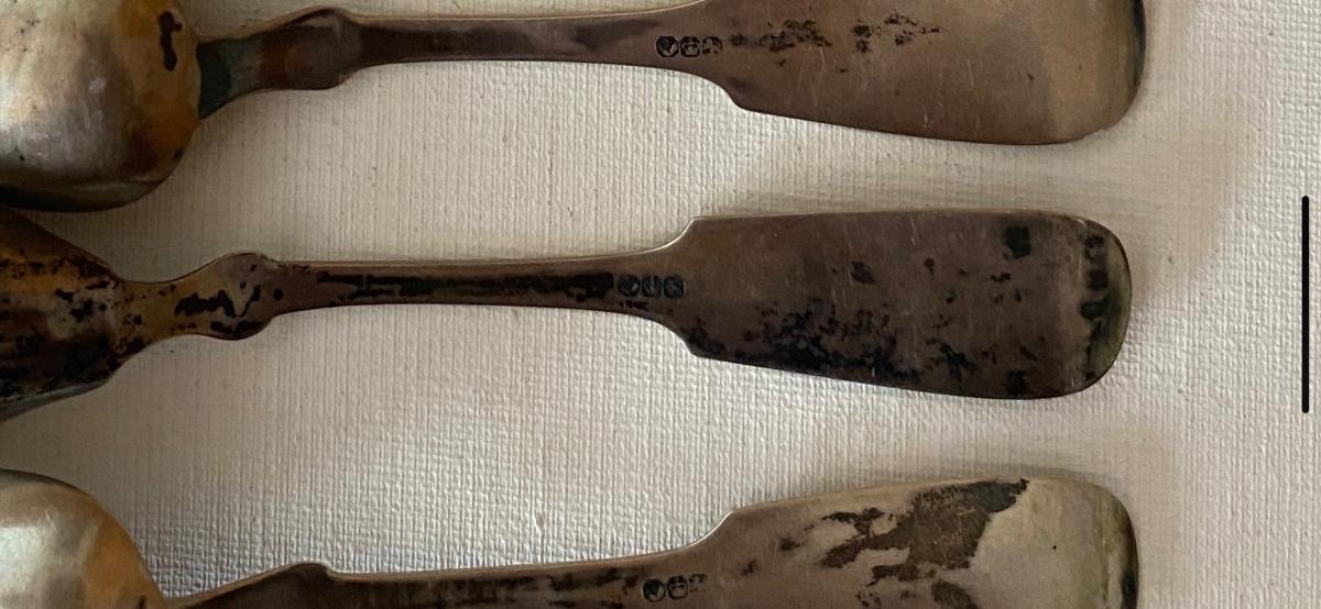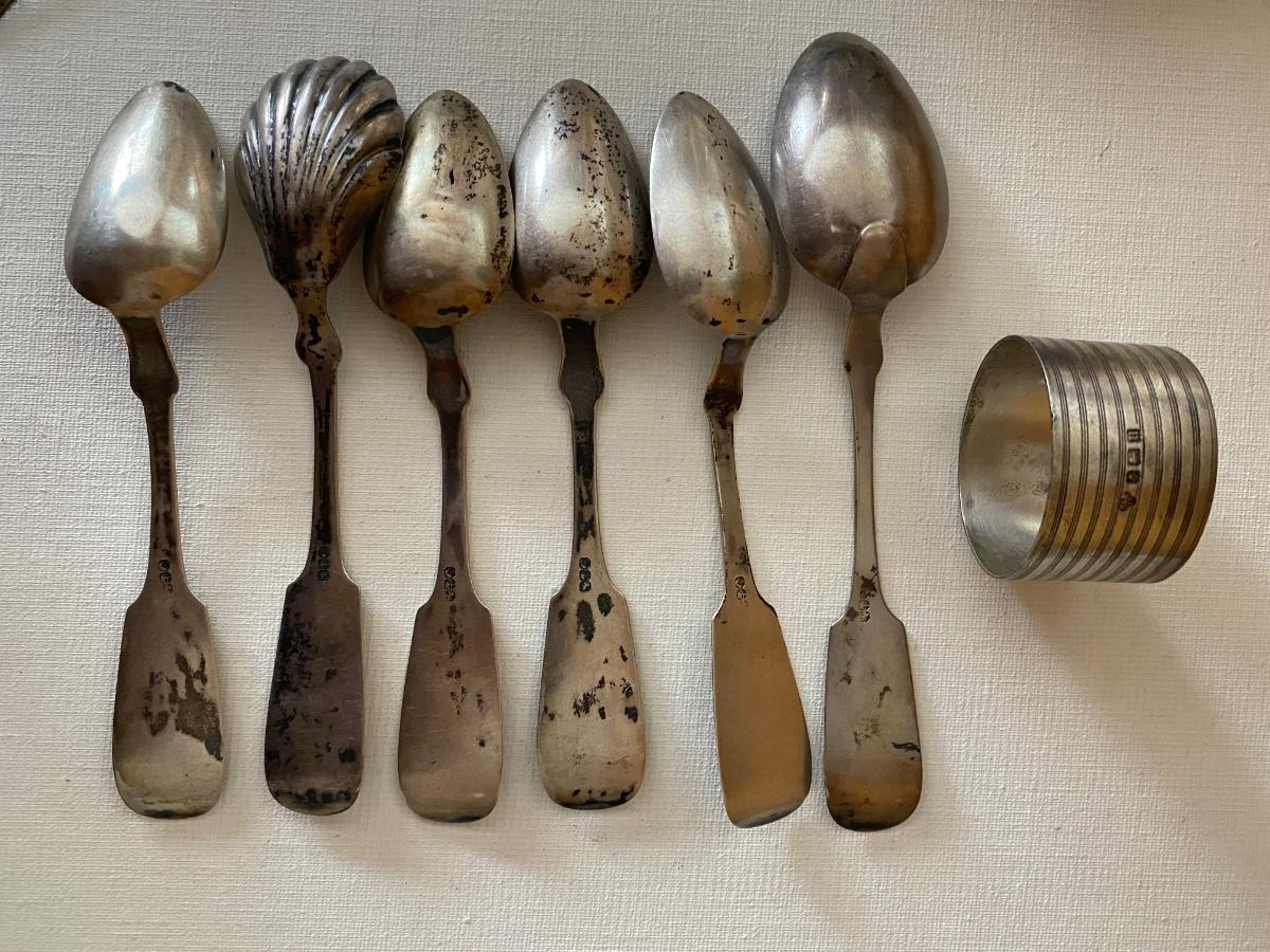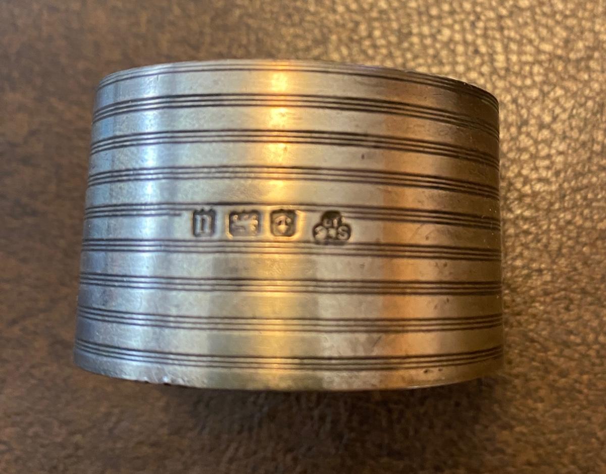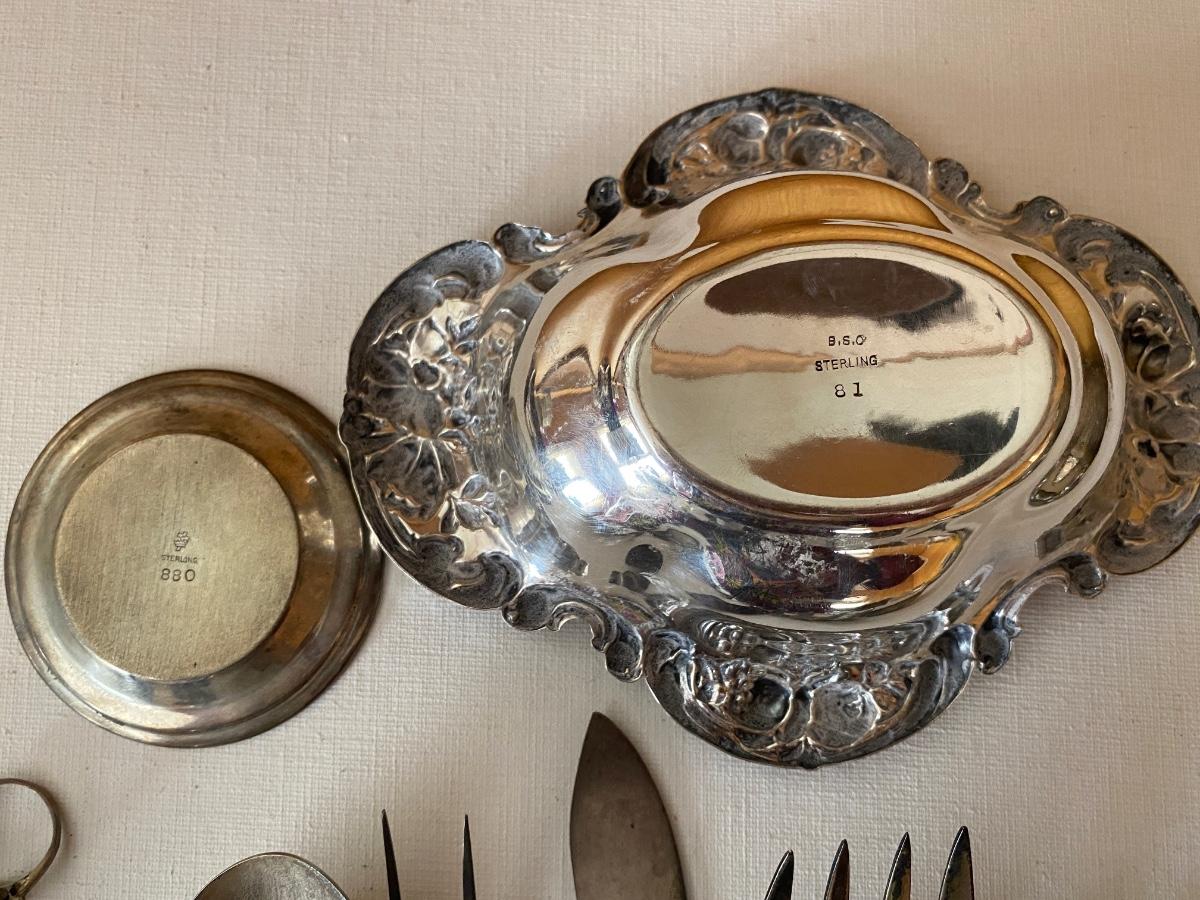 13 pieces have sterling silver marked on item. There are 7 pieces that have English silver symbols (6 spoons/1 napkin ring)