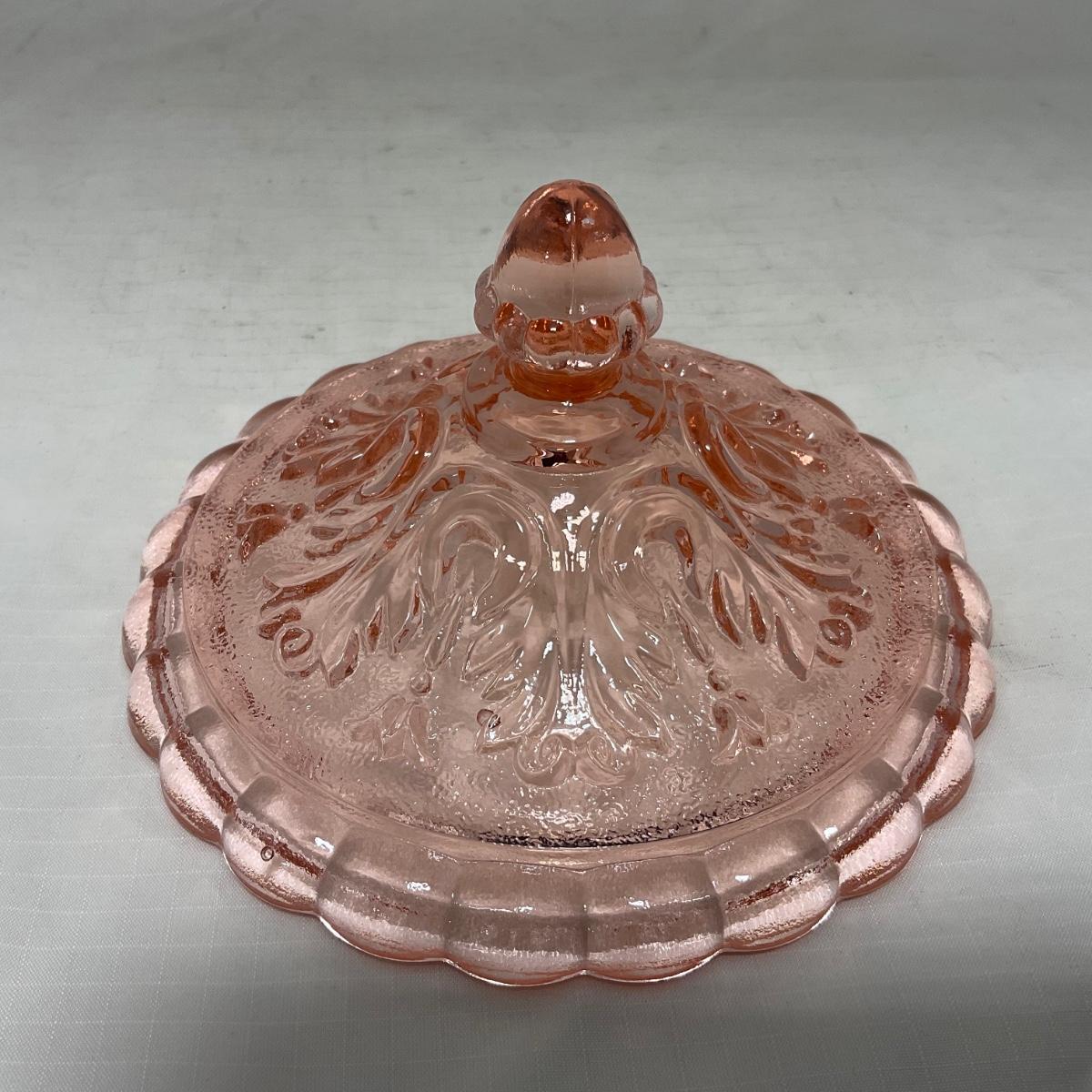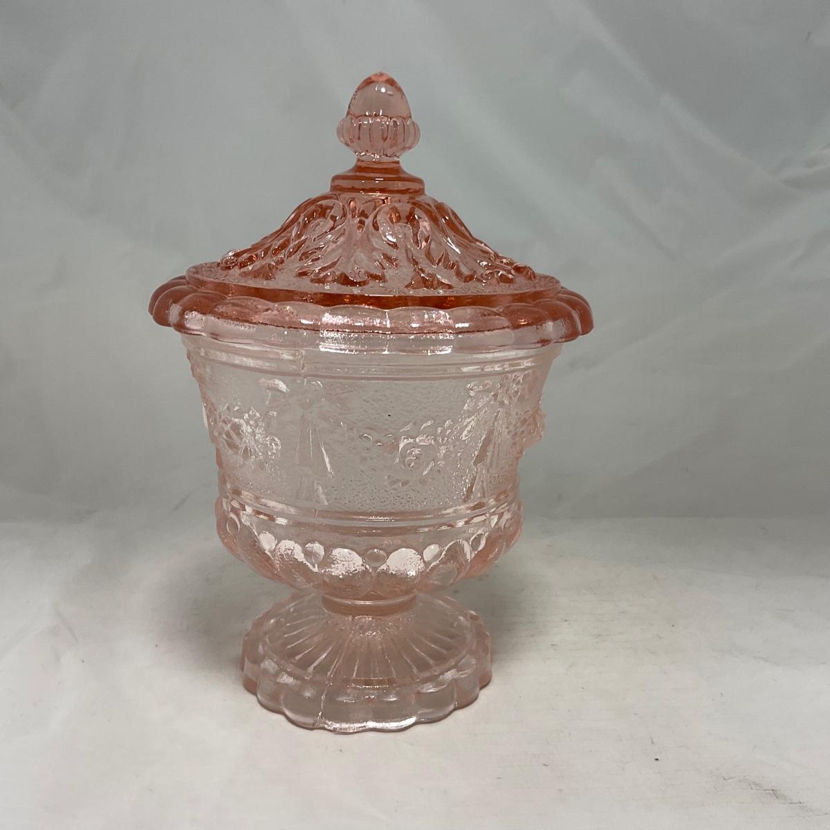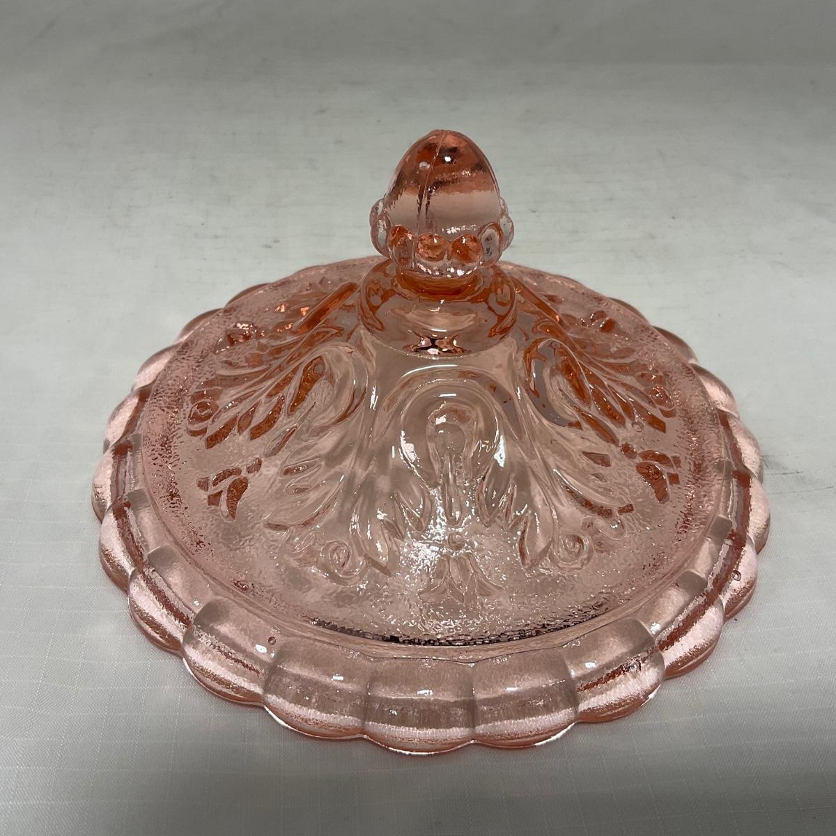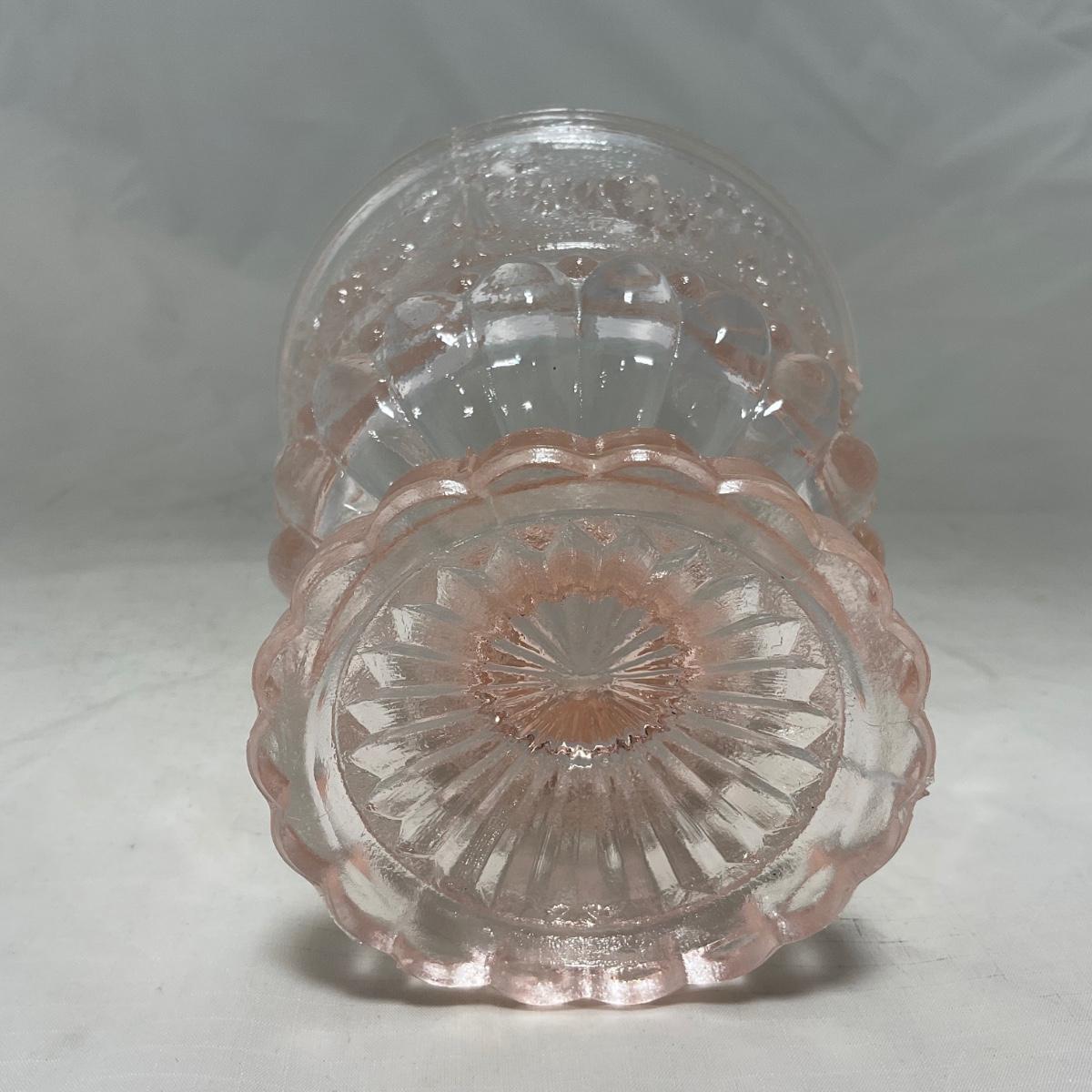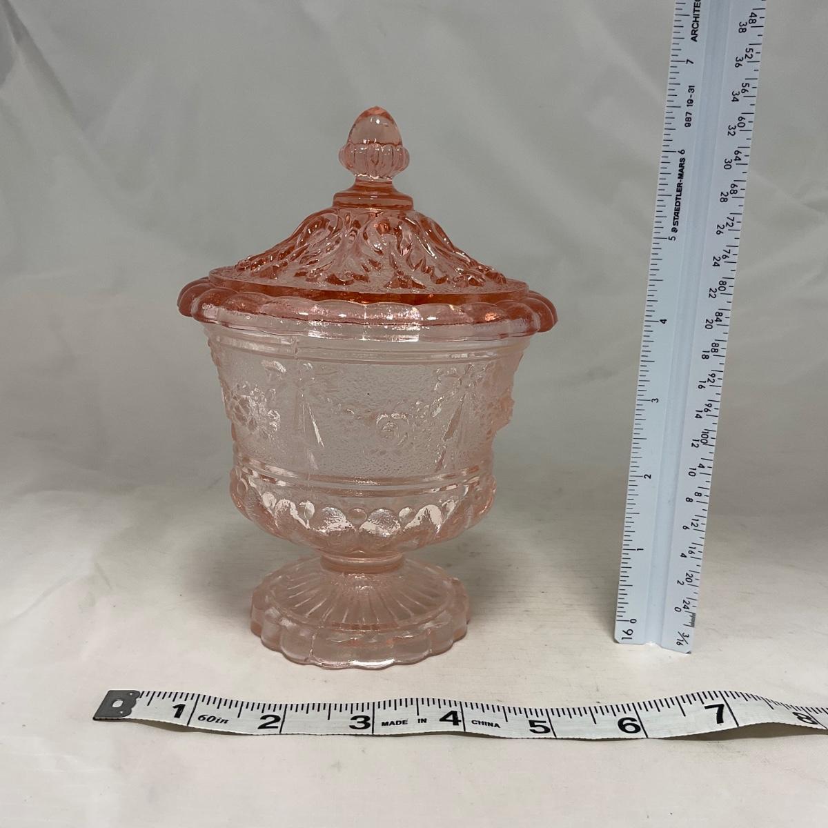 One pink depression glass covered compote or candy jar. Two pieces total with the lid and the the base of the piece. Beautiful detailed design, and look. Please see photos for details and condition. ::: Shipping is available on this lot. If you require shipping you must let us know at the close of the auction. We will coordinate with you after the item has been won. Shipping fees will include insurance up to or exceeding the value of all items being mailed. If you have any questions regarding this lot please contact the auctioneer either via this website, by direct email or by phone. PICK UP TIMES and other important information can be found in the TERMS and DESCRIPTION of the auction. Please take a look for pertinent information. Thanks!