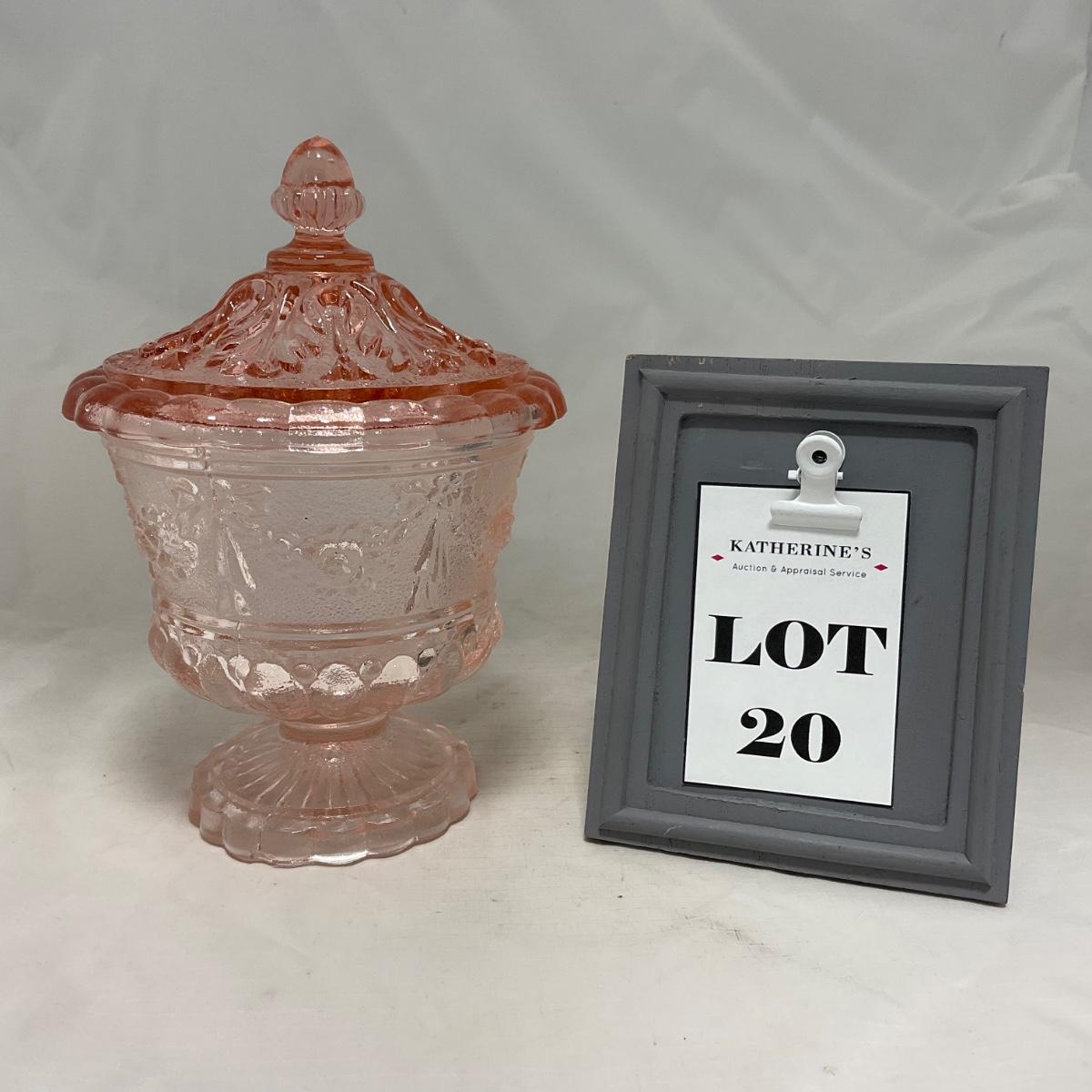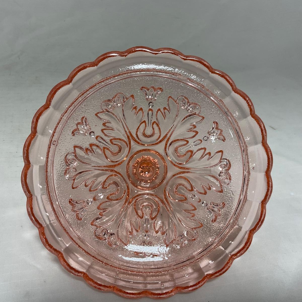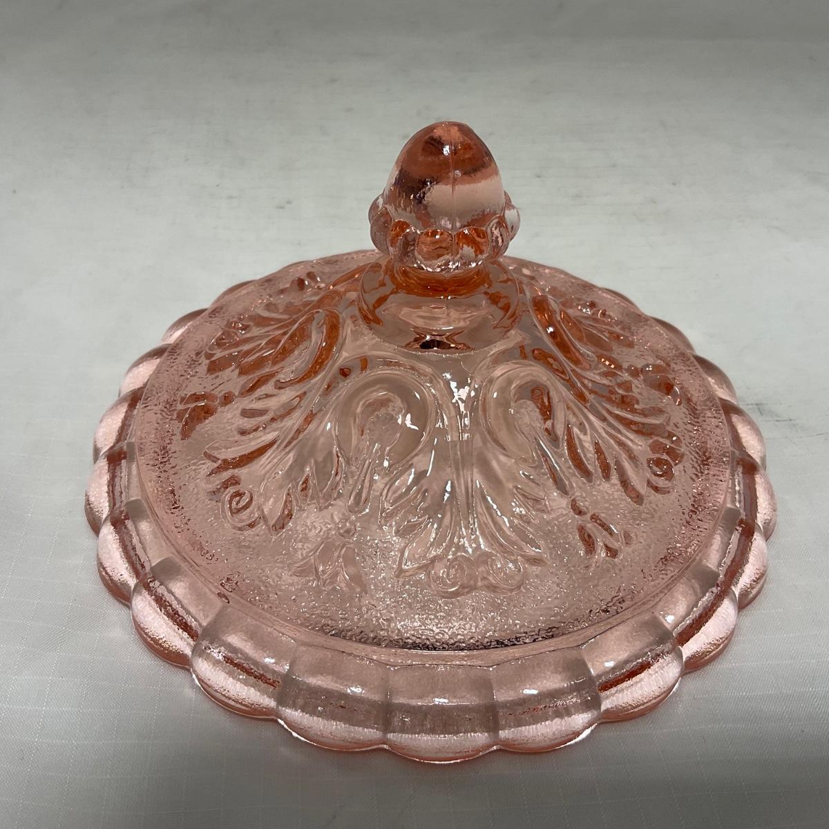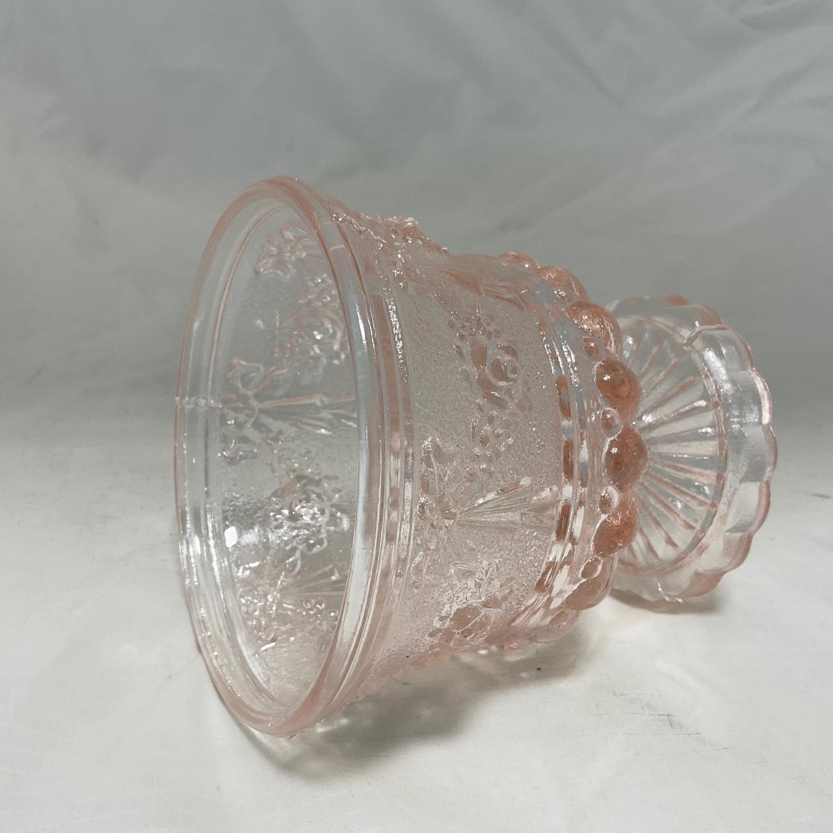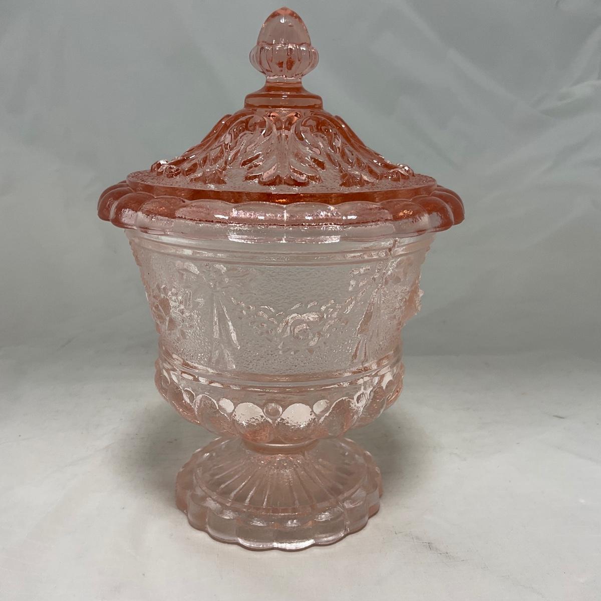 One pink depression glass covered compote or candy jar. Two pieces total with the lid and the the base of the piece. Beautiful detailed design, and look. Please see photos for details and condition. ::: Shipping is available on this lot. If you require shipping you must let us know at the close of the auction. We will coordinate with you after the item has been won. Shipping fees will include insurance up to or exceeding the value of all items being mailed. If you have any questions regarding this lot please contact the auctioneer either via this website, by direct email or by phone. PICK UP TIMES and other important information can be found in the TERMS and DESCRIPTION of the auction. Please take a look for pertinent information. Thanks!