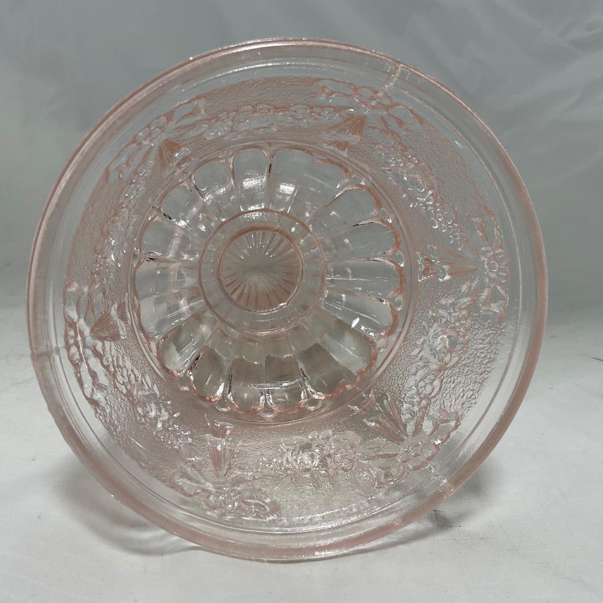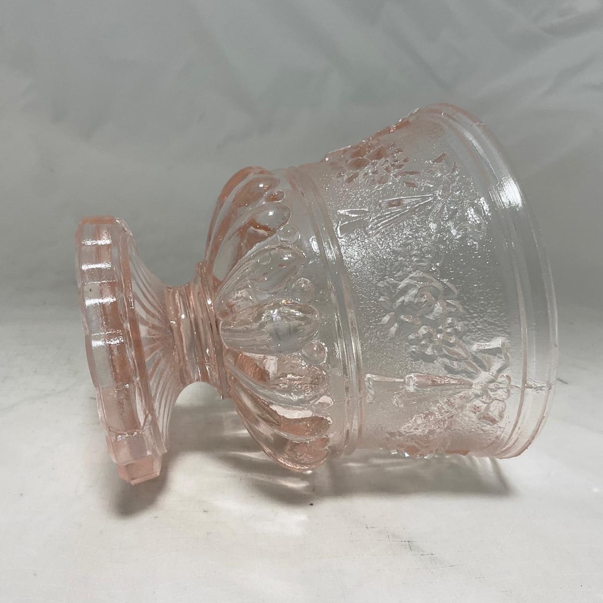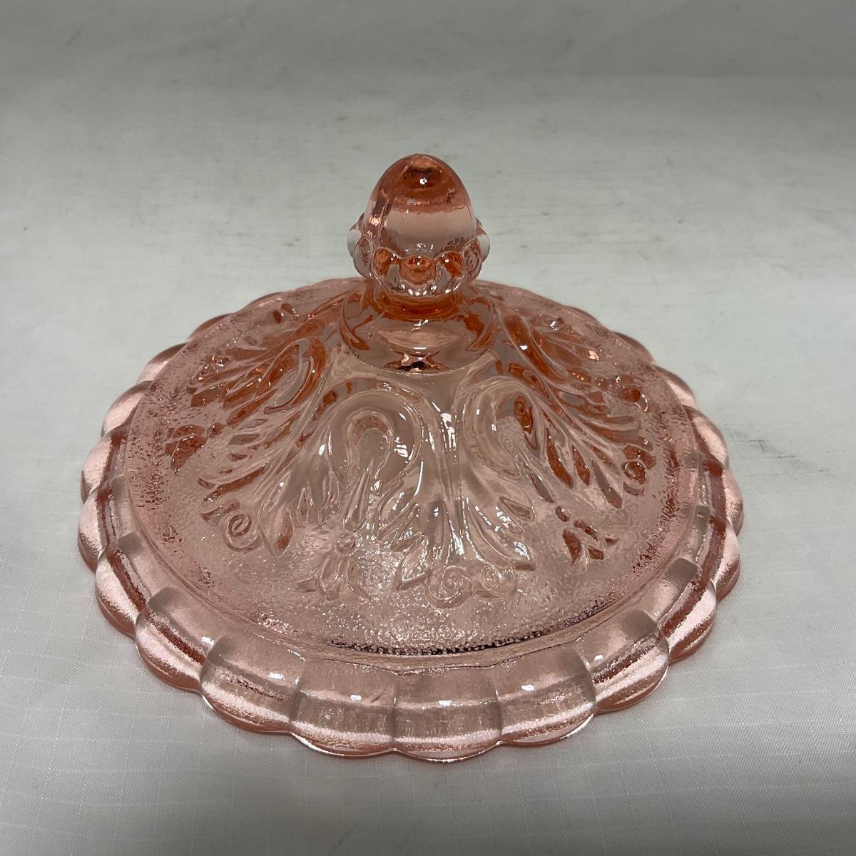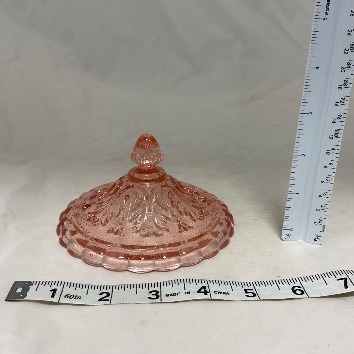 One pink depression glass covered compote or candy jar. Two pieces total with the lid and the the base of the piece. Beautiful detailed design, and look. Please see photos for details and condition. ::: Shipping is available on this lot. If you require shipping you must let us know at the close of the auction. We will coordinate with you after the item has been won. Shipping fees will include insurance up to or exceeding the value of all items being mailed. If you have any questions regarding this lot please contact the auctioneer either via this website, by direct email or by phone. PICK UP TIMES and other important information can be found in the TERMS and DESCRIPTION of the auction. Please take a look for pertinent information. Thanks!