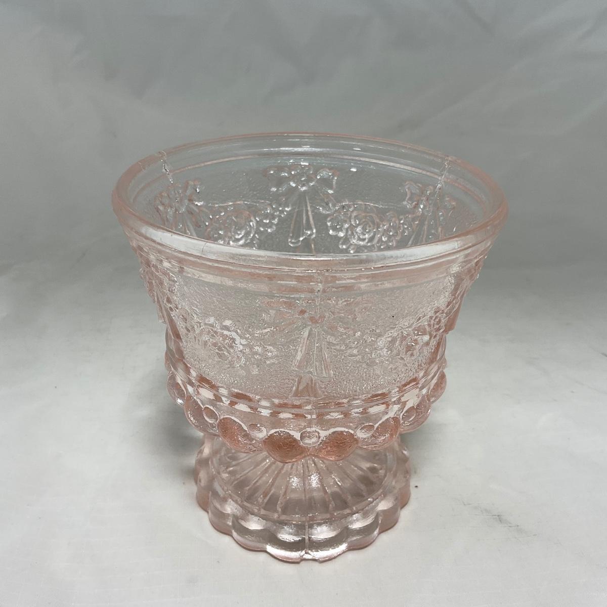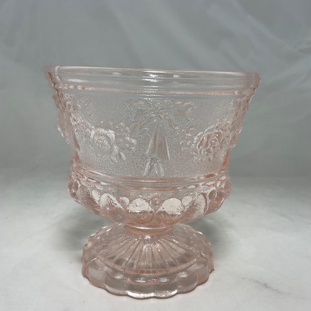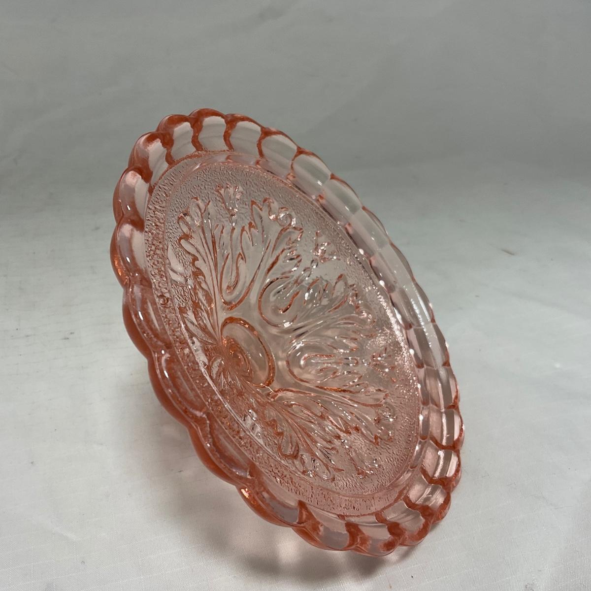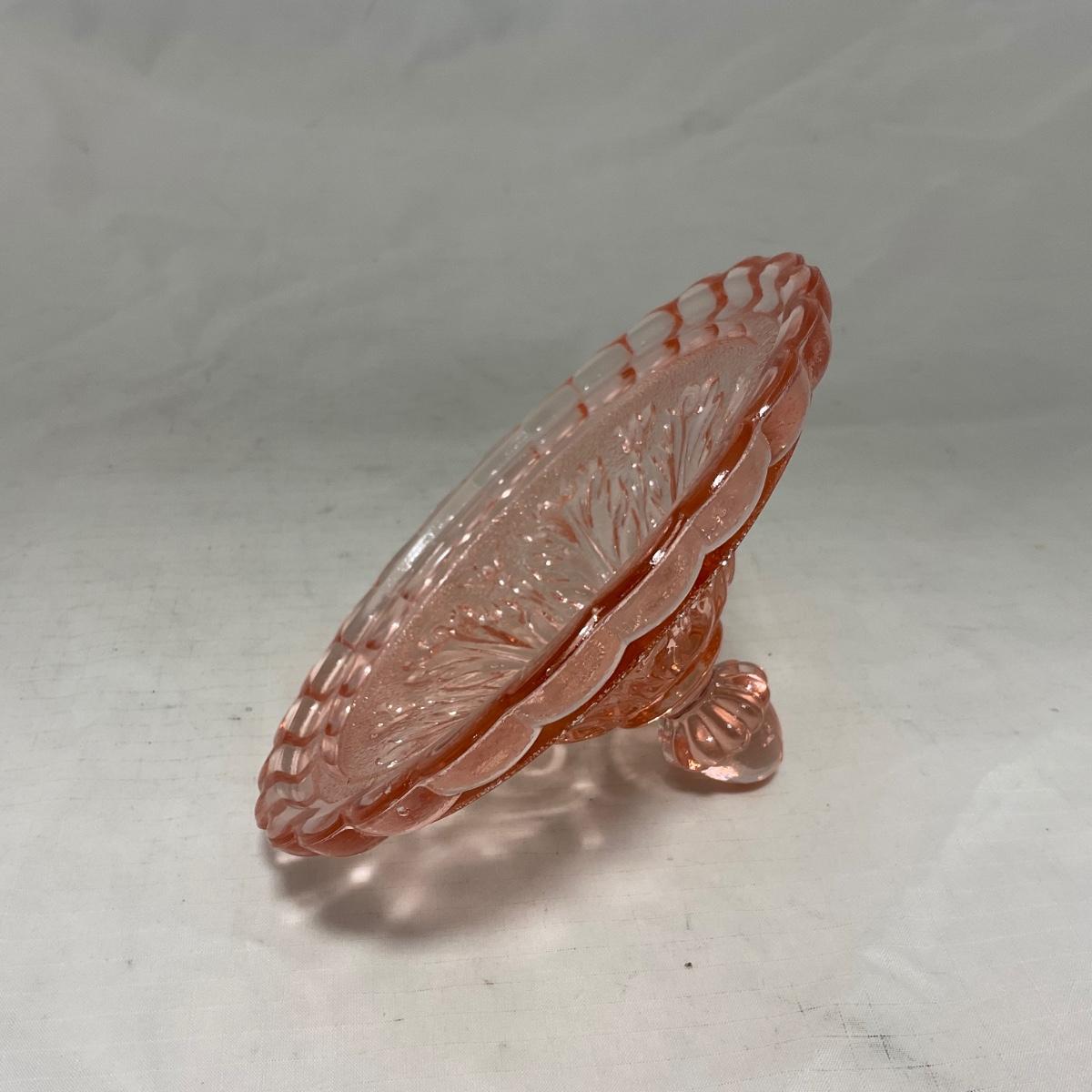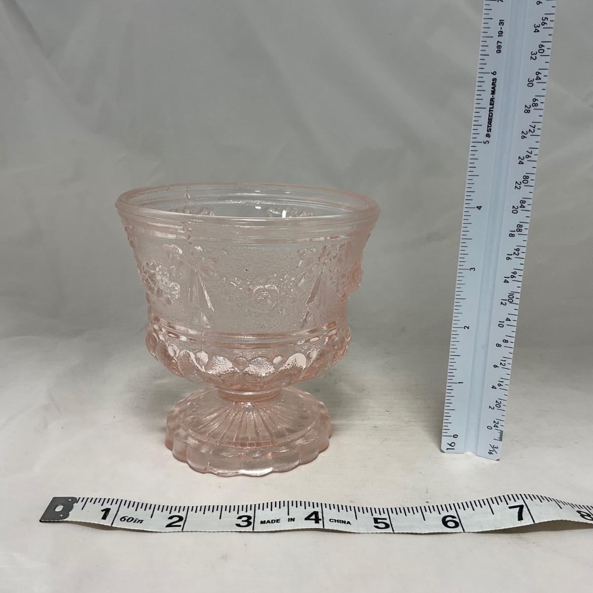 One pink depression glass covered compote or candy jar. Two pieces total with the lid and the the base of the piece. Beautiful detailed design, and look. Please see photos for details and condition. ::: Shipping is available on this lot. If you require shipping you must let us know at the close of the auction. We will coordinate with you after the item has been won. Shipping fees will include insurance up to or exceeding the value of all items being mailed. If you have any questions regarding this lot please contact the auctioneer either via this website, by direct email or by phone. PICK UP TIMES and other important information can be found in the TERMS and DESCRIPTION of the auction. Please take a look for pertinent information. Thanks!