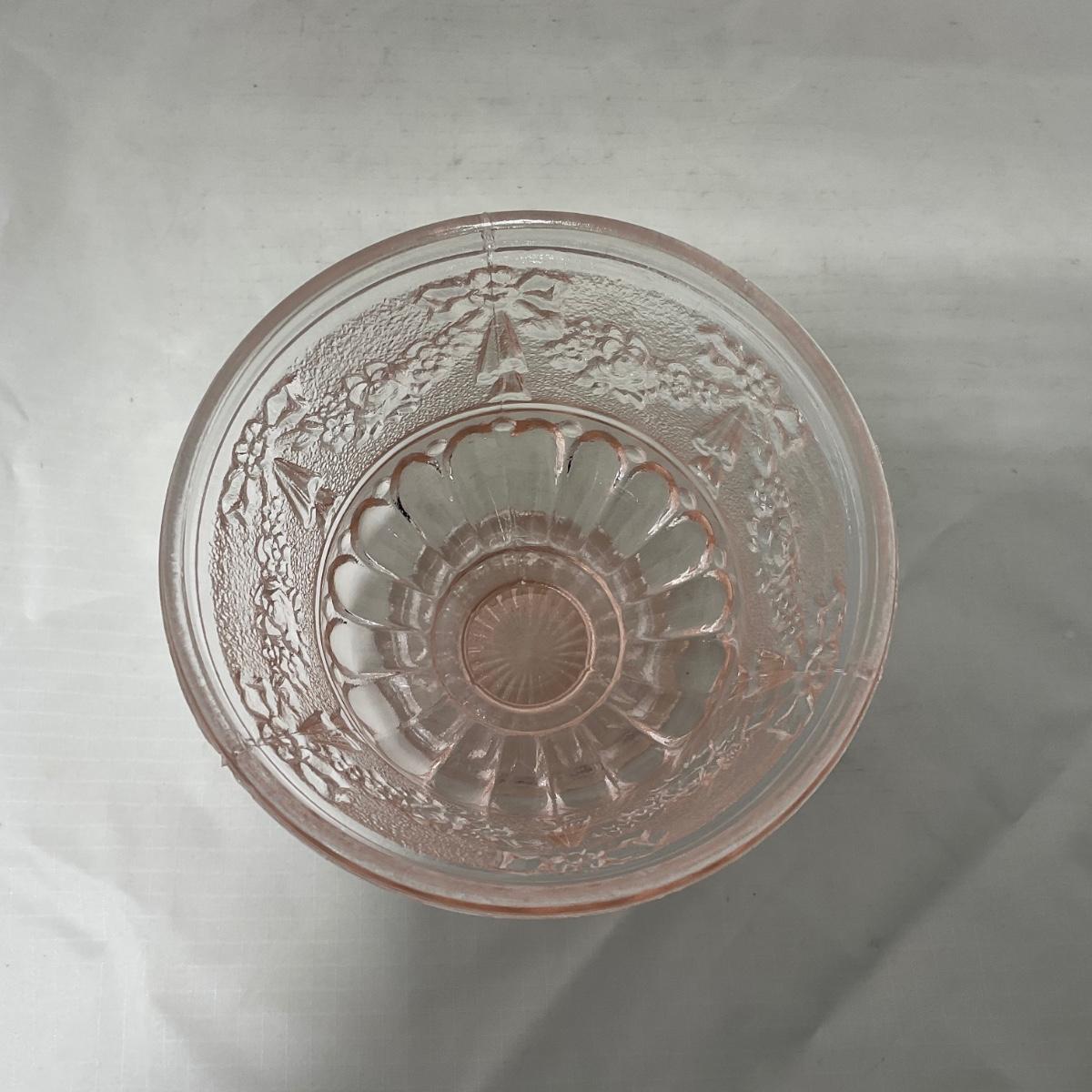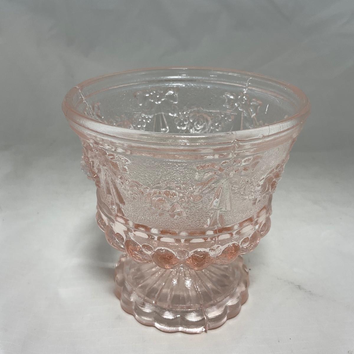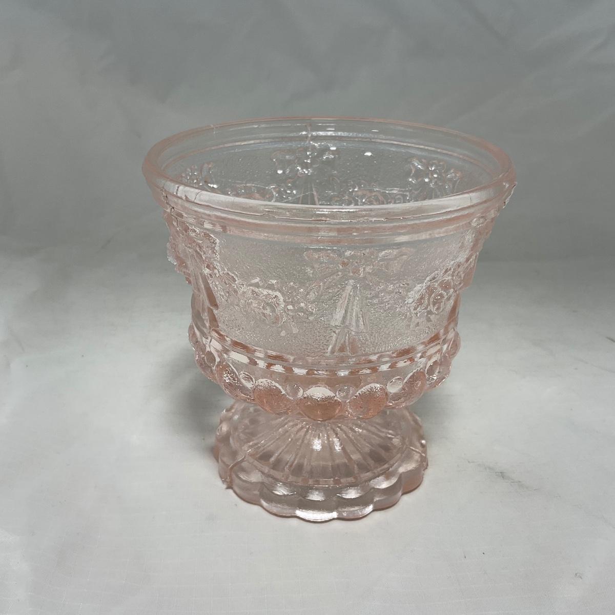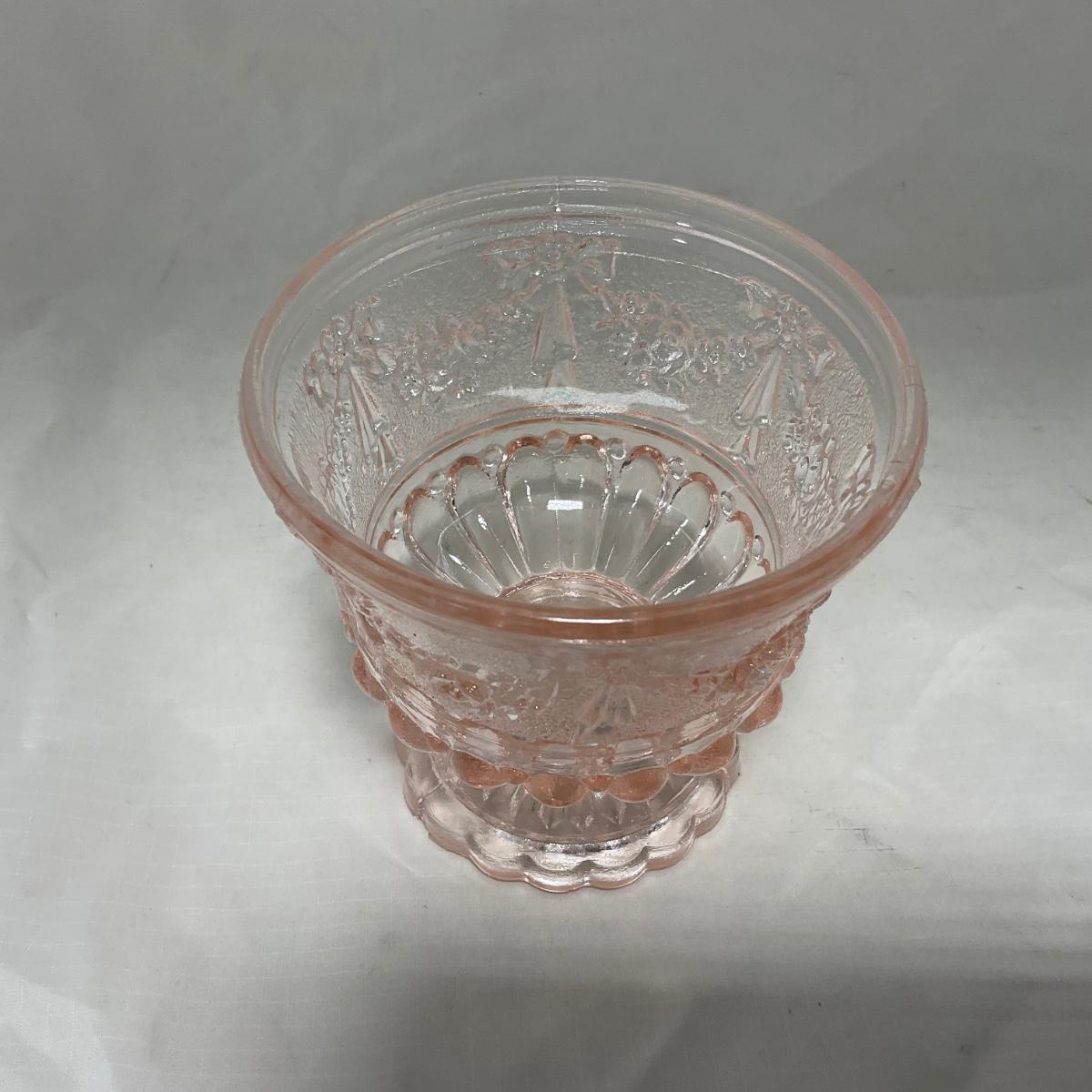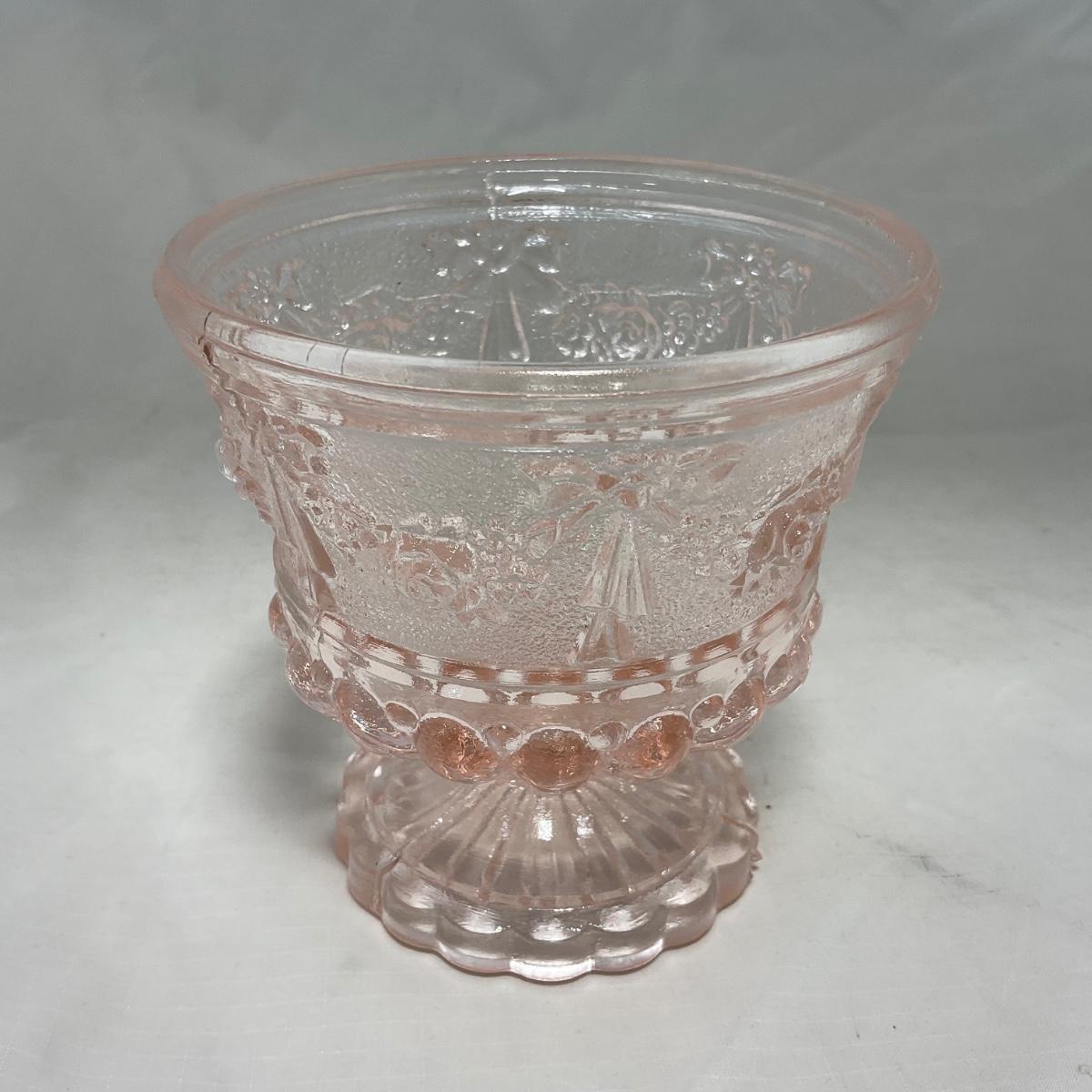 One pink depression glass covered compote or candy jar. Two pieces total with the lid and the the base of the piece. Beautiful detailed design, and look. Please see photos for details and condition. ::: Shipping is available on this lot. If you require shipping you must let us know at the close of the auction. We will coordinate with you after the item has been won. Shipping fees will include insurance up to or exceeding the value of all items being mailed. If you have any questions regarding this lot please contact the auctioneer either via this website, by direct email or by phone. PICK UP TIMES and other important information can be found in the TERMS and DESCRIPTION of the auction. Please take a look for pertinent information. Thanks!