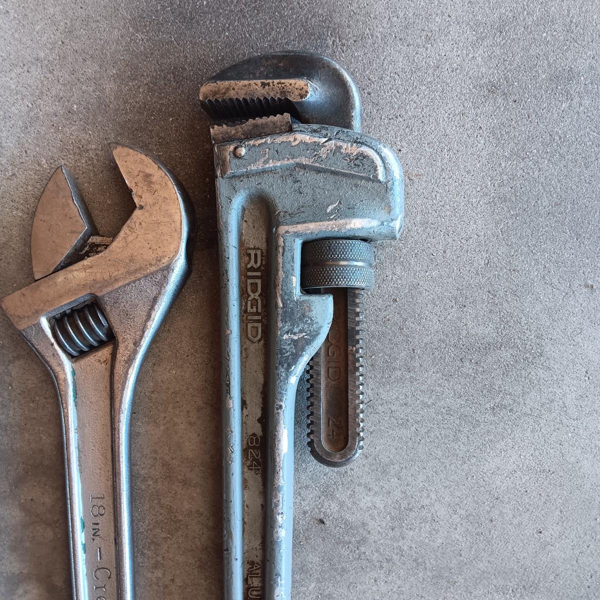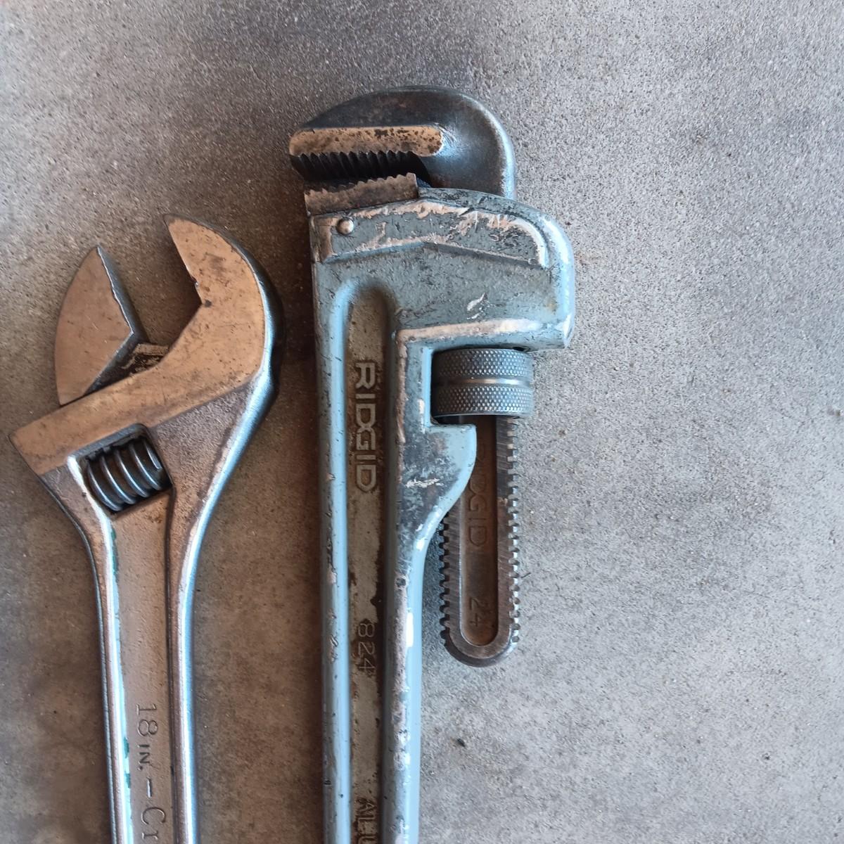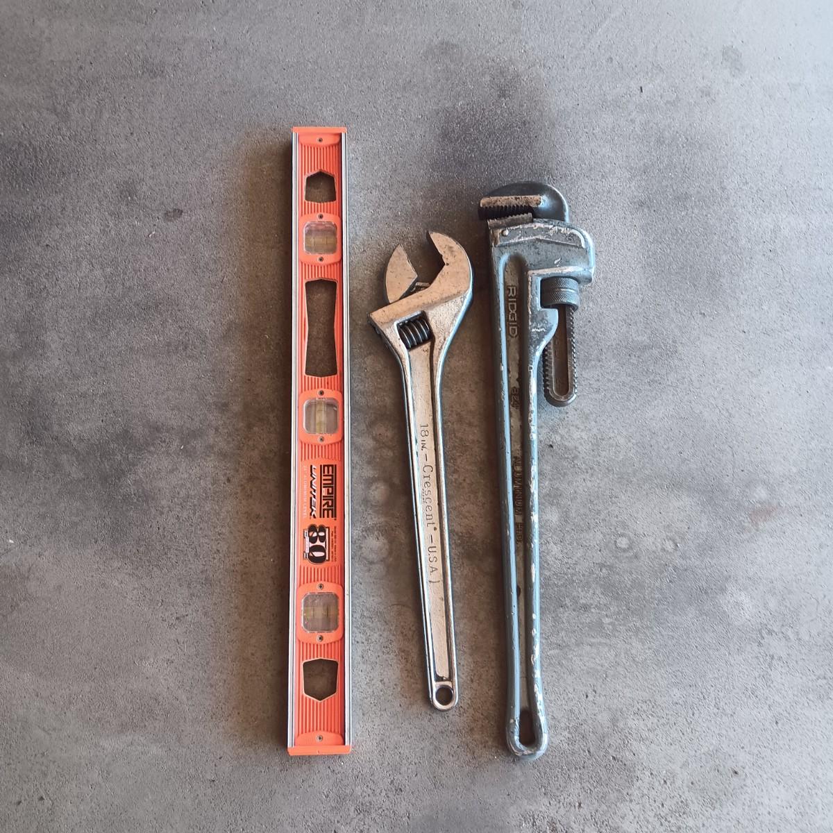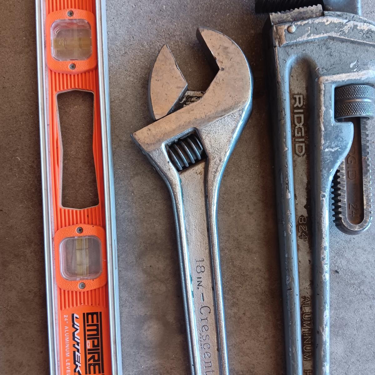 20" RIDGID PIPE & 18" CRESCENT WRENCHES & 2 FT ALUMINUM LEVEL