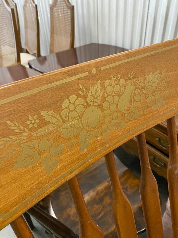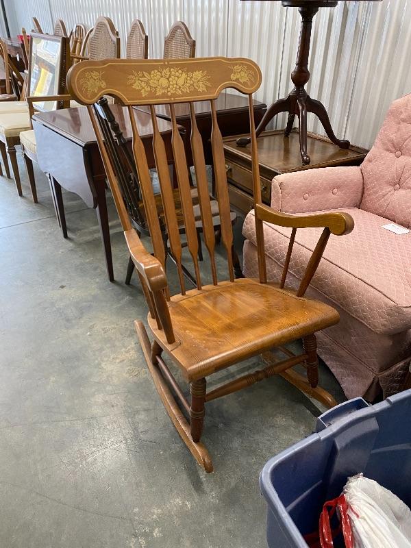 Rocking chair. Always a classic. Includes a nice gold painted design on the top. 25”w x 30”d x 40”h This purchase is only the rocking chair. It doesn’t include any other items in background.