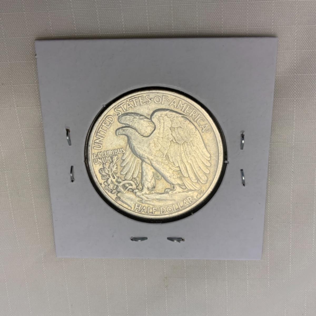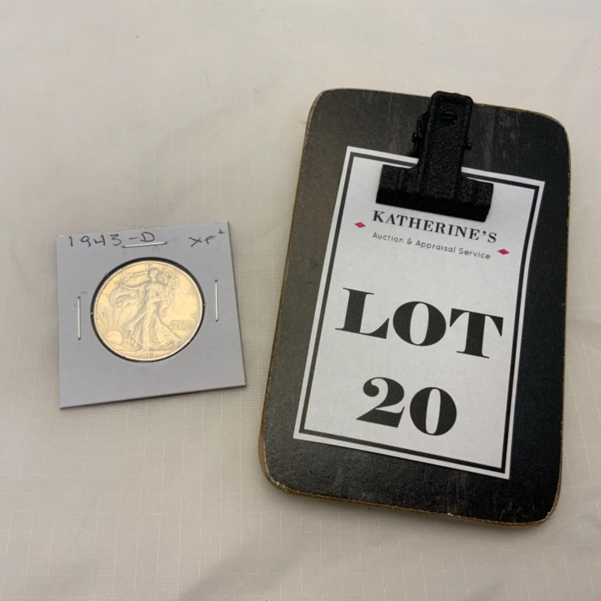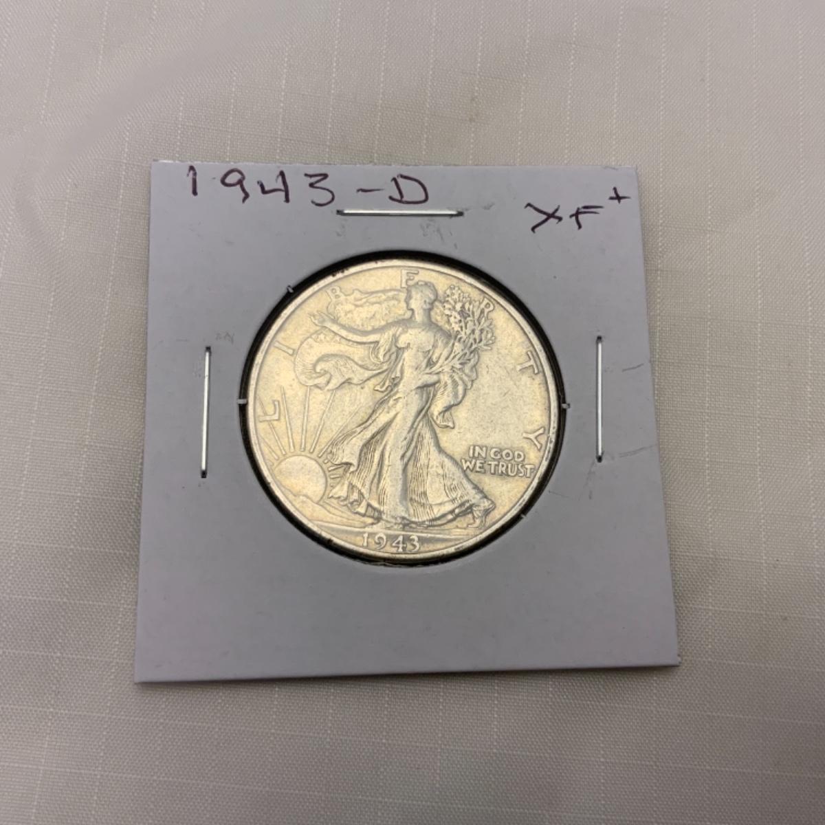 1943 D Walking Liberty Half Dollar. XF+. Silver content is 90%. Please see photos for details and condition. ::: Shipping is available on this lot. If you require shipping you must let us know at the close of the auction. We will coordinate with you after the item has been won. Shipping fees will include insurance up to or exceeding the value of all items being mailed. If you have any questions regarding this lot please contact the auctioneer either via this website, by direct email or by phone. PICK UP TIMES and other important information can be found in the TERMS and DESCRIPTION of the auction. Please take a look for pertinent information. Thanks!