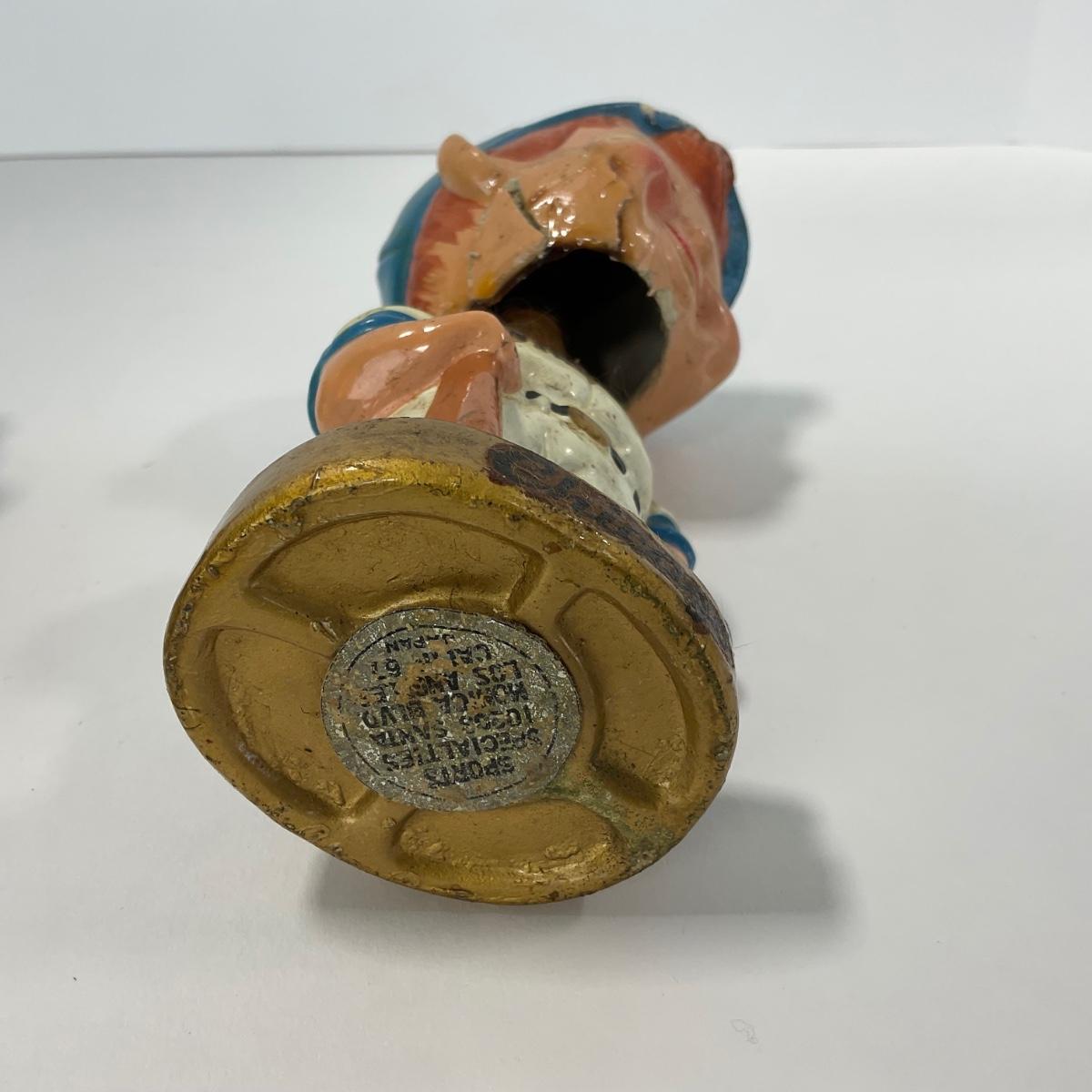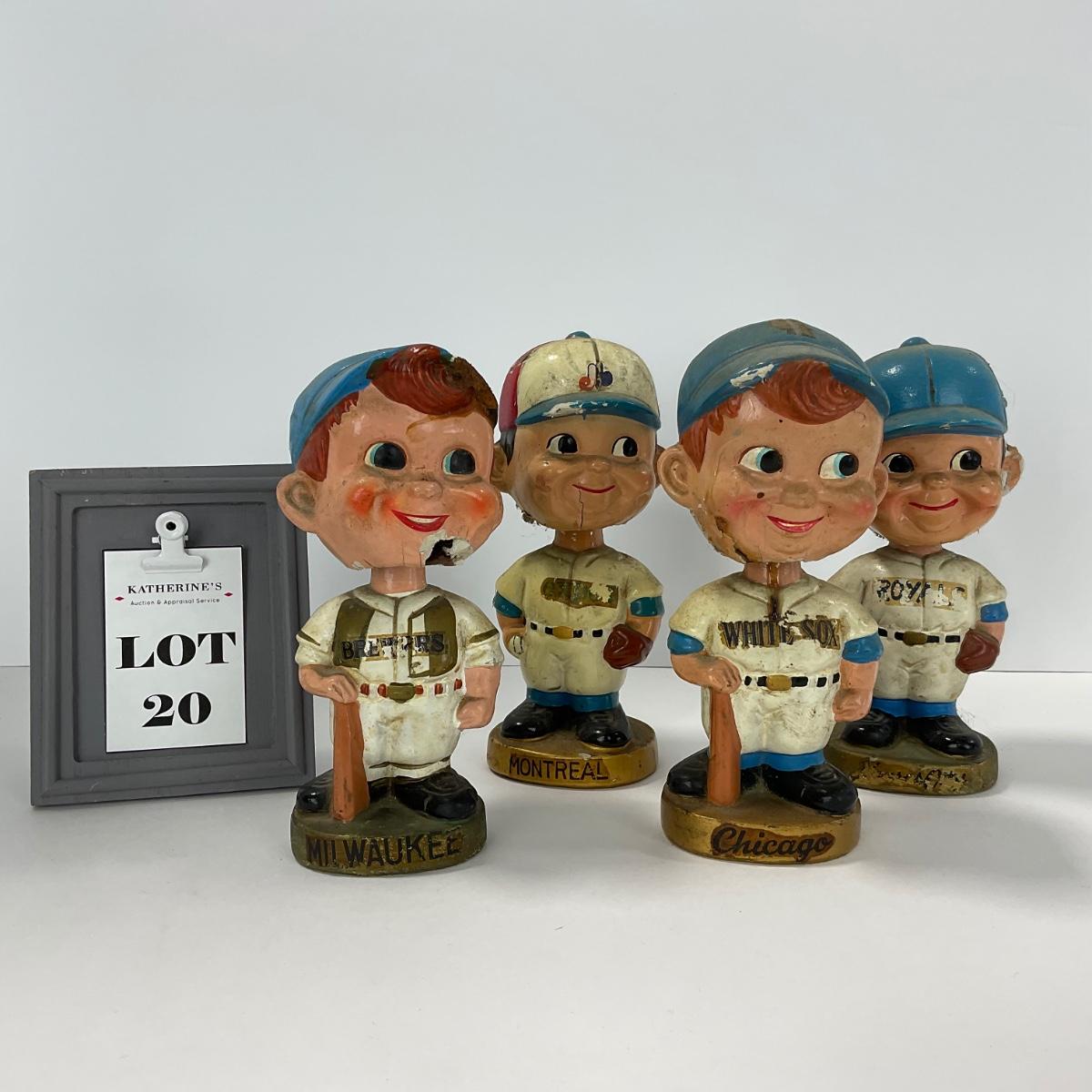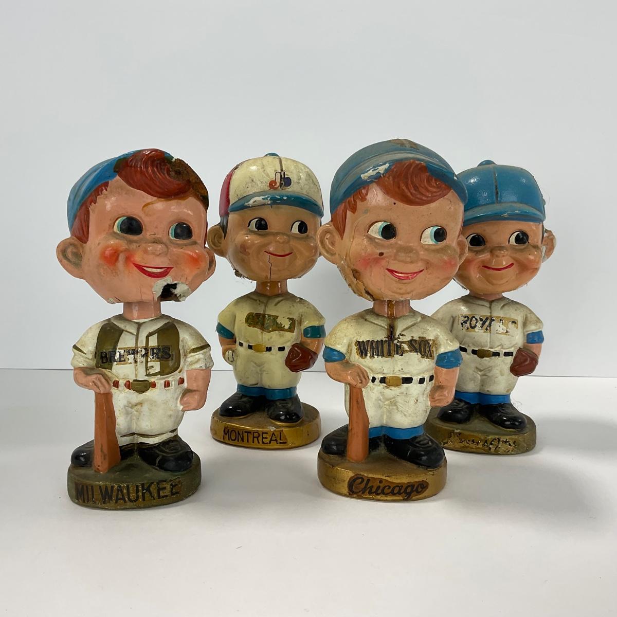Four vintage 1960’s baseball bobbleheads all have a good amount of damage. Bobbleheads include Royals, White Sox’s, Montreal, and Brewers. Please see photos for details and condition. ::: Shipping is available on this lot. If you require shipping you must let us know at the close of the auction. We will coordinate with you after the item has been won. Shipping fees will include insurance up to or exceeding the value of all items being mailed. If you have any questions regarding this lot please contact the auctioneer either via this website, by direct email or by phone. PICK UP TIMES and other important information can be found in the TERMS and DESCRIPTION of the auction. Please take a look for pertinent information. Thanks!