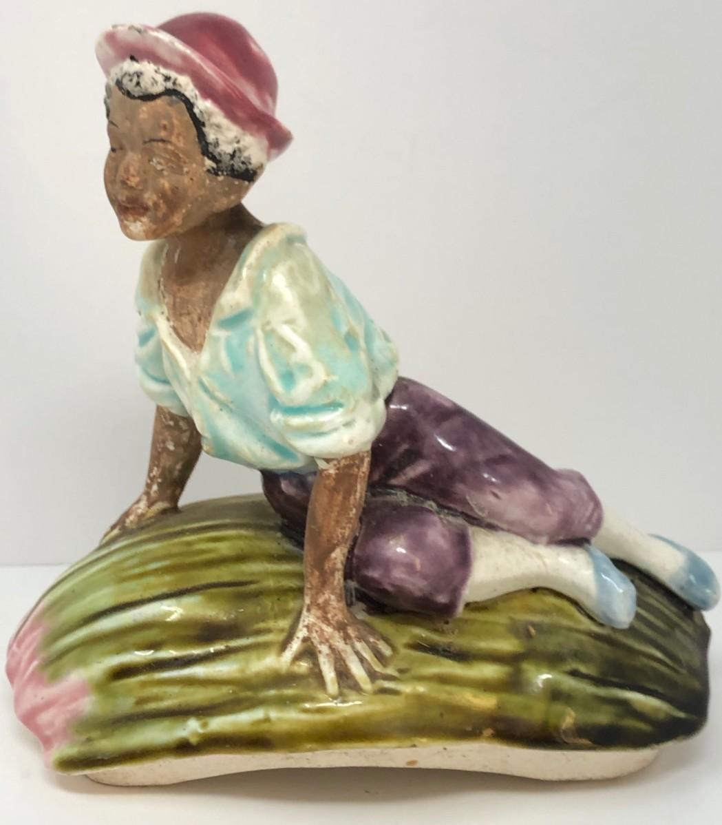 Description: 20TH Century Folk art Majolica young boy Figurine; Measurement approximate: 5"h x 6"l; Material: Porcelain