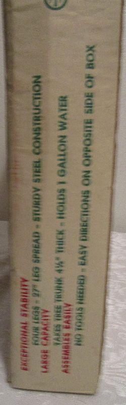 Four Legs- 27" Leg spread, takes tree trunk up to 4.5" thick; holds 1 gallon of water; assembles easily, no tools needed; Model number 401