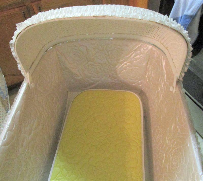Bassinet has wicker hood, mattress, legs, and large wooden wheels (easy to wheel back and forth on carpet). Built heavy duty. Interior is white vinyl with rose design. It has plastic lace around the edges. The length is 34", width is 20", the sides of the bassinet are 12" high. The bassinet is 28" from the floor to the top of the bassinet sides