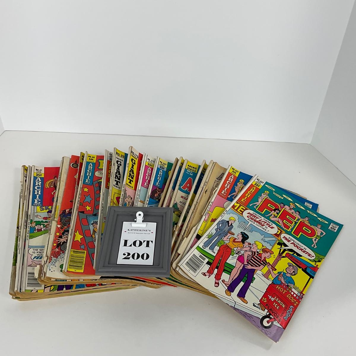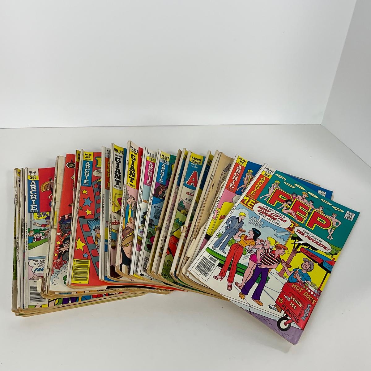 Over 25 vintage Comics both Pep and Archie. Some of these comics have a good amount of damage on them. Please see photos for details and condition. ::: Shipping is available on this lot. If you require shipping you must let us know at the close of the auction. We will coordinate with you after the item has been won. Shipping fees will include insurance up to or exceeding the value of all items being mailed. If you have any questions regarding this lot please contact the auctioneer either via this website, by direct email or by phone. PICK UP TIMES and other important information can be found in the TERMS and DESCRIPTION of the auction. Please take a look for pertinent information. Thanks!