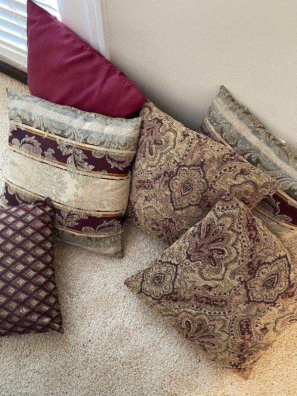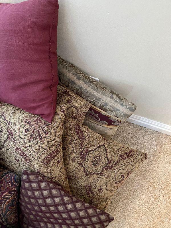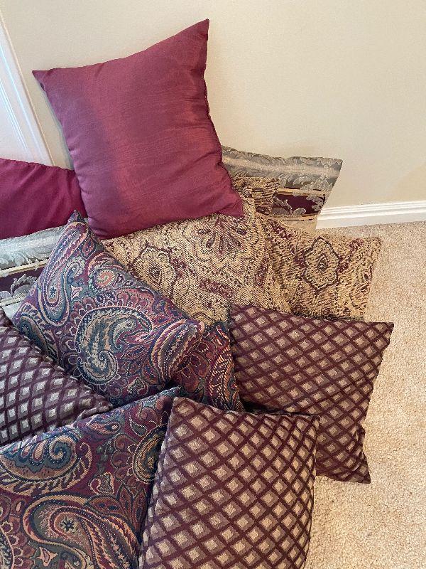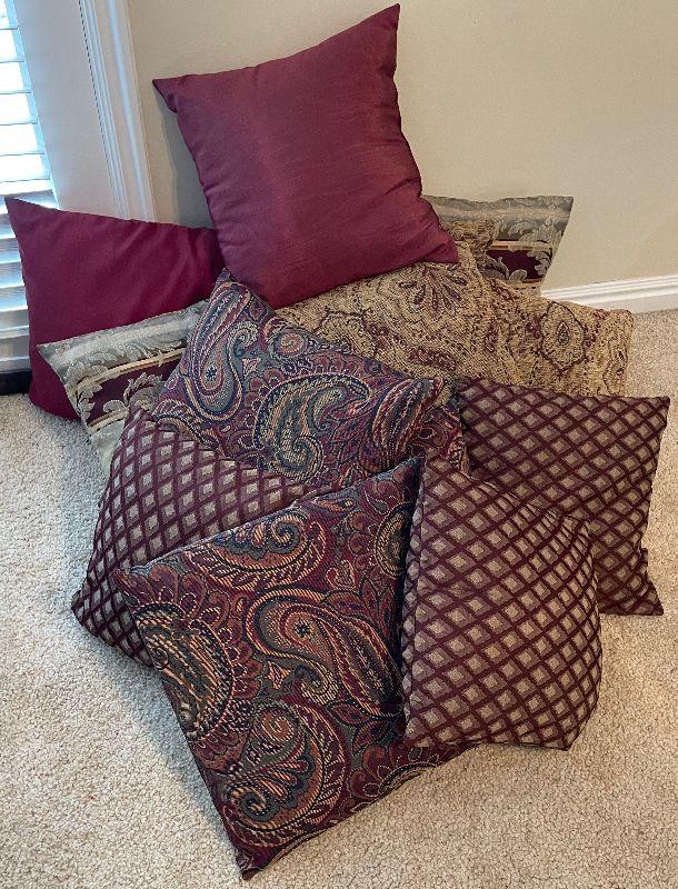 #200 Large Pile of Throw Pillows Mostly Maroon Color