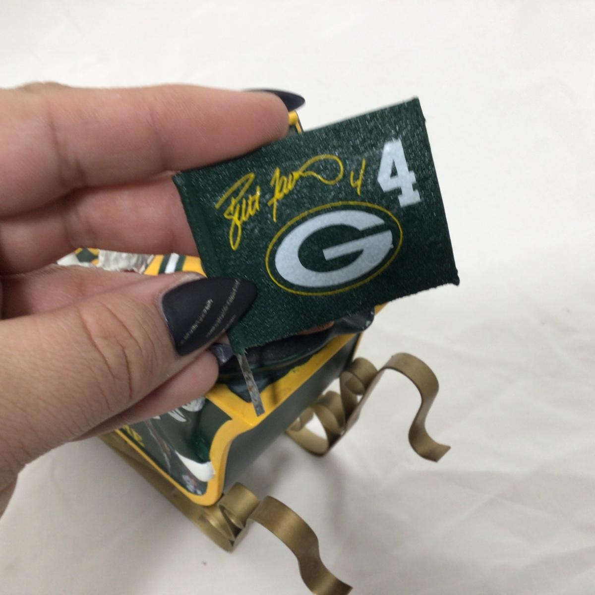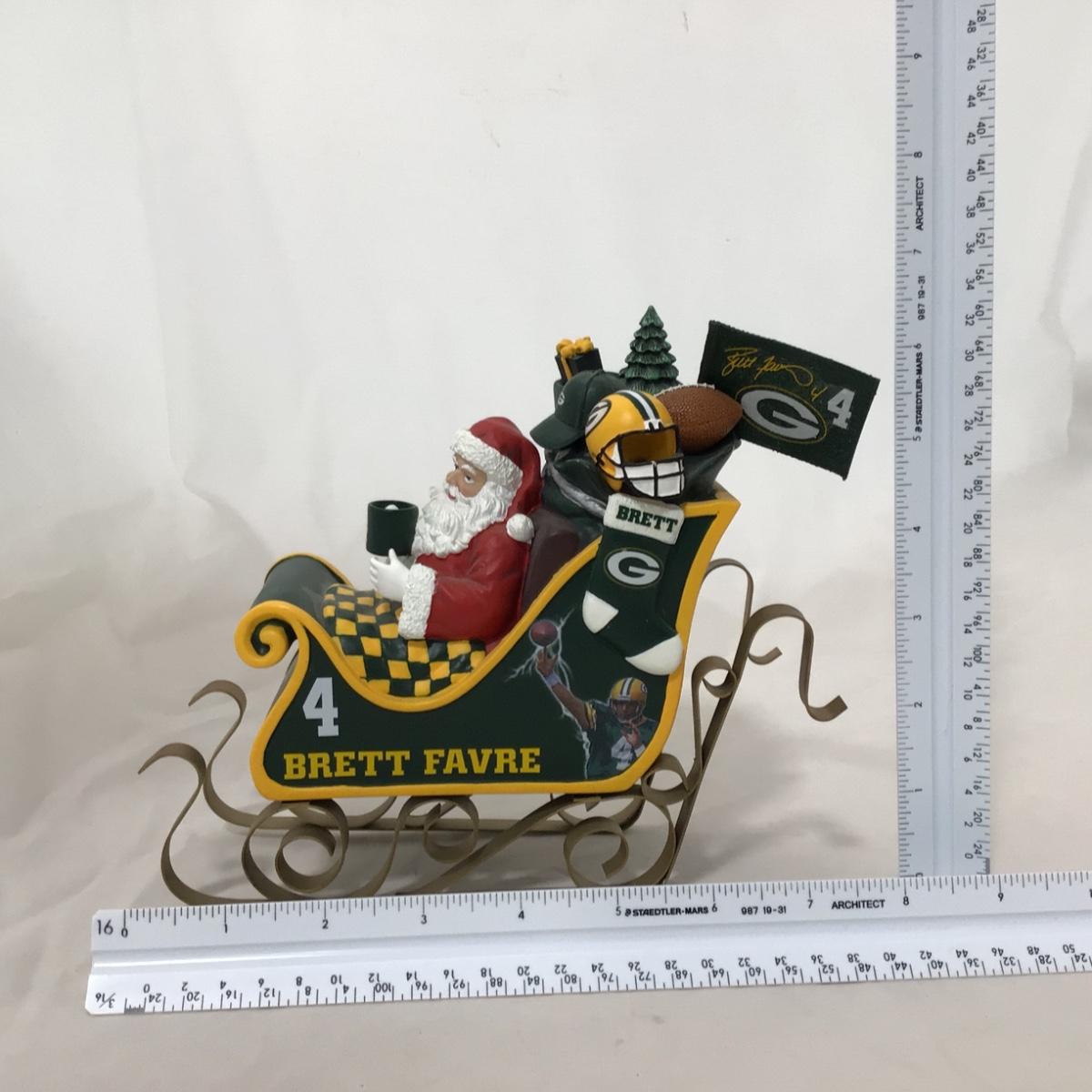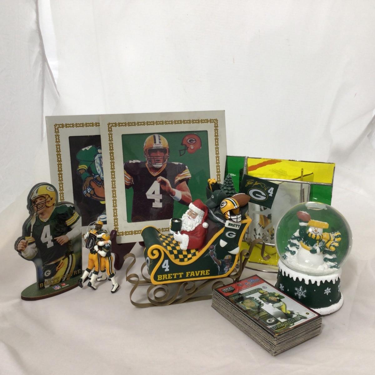 Packers and Brett Favre themed miscellaneous items including an ornament, Santa in sleigh, snow globe, Favre pictures, magnets, standup, and glass decorative piece. Please see photos for details and condition. ::: Shipping is available on this lot. If you require shipping you must let us know at the close of the auction. We will coordinate with you after the item has been won. Shipping fees will include insurance up to or exceeding the value of all items being mailed. If you have any questions regarding this lot please contact the auctioneer either via this website, by direct email or by phone. PICK UP TIMES and other important information can be found in the TERMS and DESCRIPTION of the auction. Please take a look for pertinent information. Thanks!