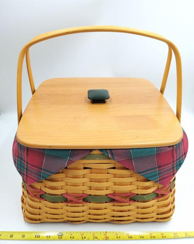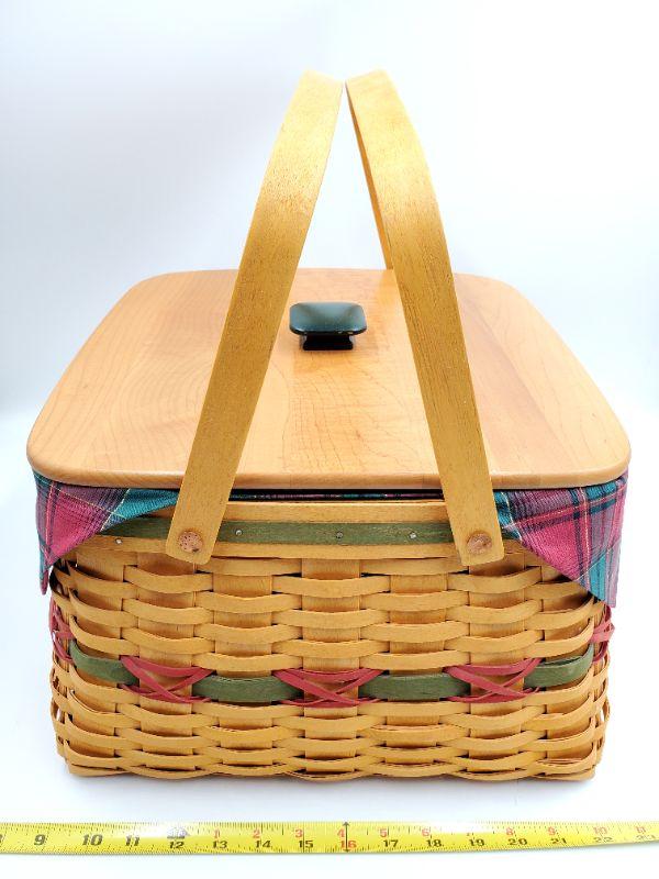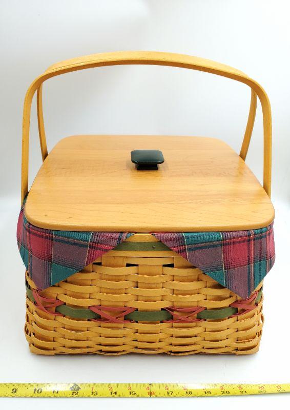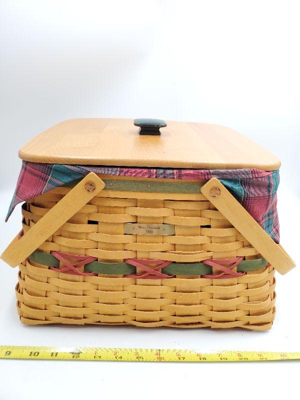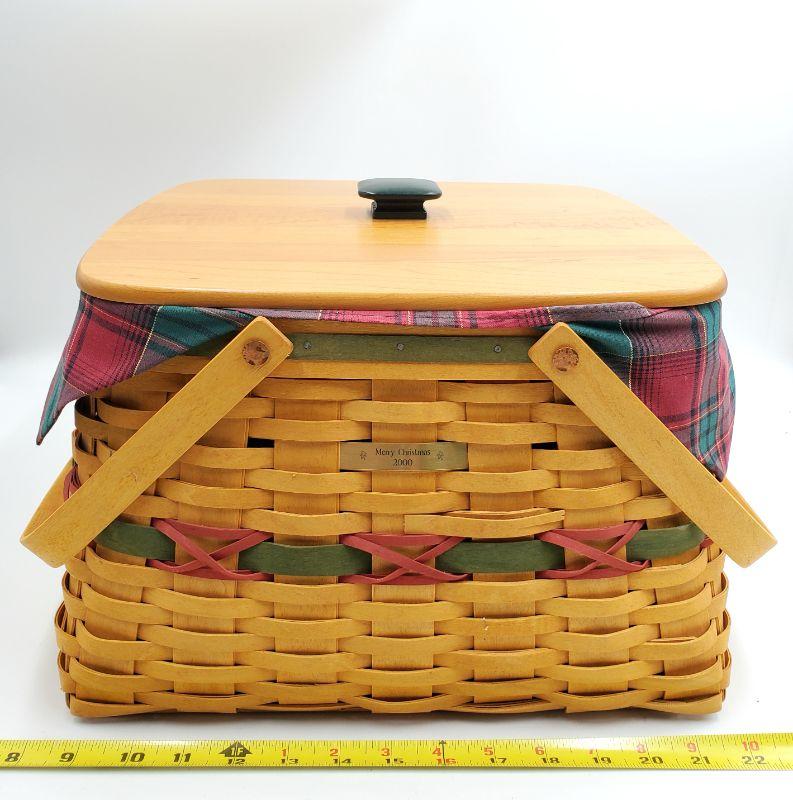 Handles for easy travel and a pretty red and green cloth liner..Basket lid does have a few small chips in the green paint but otherwise good condition! Perfect for a basket of Christmas goodies!
