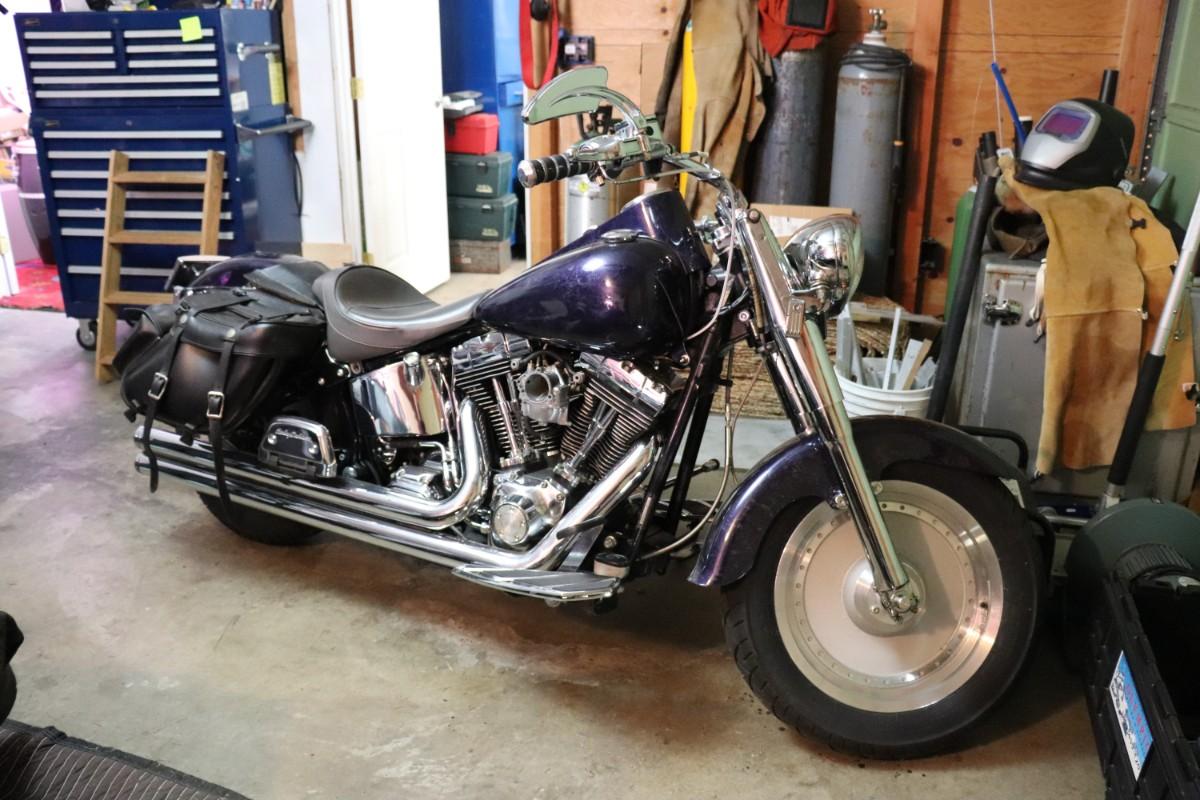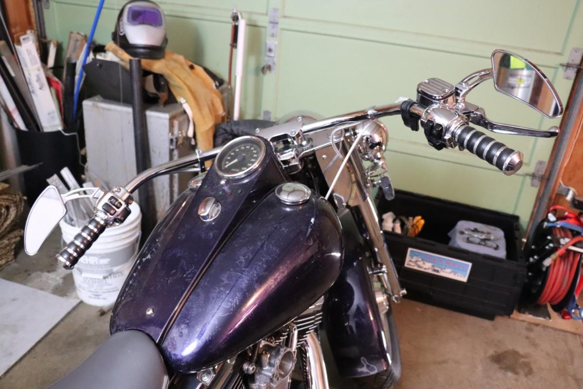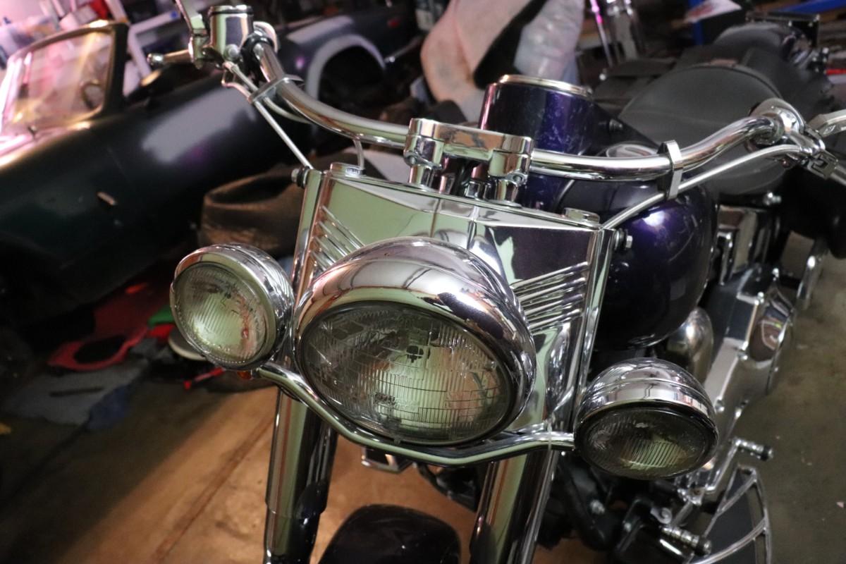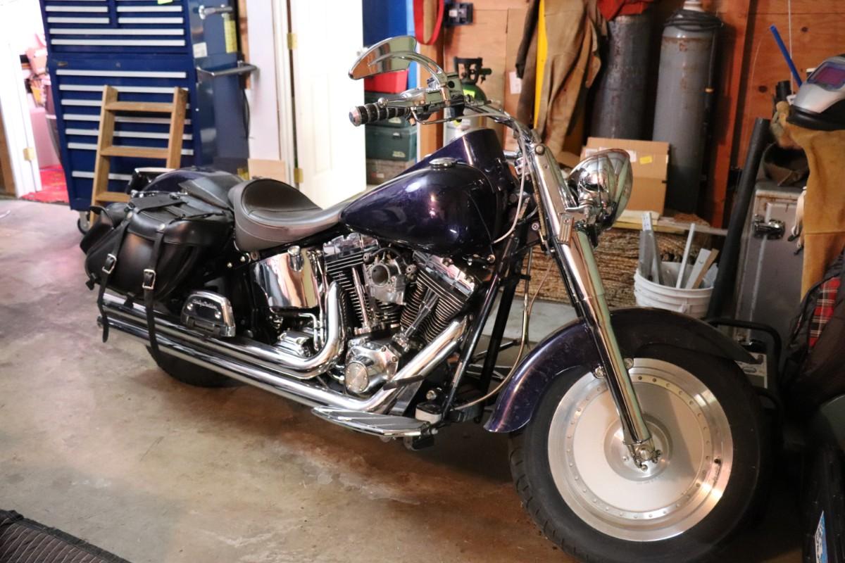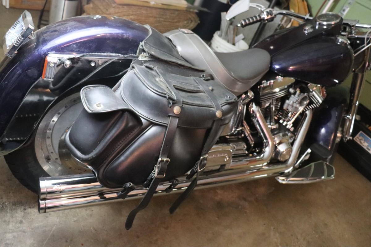 2000 Harley Davidson Softail Cruiser Motorcycle in a deep blue purple paint color with chrome finishes and black leather saddlebags. Due to potential risks of damage from old fuel etc, we did not attempt to start this bike. Pre-bidding inspection is encouraged. Motorcycle has title. Vin number 1HD1BMY12YY026680. We will post updates on the bike tomorrow prior to close of auction. - update: mileage 44,827. No oil, some gas.