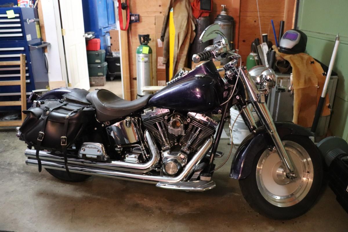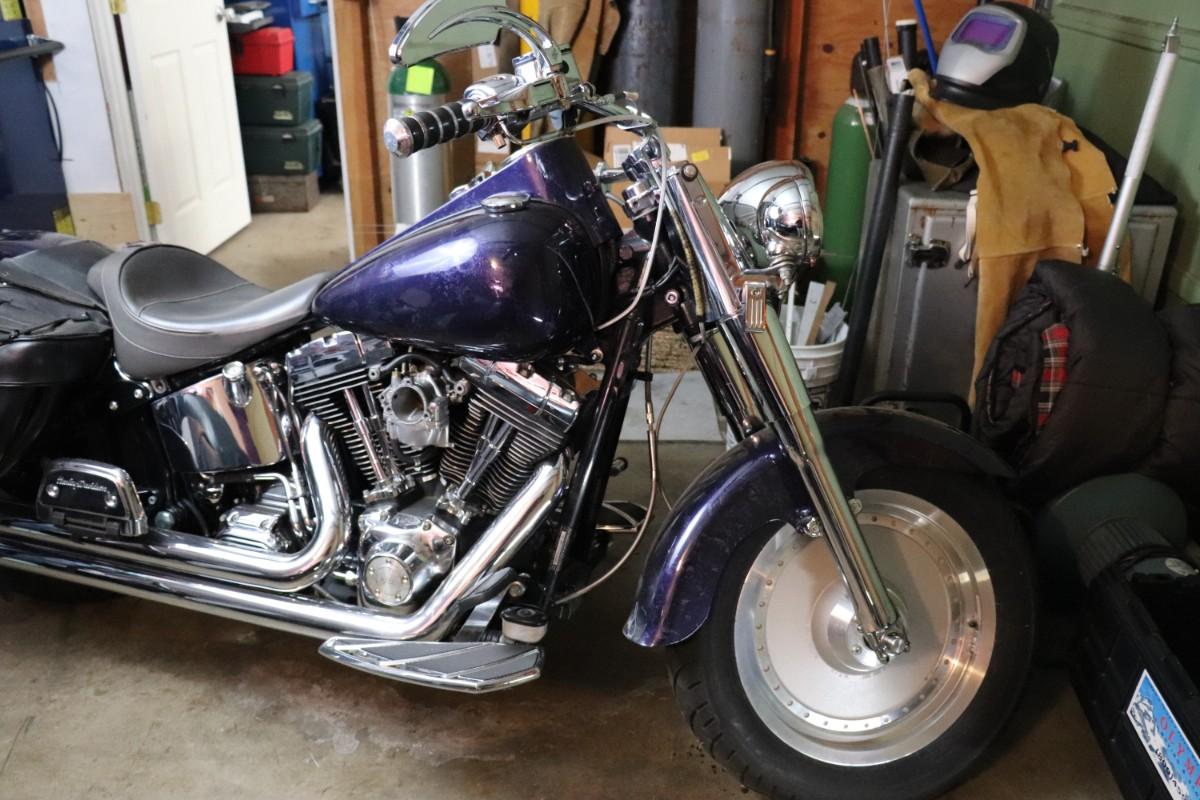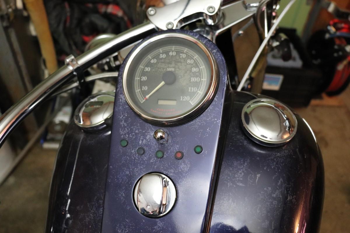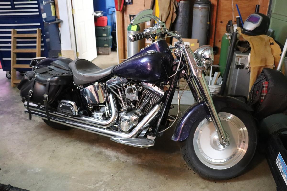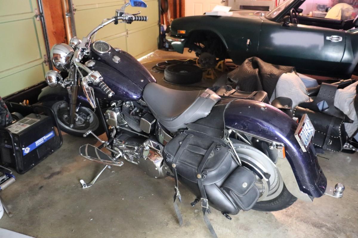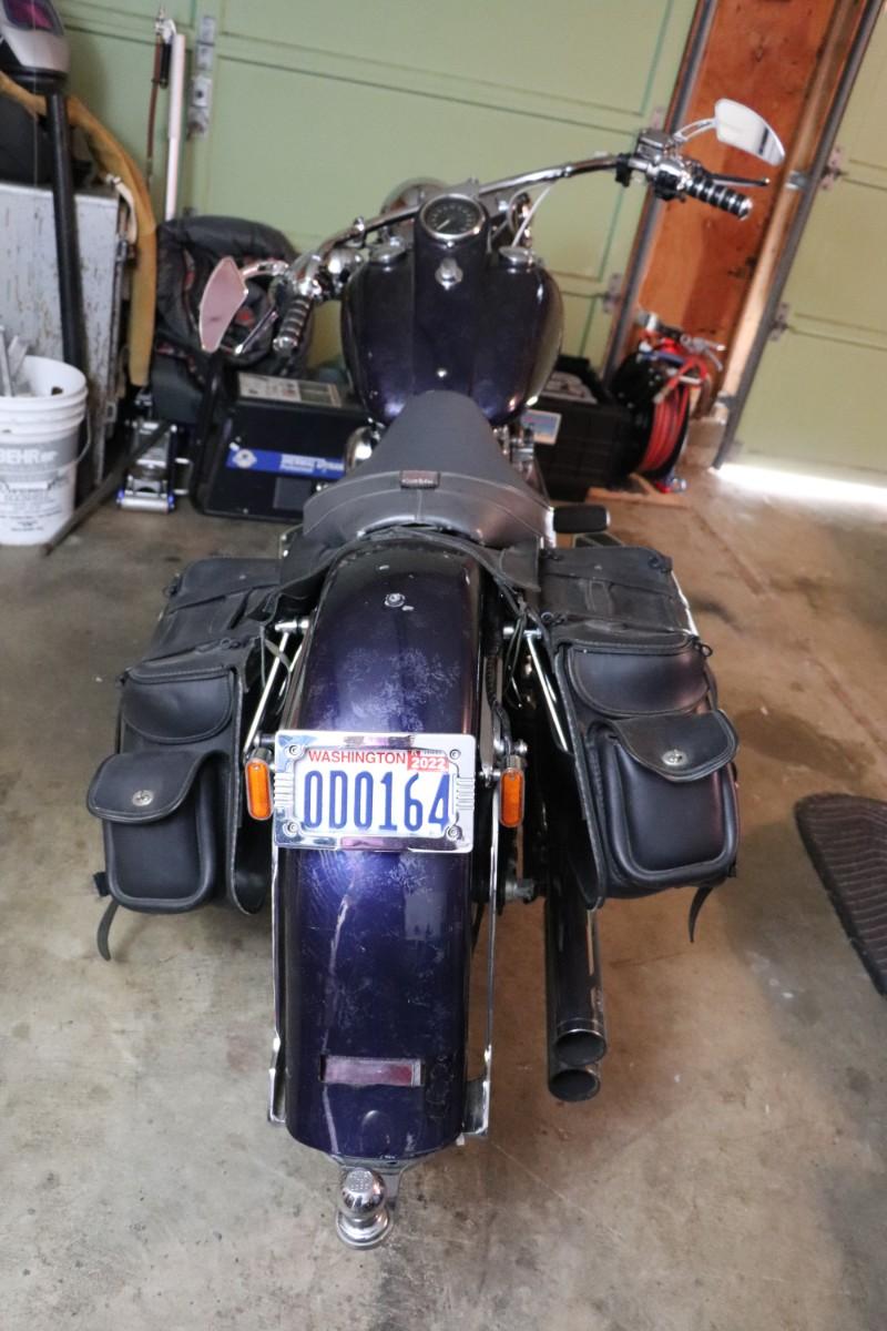 2000 Harley Davidson Softail Cruiser Motorcycle in a deep blue purple paint color with chrome finishes and black leather saddlebags. Due to potential risks of damage from old fuel etc, we did not attempt to start this bike. Pre-bidding inspection is encouraged. Motorcycle has title. Vin number 1HD1BMY12YY026680. We will post updates on the bike tomorrow prior to close of auction. - update: mileage 44,827. No oil, some gas.