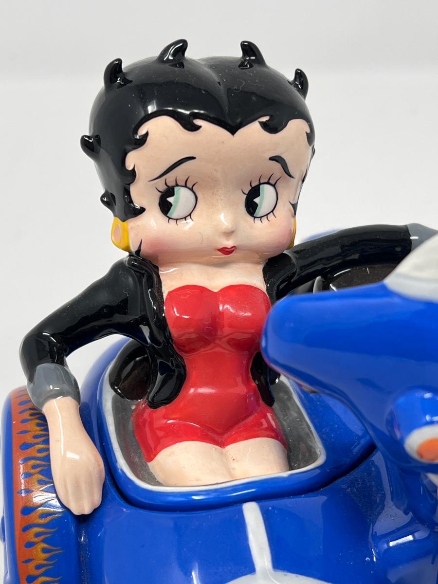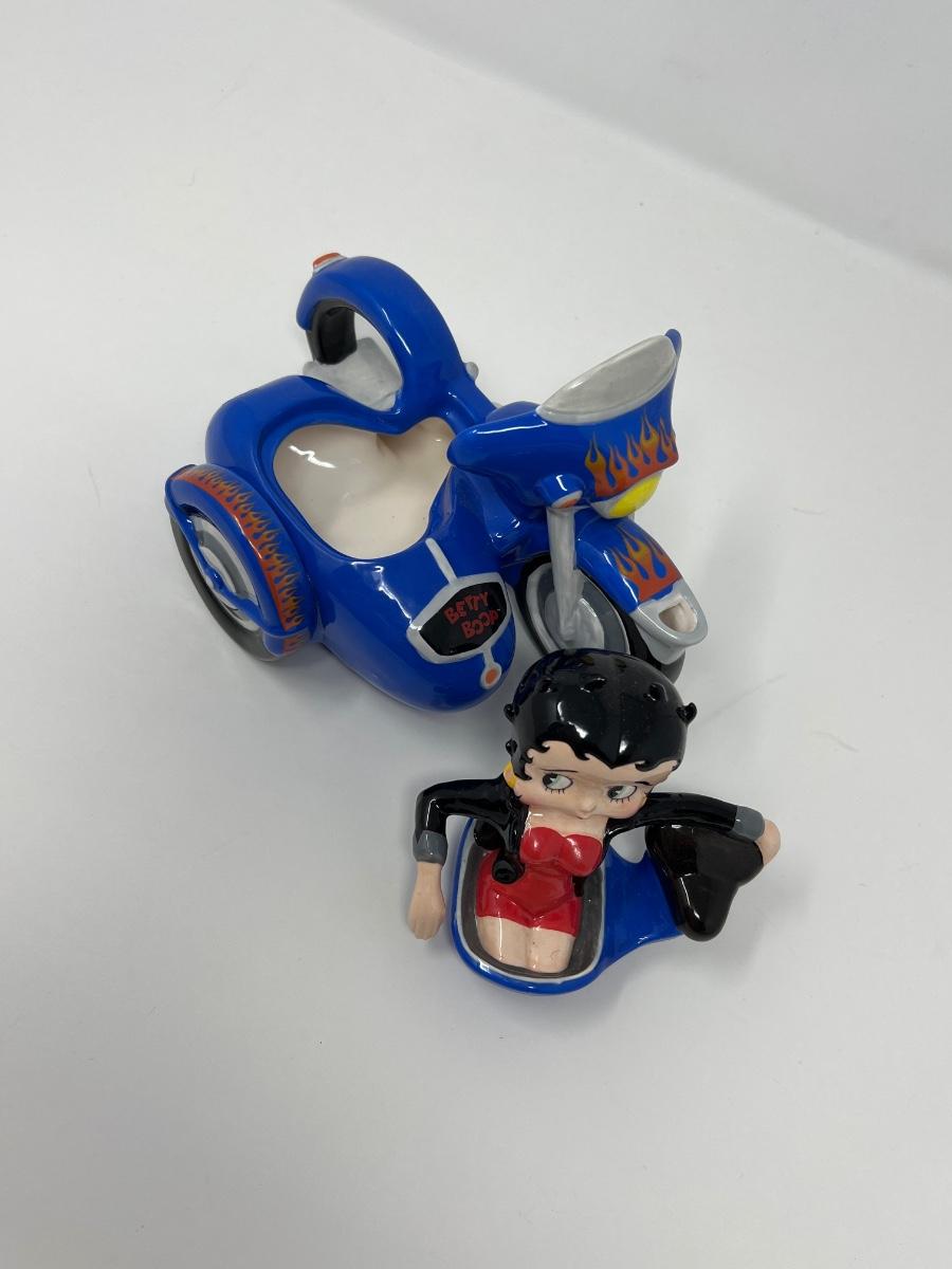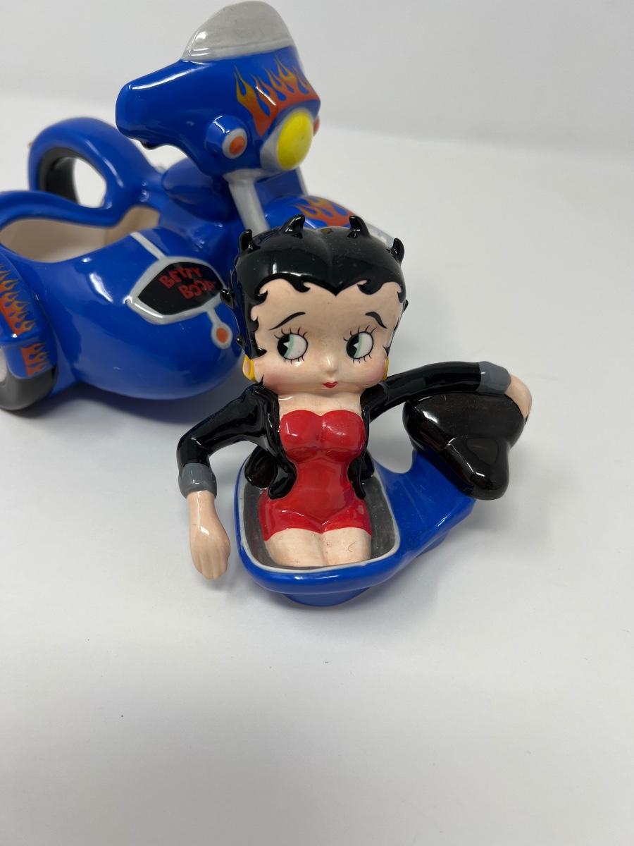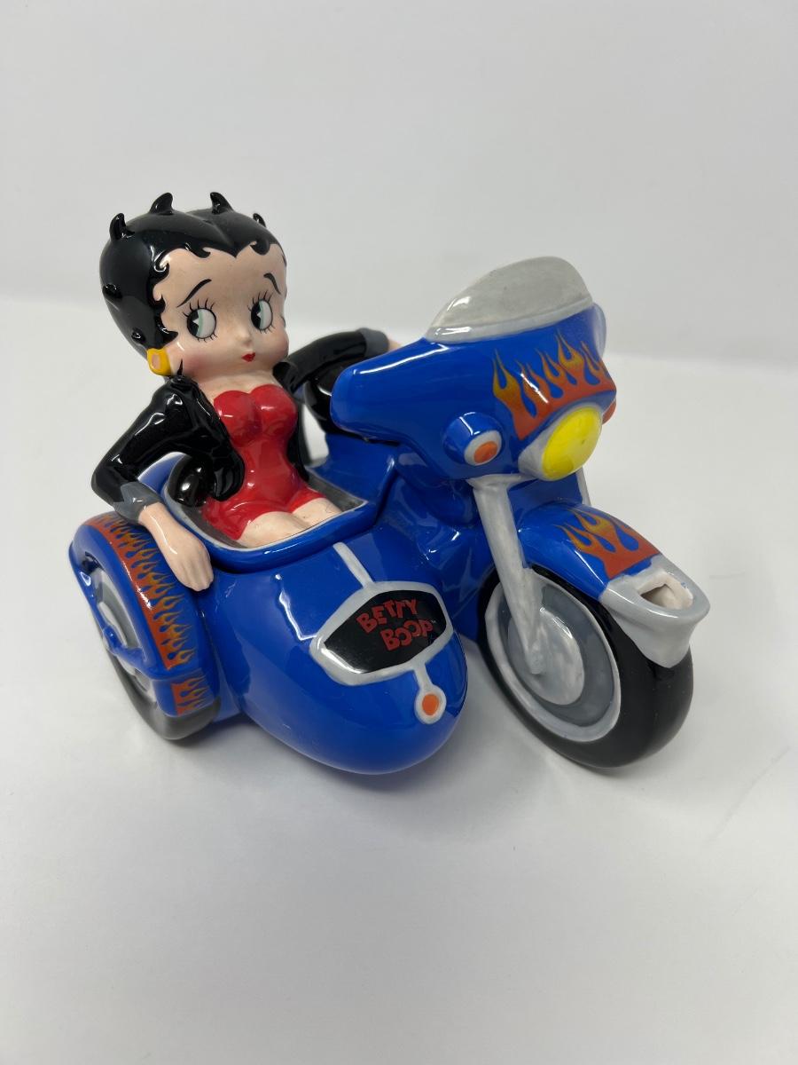 Betty Boop motorcycle teapot. Betty is the lid. Liquid pours out spout in upper front tire, and back tire is hollow to fo the handle. Like new with signs of normal wear from display and shelf life.