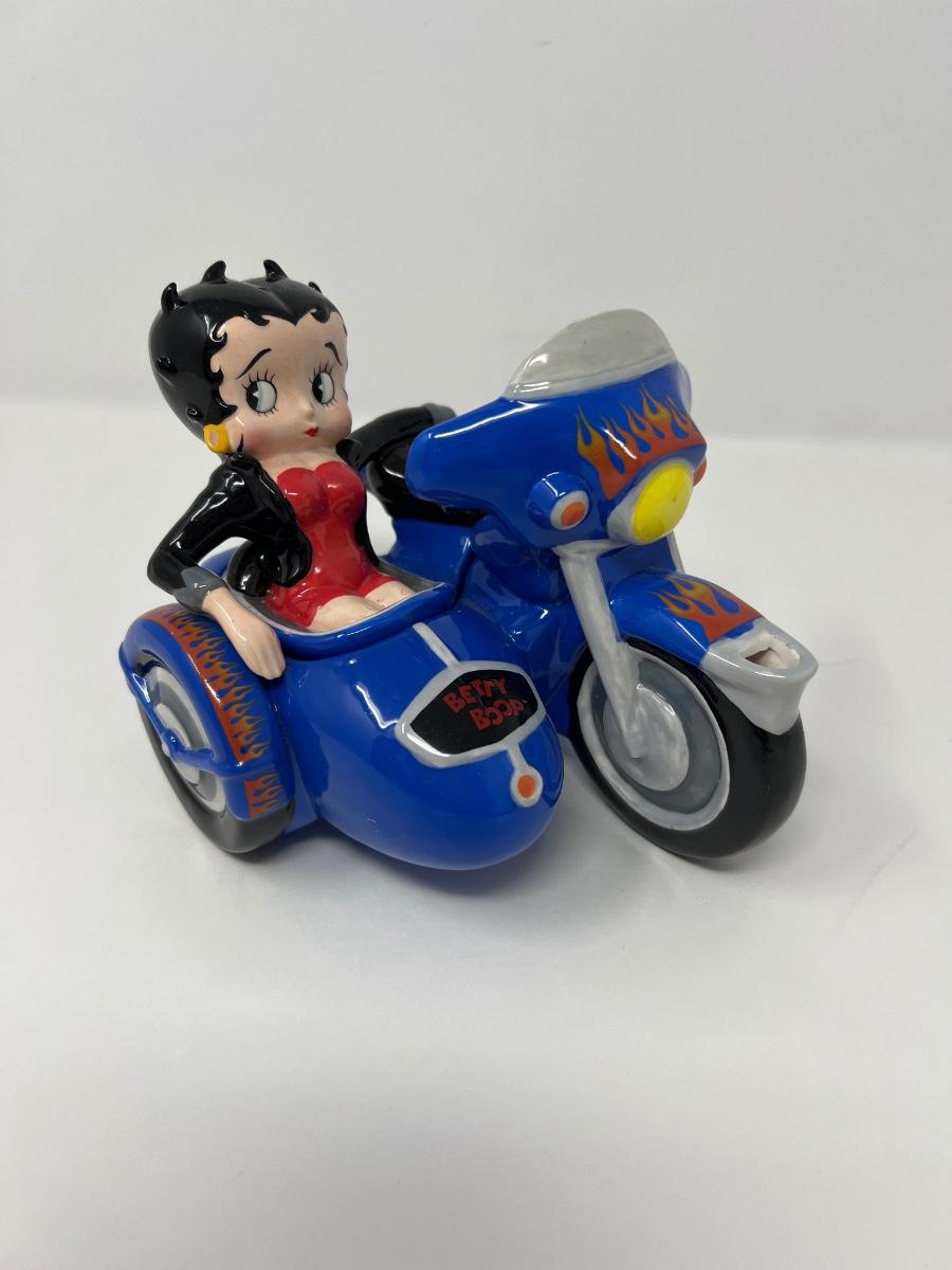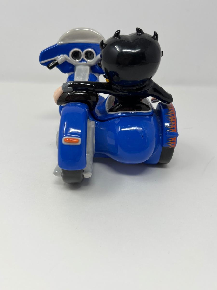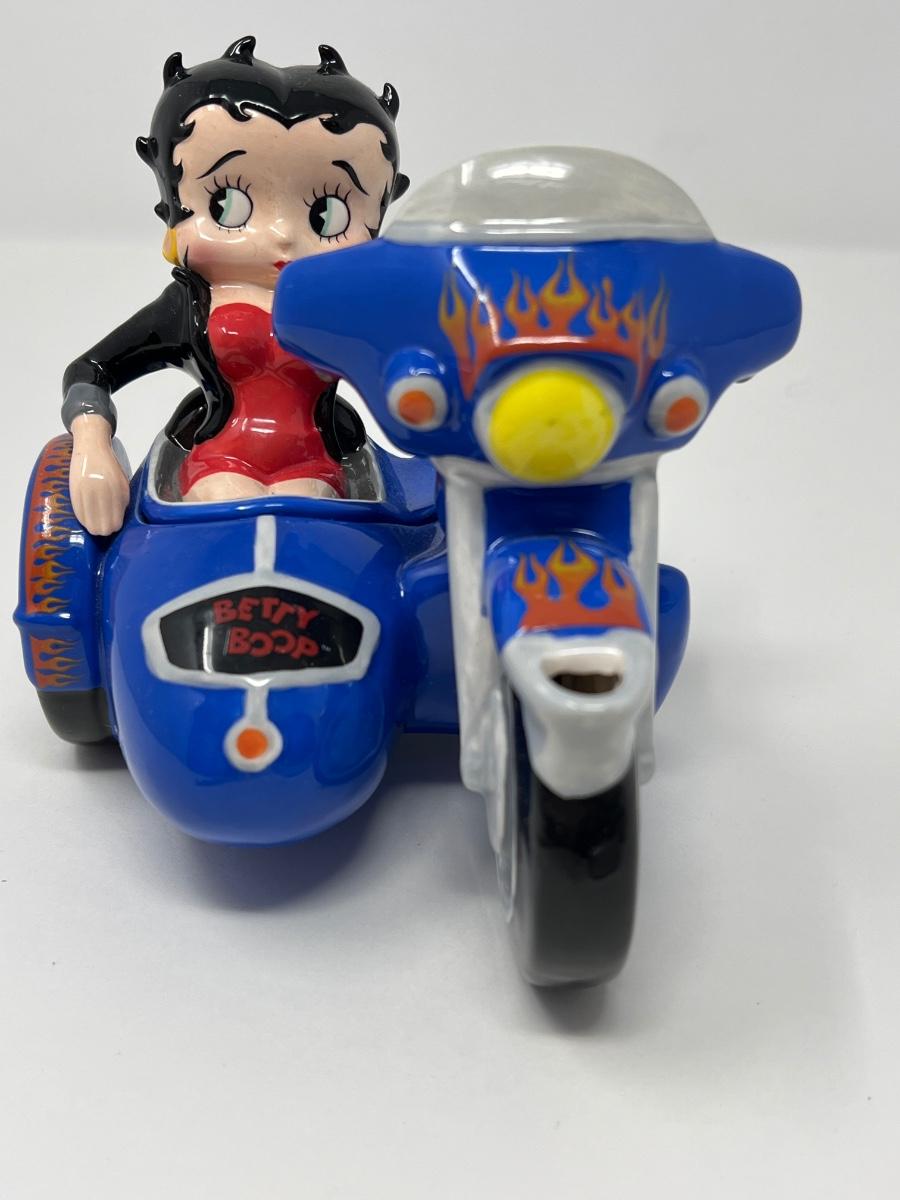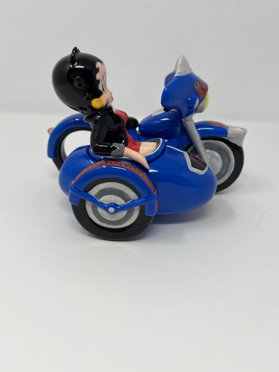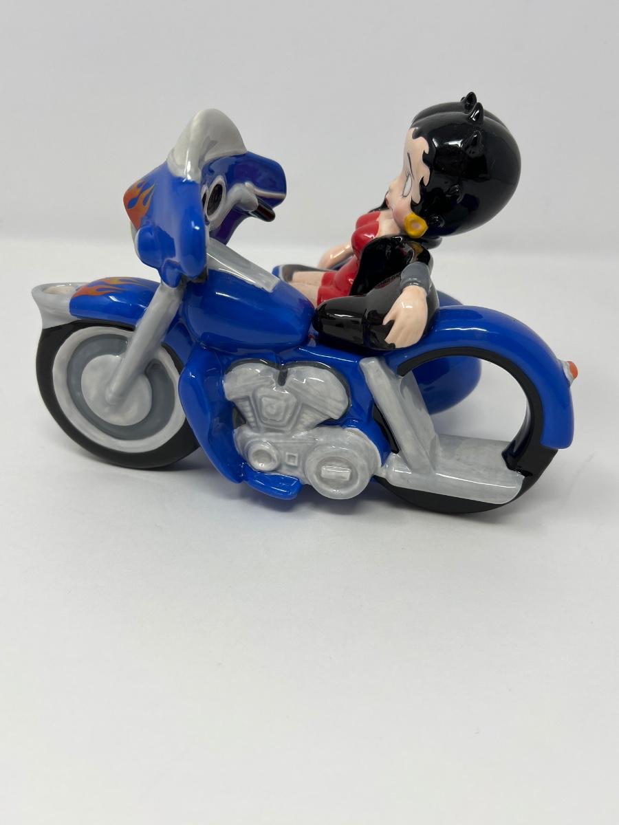 Betty Boop motorcycle teapot. Betty is the lid. Liquid pours out spout in upper front tire, and back tire is hollow to fo the handle. Like new with signs of normal wear from display and shelf life.