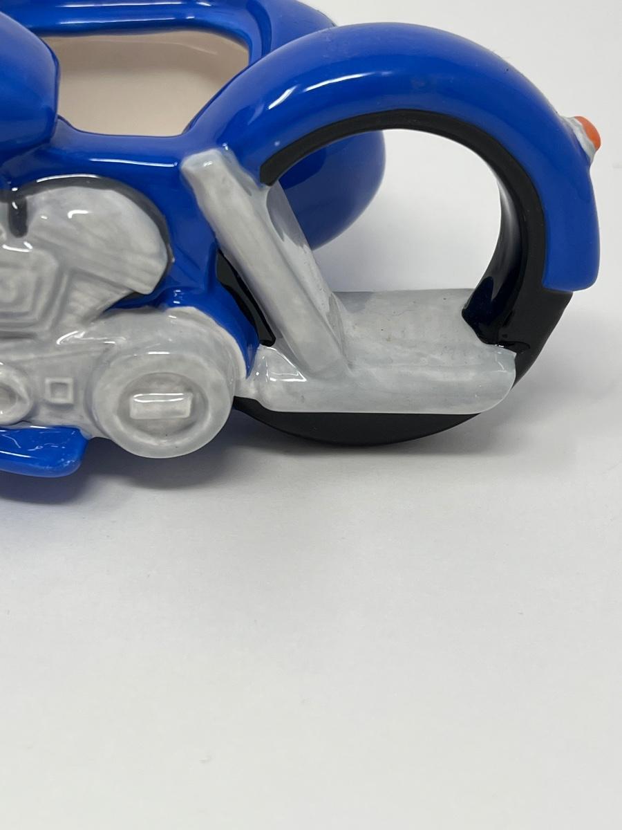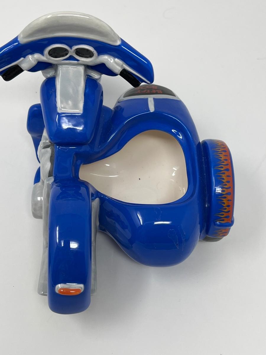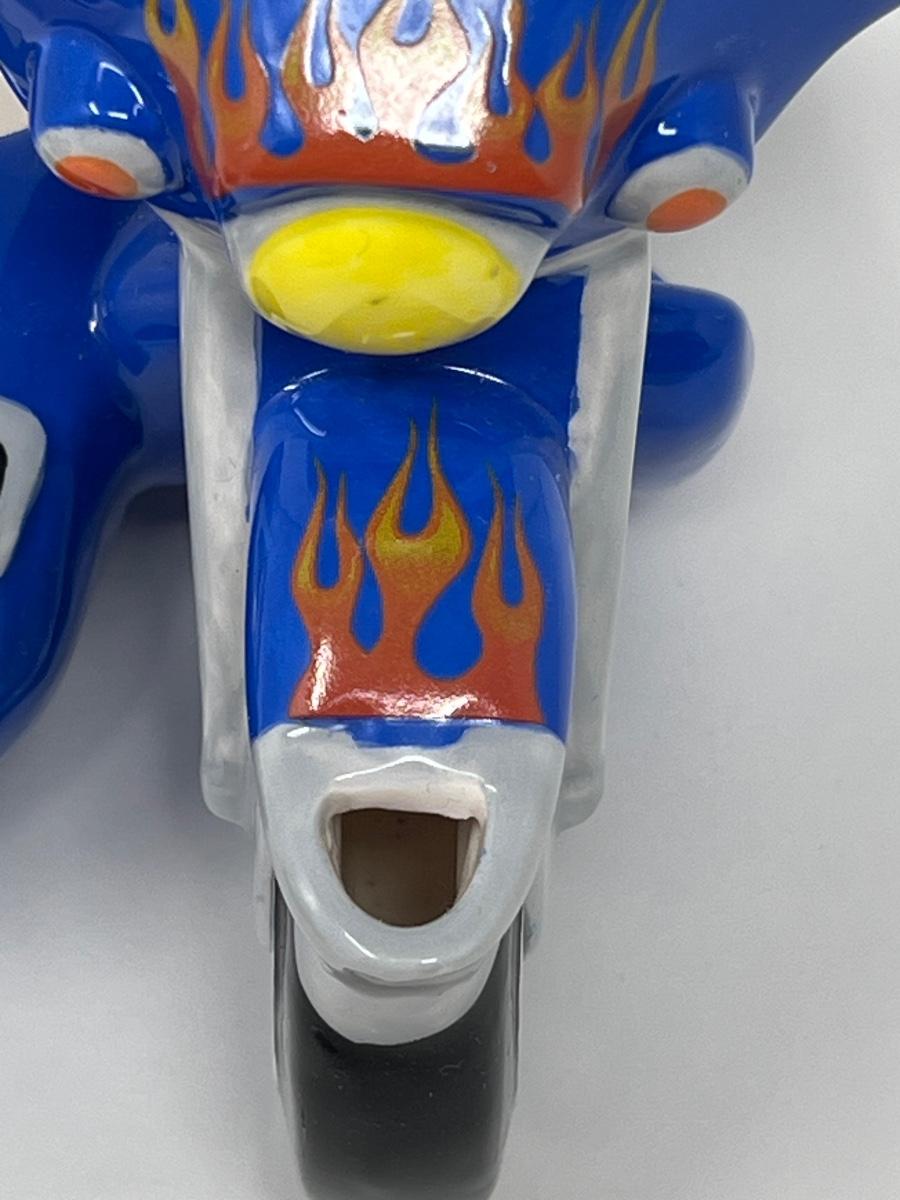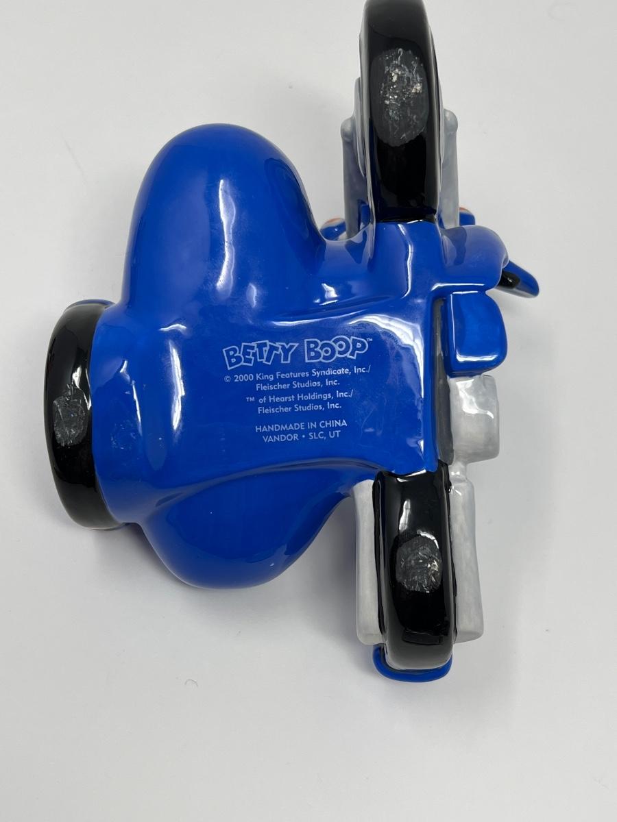 Betty Boop motorcycle teapot. Betty is the lid. Liquid pours out spout in upper front tire, and back tire is hollow to fo the handle. Like new with signs of normal wear from display and shelf life.