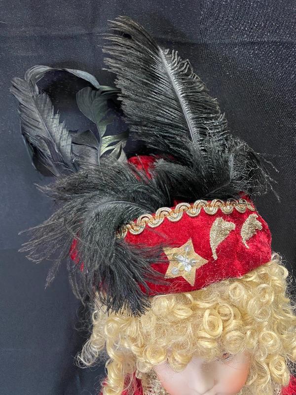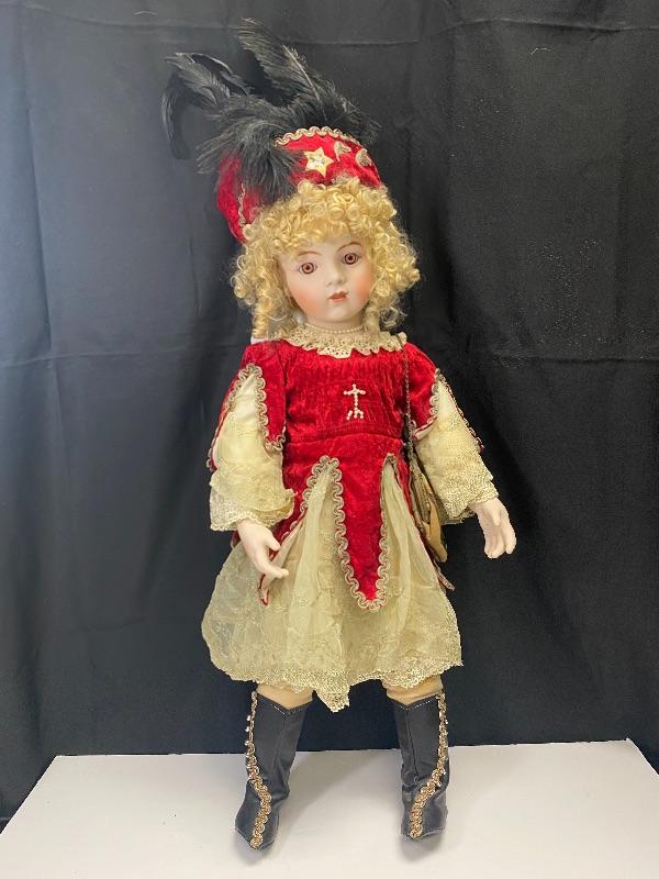 Beautiful limited edition 2001 Patricia Loveless doll. Reproduction Bru Jumeau head. Blonde ringlets, mesmerizing copper eyes. Dressed in a Russian Cossack style outfit and hat. #254/2000. In good condition. Previous owner added an antique tapestry purse to the doll, could not find any marks on it, there is slight discolor though.