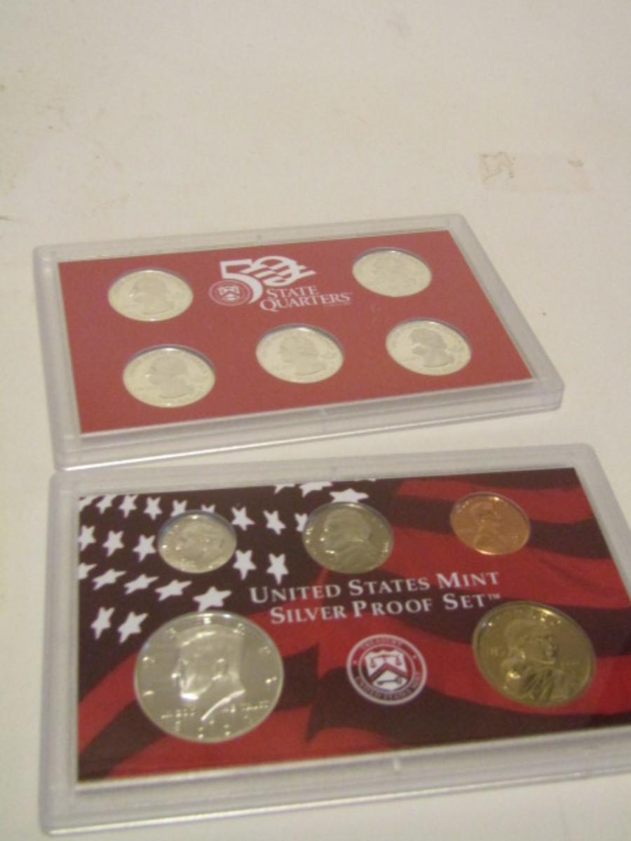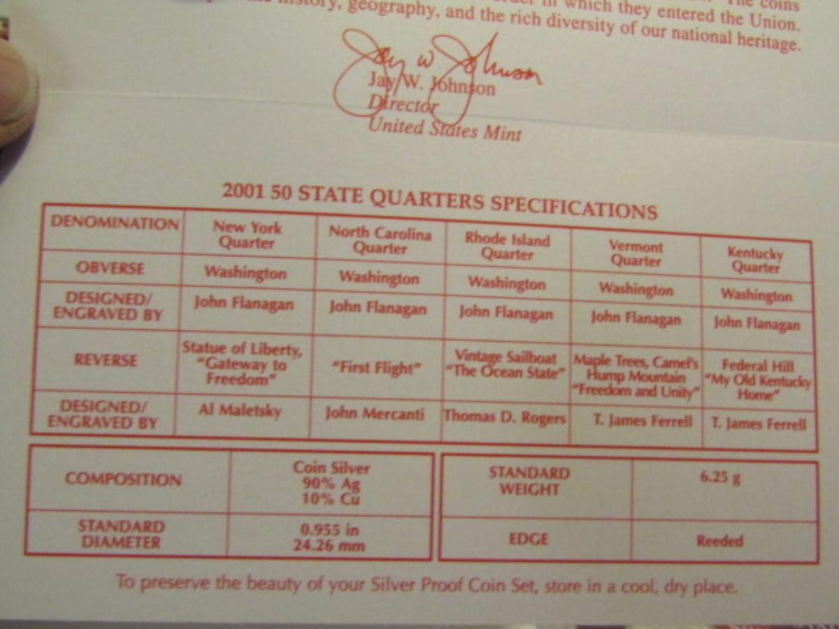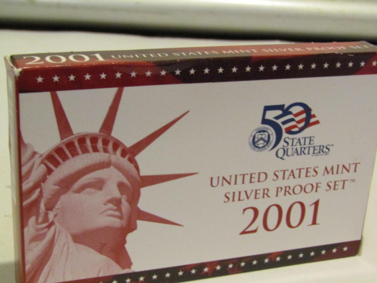 2001 US Mint Silver Proof Set- 5 State Quarters, Penny, Nickle, Dime, Half Dollar. Choice A. Please see all pictures for description of sterling silver content.